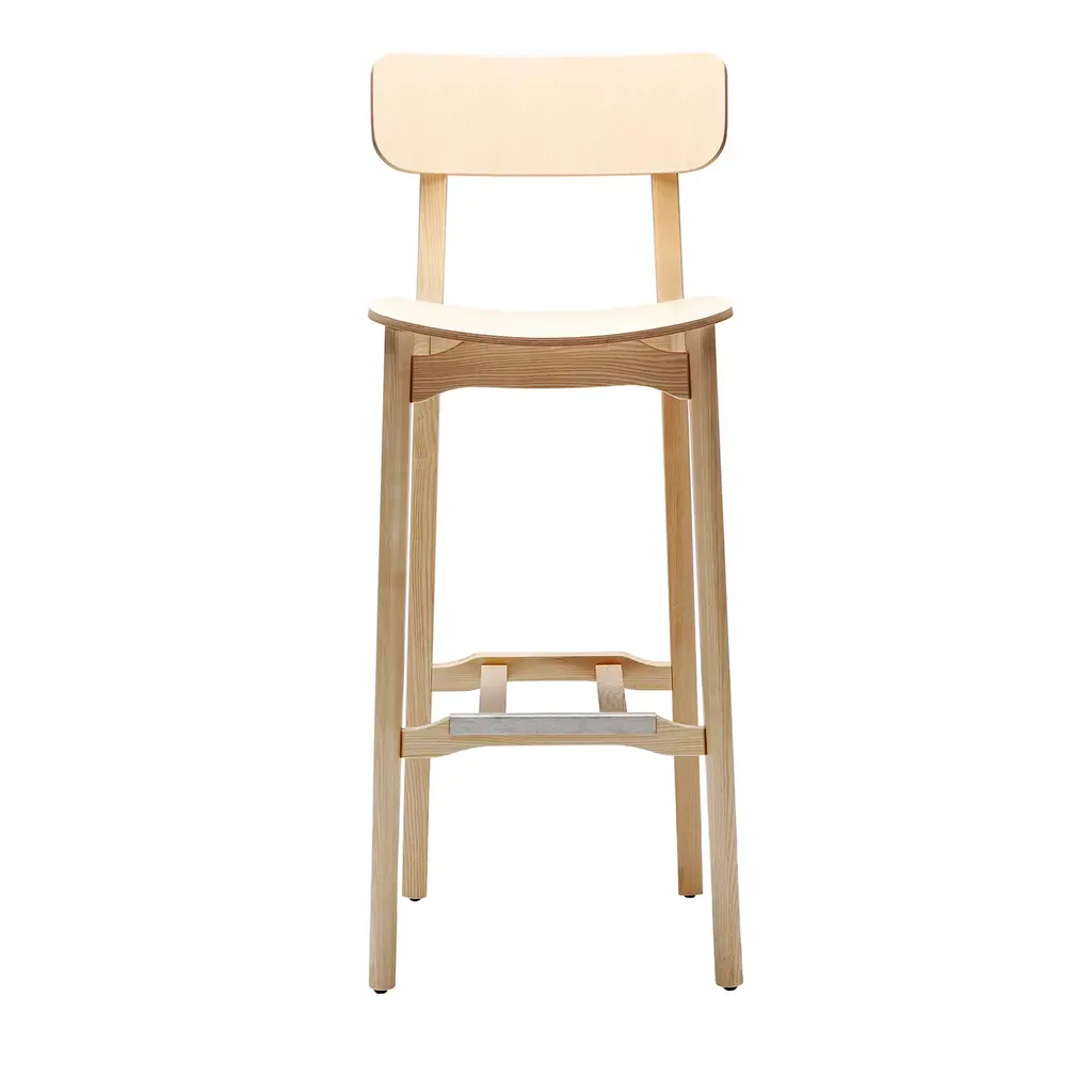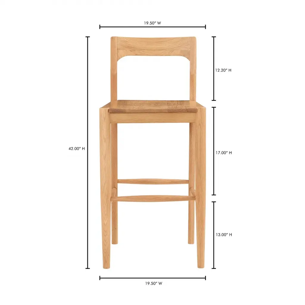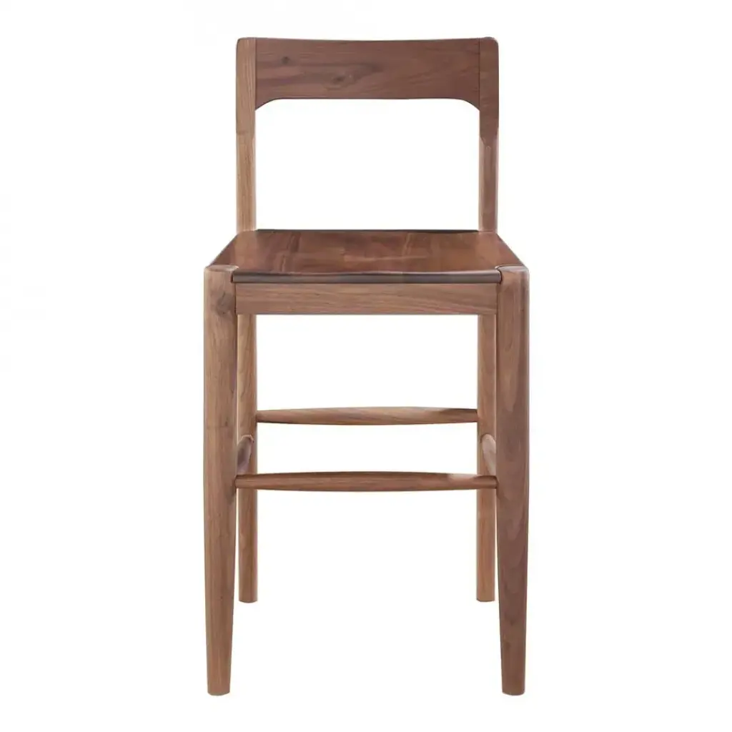 Available in oak, the Owing counter stool is a refined spin on the traditional. Its mid-height, curved, open-back design combines comfort with casual appeal, while its solid wood frame creates a timeless, mid-century silhouette.