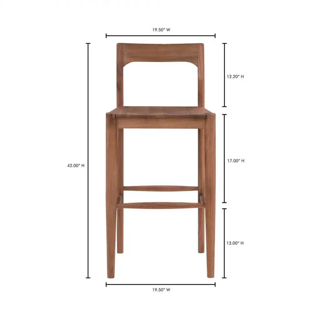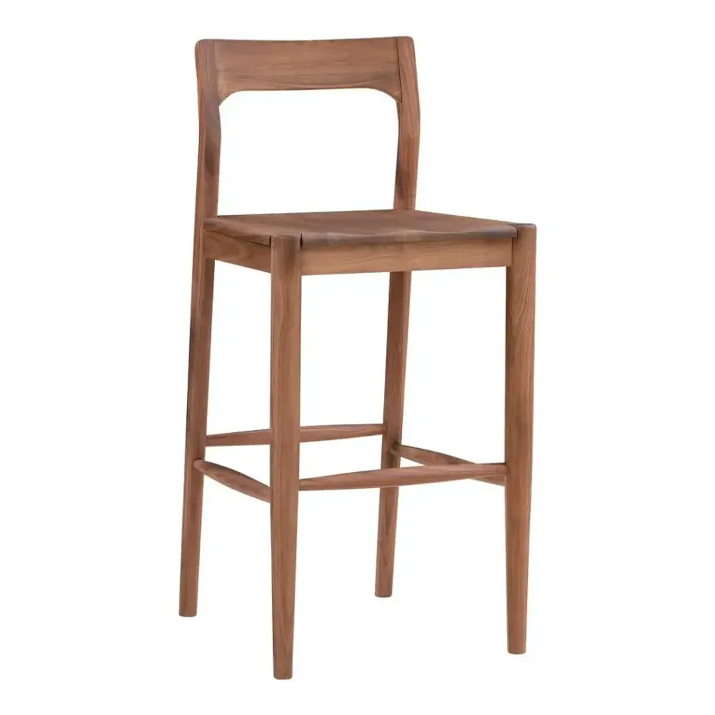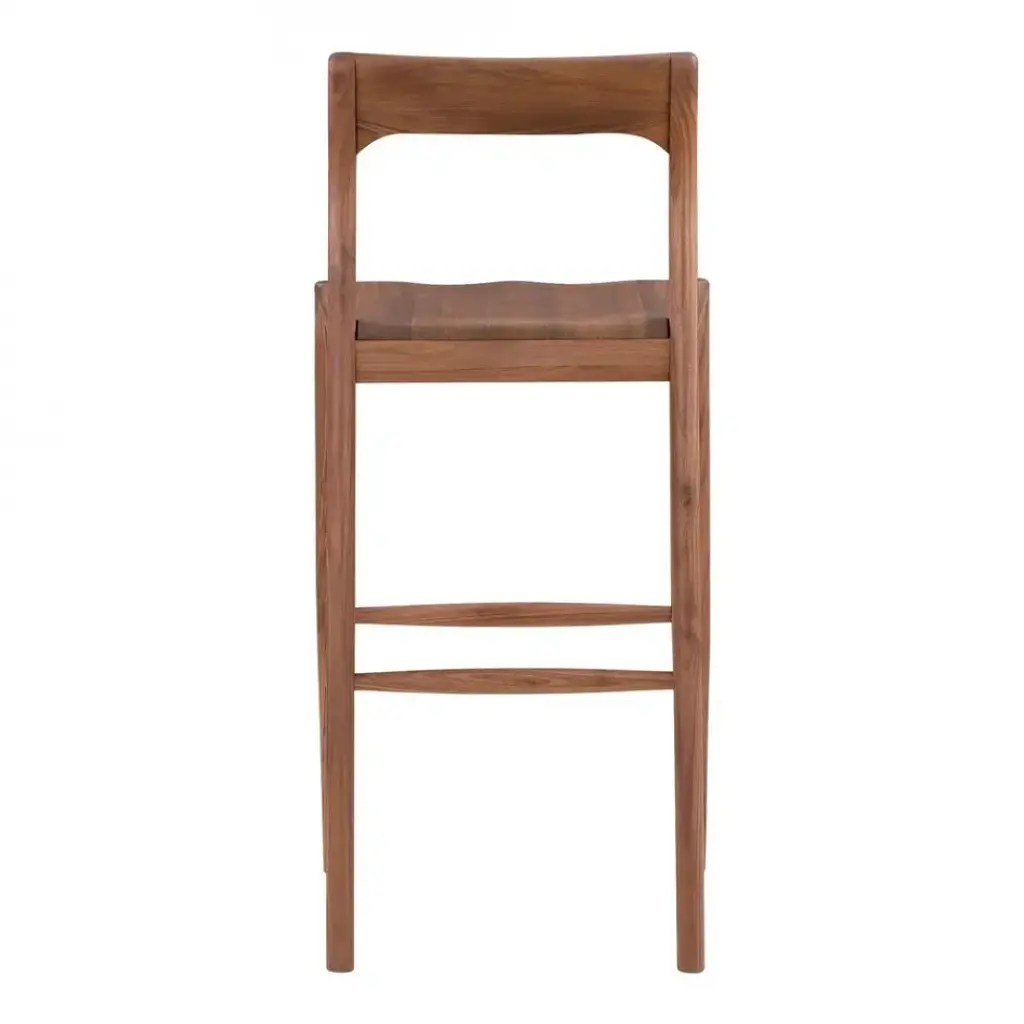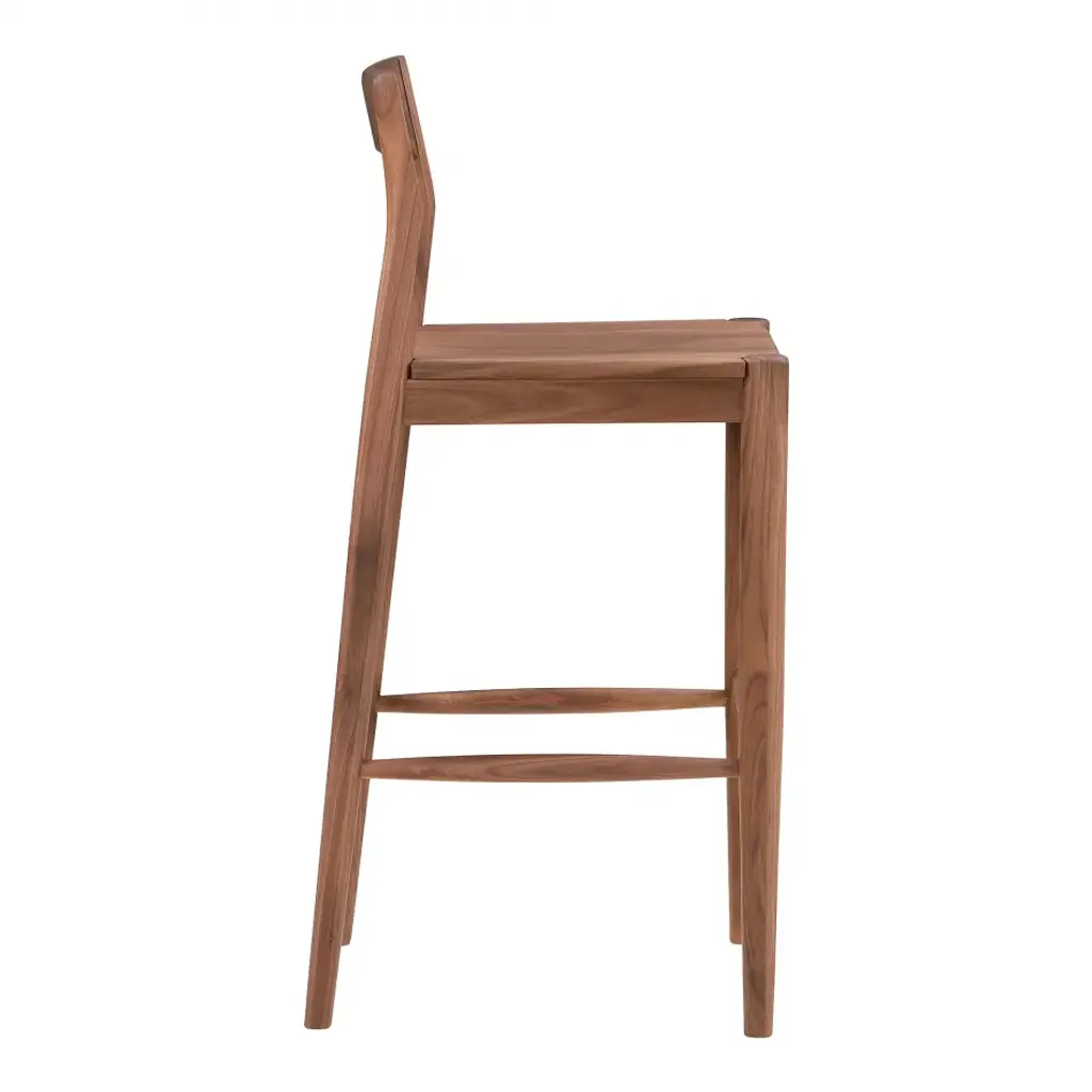 Available in walnut, the Owing counter stool is a refined spin on the traditional. Its mid-height, curved, open-back design combines comfort with casual appeal, while its solid wood frame creates a timeless, mid-century silhouette.