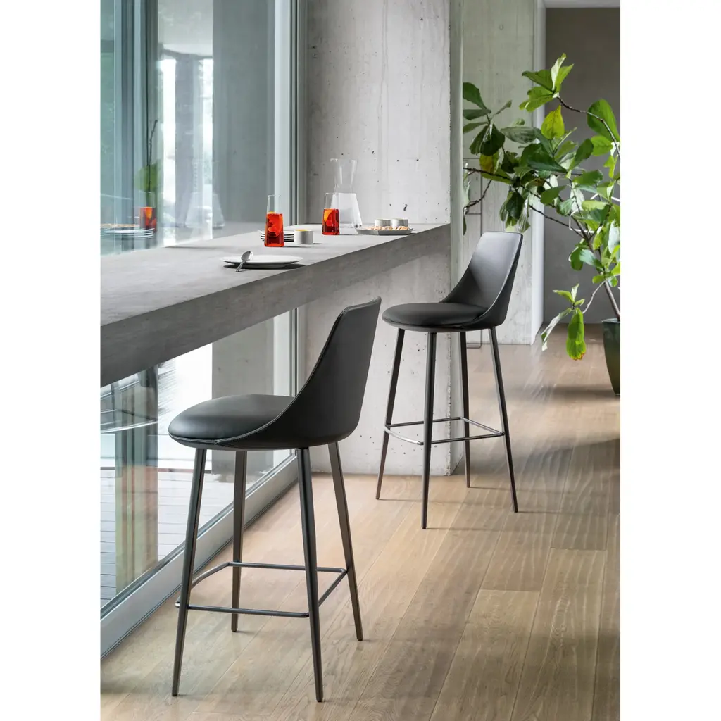 Thanks to its elegant and understated design, Itala too integrates perfectly with the various spaces of the home, integrating skillfully within contemporary and fun furnishing as well as chic and “nostalgic" settings. The comfort of the adjustable height stool is guaranteed by the accentuated padding of the seat, while the backrest, which becomes slimmer as it reaches the top, defines the light and linear silhouette. The upholstery is available in fabric, leather or eco-leather; the base and the footrest are available in various colors to ensure maximum customization.