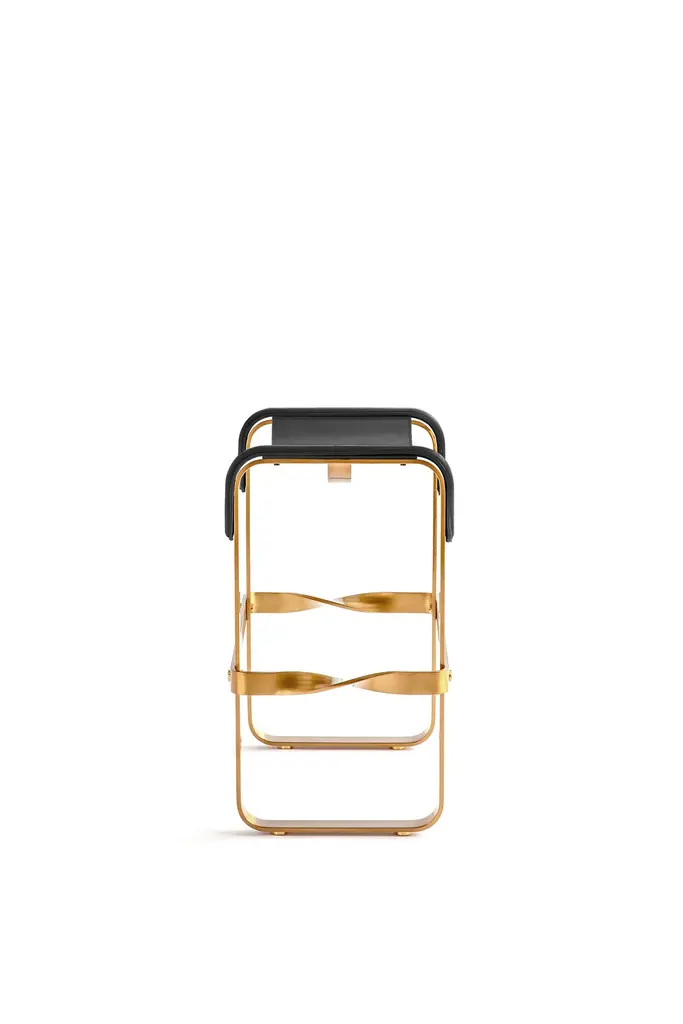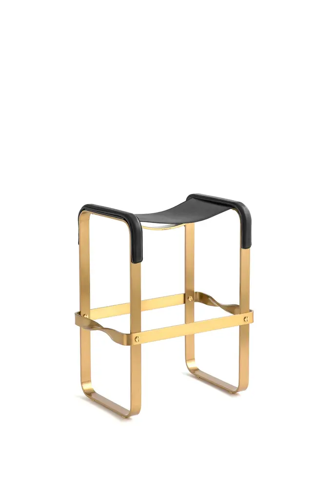 The Wanderlust contemporary counter stool belongs to a collection of minimalist and serene pieces where exclusivity and precision are shown in small details such as the hand-turned metal nuts and bolts that fix the leather surfaces, that go unnoticed at first sight.The robustness of the steel structure is combined with the delicacy of the rounded edges. The matte metal finishes evoke the passage of time and are complemented by vegetable tanned cowhide leathers that age gracefully with its use.The Wanderlust counter stool is designed and conceived as a tribute of Bauhaus tribute, the phrases "Less is more" and "God is in the detail" from the German American architect and industrial designer Mies van der Rohe, one of the pioneers of modernist architecture, define this collection.All pieces are done with cold bended steel rods, polished, nickel plated, colored by electrolysis, and lacquered. The process of polishing and lacquering the steel, goes through a manual and delicate chroming process, which gives its final and unique metal color finish. This precise technique gives a uniform metallic finish of minimum 50 microns over the entire Surface. Our metal finishing has successfully passed a corrosion resistance test in a salt spray chamber according to UNE-EN ISO 9227: 2017 and UNE-EN ISO 1456: 2010. Our signature screws are made with brass turning lathed, polished, and lacquered, these are the pieces that fix the saddle leather to the metal frame.Leathers are Spanish hides vegetable tanned. We use premium saddles in multiple colors to adjust to your taste and interior needs. This traditional vegetable dying and tanning method is an organic technique that relies on natural tannings from bark or plant tissues. The use of oils and natural fats give the leather a distinctive flexibility and texture, allowing it to be molded, retain its shape and age graciously.All skins are carefully selected from food industry sub-products, with a minimum thickness of 3.5 mm / 0,02 in, using the part of the animal's shoulder, which allows for larger pieces and uniformity, even though signature wrinkle from the animal’s neck may be recognizable. The vegetable tanning is a traditional and artisan treatment, which is respectful to the environment. Even with careful selection natural marks as a result of the contact with other animals, the age, origin and characteristics of the skin, or even the season in which the tanning takes place cannot be avoided. We still believe that these factors only add authenticity and uniqueness to every piece. Our leather parts are made with double saddles, always showing the top side of the hides that presents the better quality.Customization options.With the aim of creating customized pieces, clients can select from the various metal finishes, and leather colors to create pieces that complement their home décor. Leather colors available, black, navy, dark brown, cognac and natural tobacco, and steel polished finishing available, aged brass, black smoke and aged silver.Normally we use tone on tone threats for stitches, but client can select a contrast option, being possible to select any color to make a unique piece for the project it belongs. The finish on the edges of our leather components are sanded and hand painted. We have the option of select an alternative color if not tone on tone will be applied.Please consult in case you are interested on having a particular heat embossing stamp on the leather with your own branding.Our collections are made to full fill home spaces where to gather and enjoy great conversation with families and friends. Occasional furniture for exquisite homes, from cottages to exclusive resorts. Our product is understood as a sculptural piece of design, as an art object to be displayed at different house spaces as library, bar, living, foyer, bedroom, powder, meeting, grand or great room.The different finishes options make the furniture perfect combinations on diverse styles, from rustic mountain home, a small cottage, a ski lodge retreat, or industrial a minimalist look.