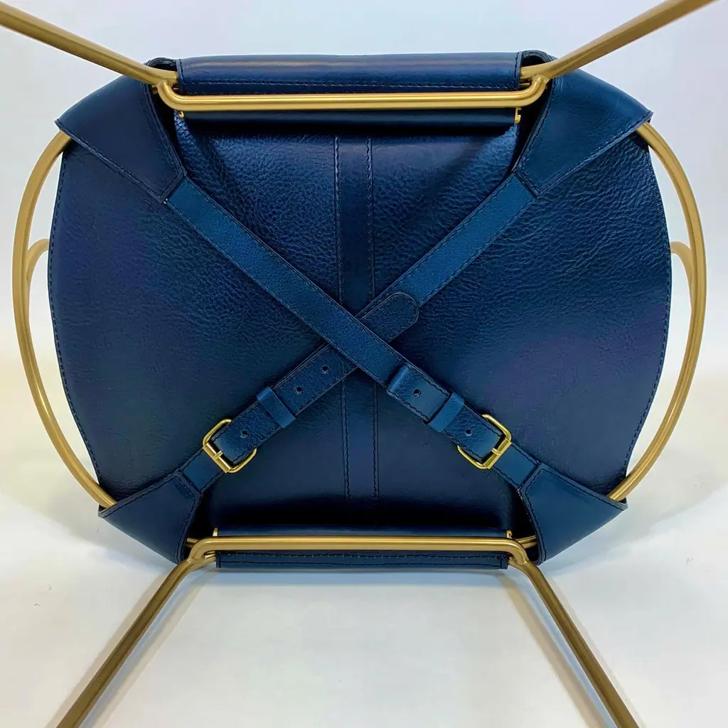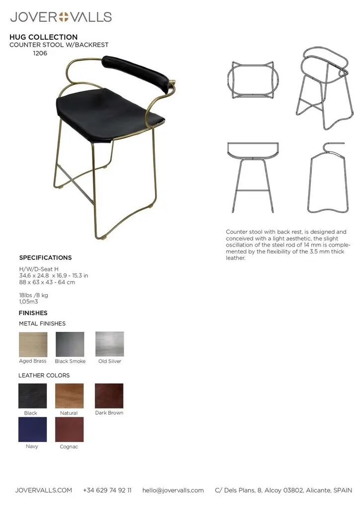 The Hug contemporary counter stool with backrest is designed and conceived with a light aesthetic, the slight oscillation of the steel rod of 12 mm is complemented by the flexibility of the double 3.5 mm thick leather. When sitting in this furniture you feel an enveloping sensation, like being hugged, since the weight of the body is distributed evenly. Each unit becomes a refuge of visual and ergonomic wellbeing.Our Hug Collection is inspired by the organic lines of a landscape, the curves of nature, and the imaginary silhouette of the wind inspire this collection of organic forms, almost like metallic sculptures. All pieces are done with cold bended steel rods, polished, nickel plated, colored by electrolysis, and lacquered. The process of polishing and lacquering the steel, goes through a manual and delicate chroming process, which gives its final and unique metal color finish. This precise technique gives a uniform metallic finish of minimum 50 microns over the entire Surface. Our metal finishing has successfully passed a corrosion resistance test in a salt spray chamber according to UNE-EN ISO 9227: 2017 and UNE-EN ISO 1456: 2010. Our signature screws are made with brass turning lathed, polished, and lacquered, these are the pieces that fix the saddle leather to the metal frame.Leathers are Spanish hides vegetable tanned. We use premium saddles in multiple colors to adjust to your taste and interior needs. This traditional vegetable dying and tanning method is an organic technique that relies on natural tannings from bark or plant tissues. The use of oils and natural fats give the leather a distinctive flexibility and texture, allowing it to be molded, retain its shape and age graciously.All skins are carefully selected from food industry, with a minimum thickness of 3.5 mm / 0,02 in, using the part of the animal's shoulder, which allows for larger pieces and uniformity, even though signature wrinkle from the animal’s neck may be recognizable. The vegetable tanning is a traditional and artisan treatment, which is respectful to the environment. Even with careful selection natural marks as a result of the contact with other animals, the age, origin and characteristics of the skin, or even the season in which the tanning takes place cannot be avoided. We still believe that these factors only add authenticity and uniqueness to every piece. Our leather parts are made with double saddles, always showing the top side of the hides that presents the better quality.Customization options.With the aim of creating customized pieces, clients can select from the various metal finishes, and leather colors to create pieces that complement their home décor. Leather colors available, black, navy, dark brown, cognac and natural tobacco, and steel polished finishing available, aged brass, black smoke and aged silver.Normally we use tone on tone threats for stitches, but client can select a contrast option, being possible to select any color to make a unique piece for the project it belongs. The finish on the edges of our leather components are sanded and hand painted. We have the option of select an alternative color if not tone on tone will be applied.Please consult in case you are interested on having a particular heat embossing stamp on the leather with your own branding.Our collections are made to full fill home spaces where to gather and enjoy great conversation with families and friends. Occasional furniture for exquisite homes, from cottages to exclusive resorts. Our product is understood as a sculptural piece of design, as an art object to be displayed at different house spaces as library, bar, living, foyer, bedroom, powder, meeting, grand or great room.The different finishes options make the furniture perfect combinations on diverse styles, from rustic mountain home, a small cottage, a ski lodge retreat, or industrial a minimalist look.