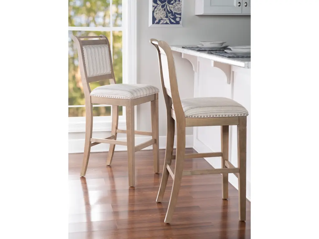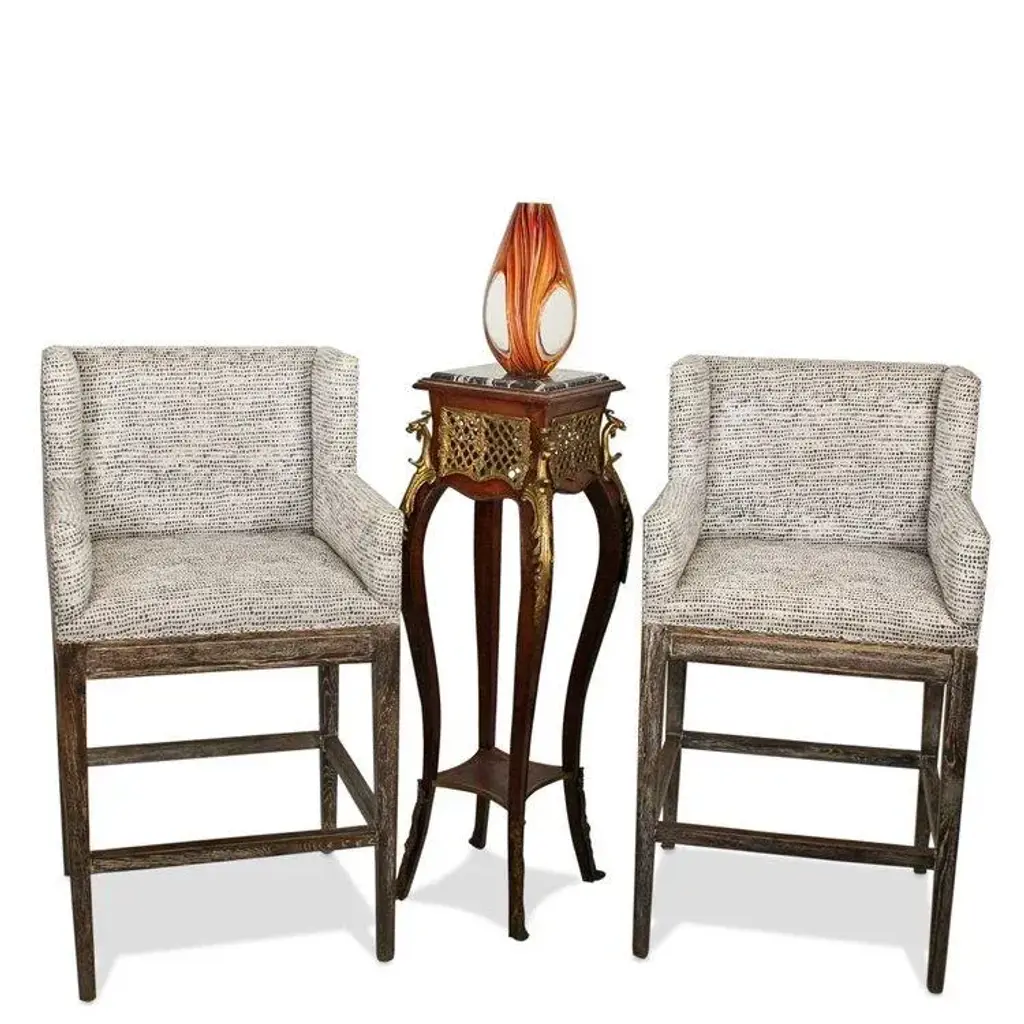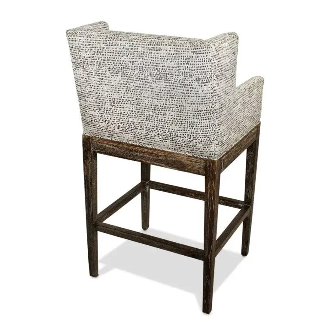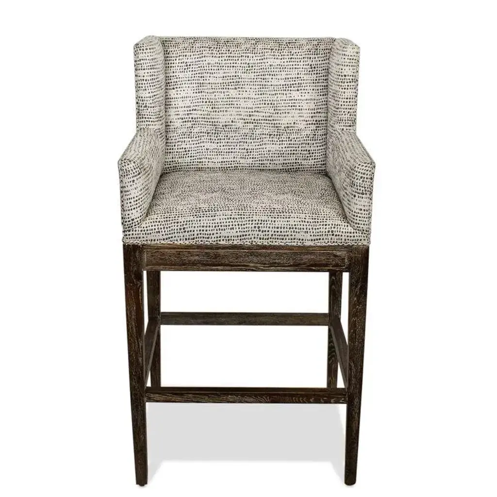 Tapered legs – a signature of midcentury design – complement these stool's strikingly angular silhouette. A wooden frame supports the tailored seat and back, providing visual contrast and adding warmth. Dimensions: 24x23x44, Seat Height 30"