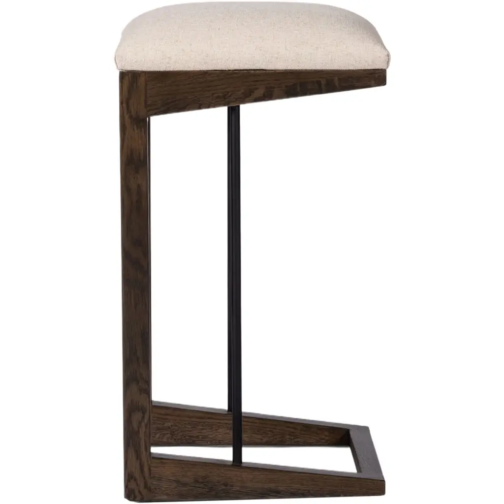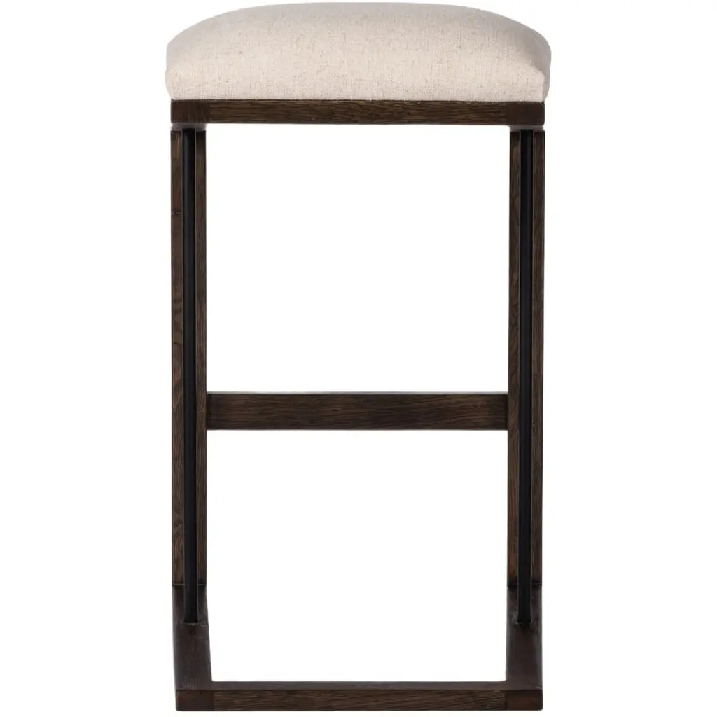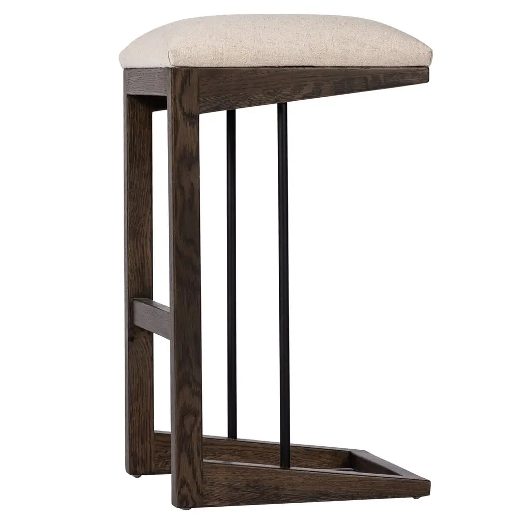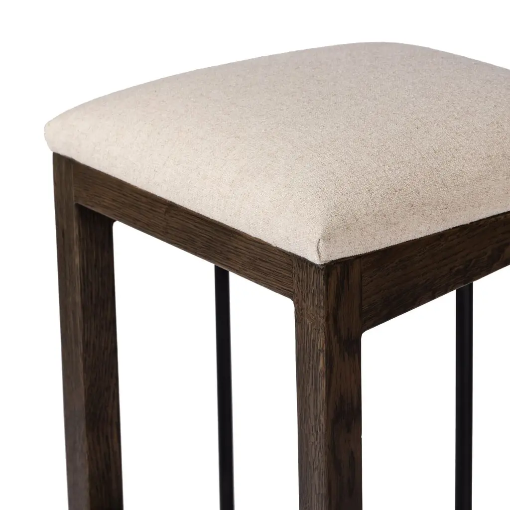 A stunner from every angle, this architecturally inspired bar stool features an angular base crafted from solid wood with two iron rods for added support and visual interest. The seat is upholstered in a linen/cotton/poly blend performance fabric with subtle texture throughout. Performance fabrics are specially created to withstand spills, stains, high traffic, and wear, ensuring long-term comfort and unmatched durability.