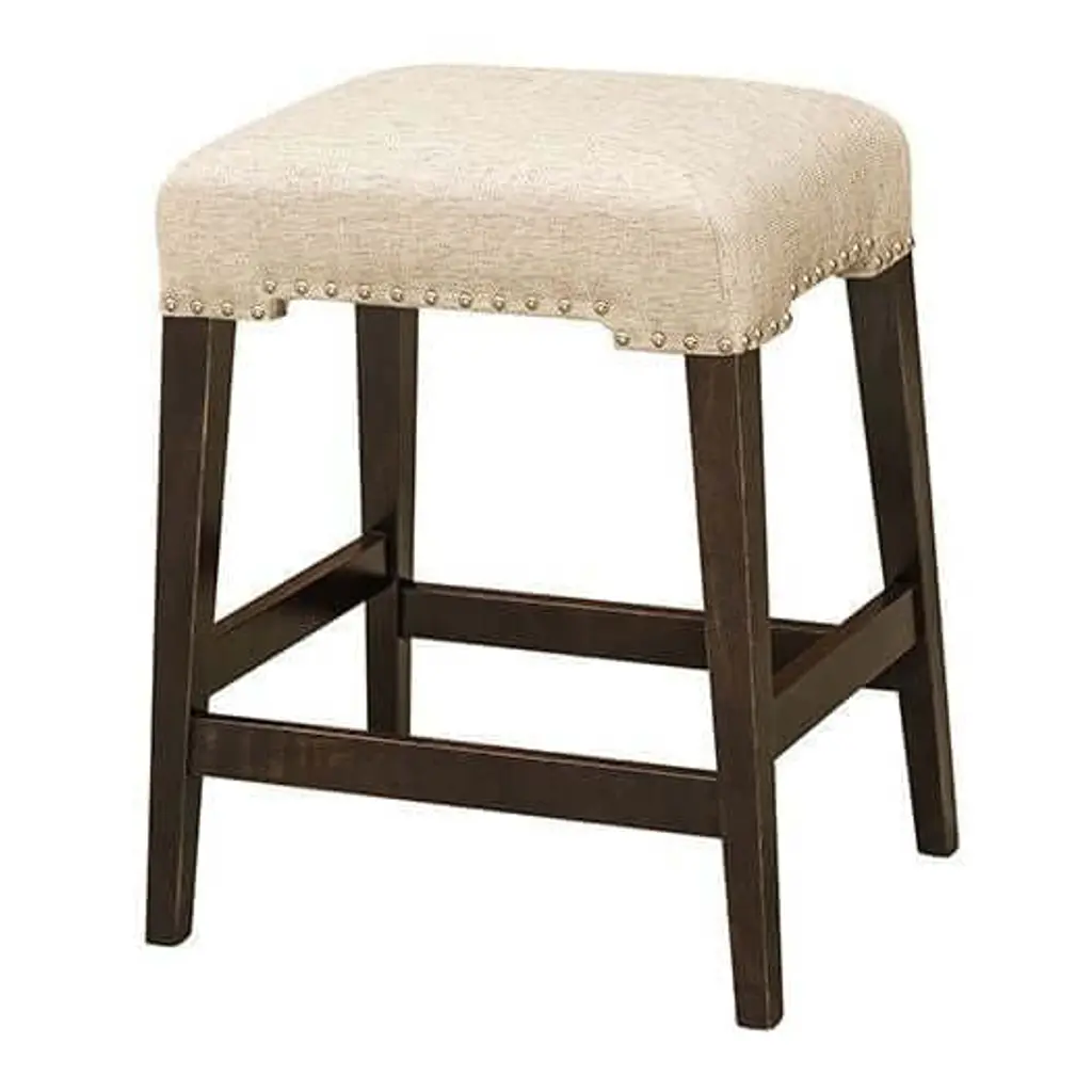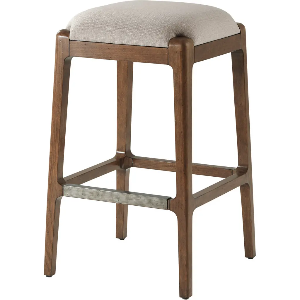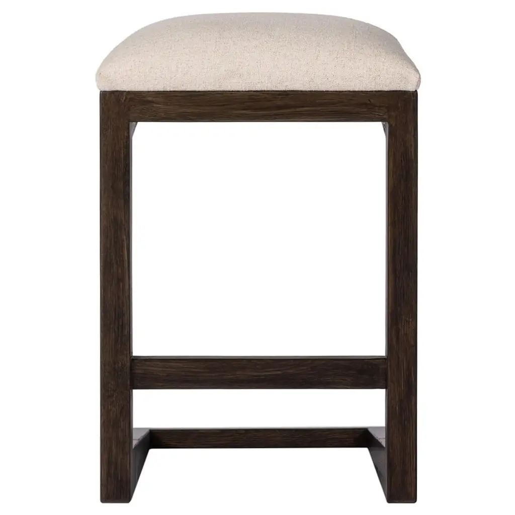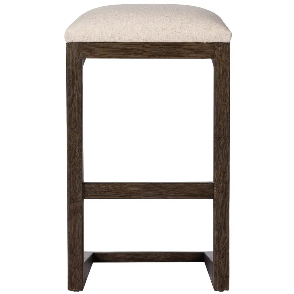 A stunner from every angle, this architecturally inspired bar stool features an angular base crafted from solid wood with two iron rods for added support and visual interest. The seat is upholstered in a linen/cotton/poly blend performance fabric with subtle texture throughout. Performance fabrics are specially created to withstand spills, stains, high traffic, and wear, ensuring long-term comfort and unmatched durability.