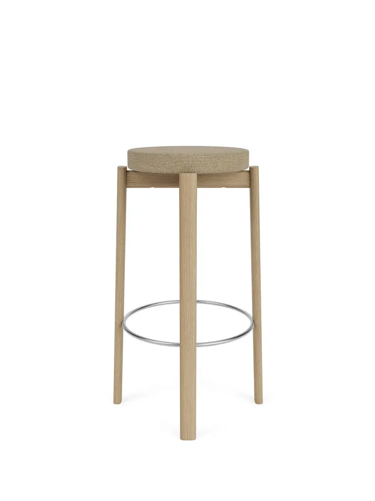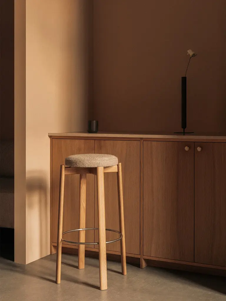 Looking to time-honored Danish cabinetmaking traditions, the Passage Bar Stool displays modern design and woodworking through traditional techniques. Crafted from solid walnut or FSC™-certified solid oak with a lacquered finish, the rich color and luxurious grain pattern inherent to the high-quality hardwood ensure an enduring aesthetic. Thoughtfully designed and offered in an upholstered version for added ease, a brushed brass or brushed steel foot ring ensures a comfortable seating experience for extended periods, while the stool's counter height aligns seamlessly with kitchens, bars and other communal spaces, making it a versatile design that effortlessly blends functionality with comfort. Its ingenious flat-pack construction encourages active participation in the assembly process.