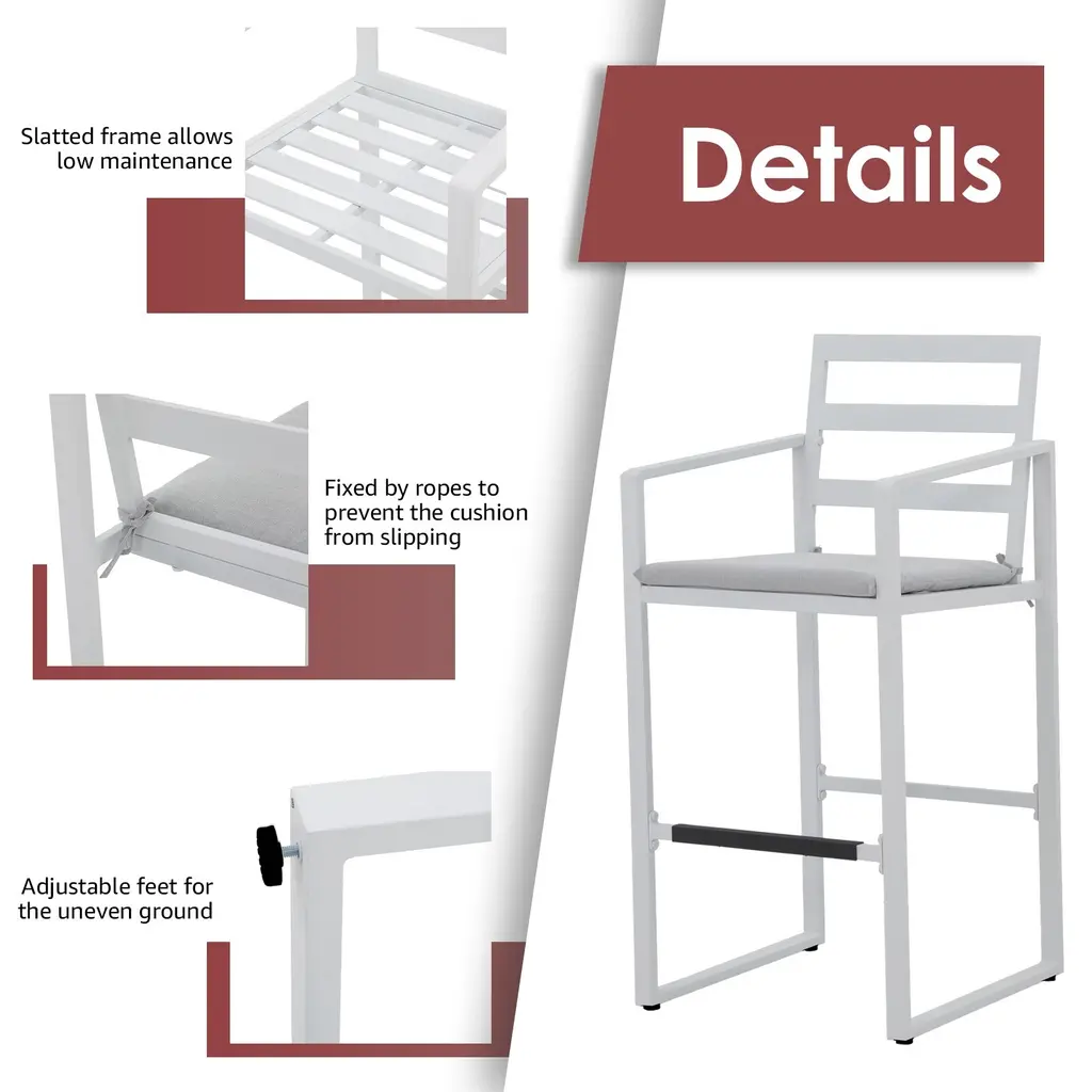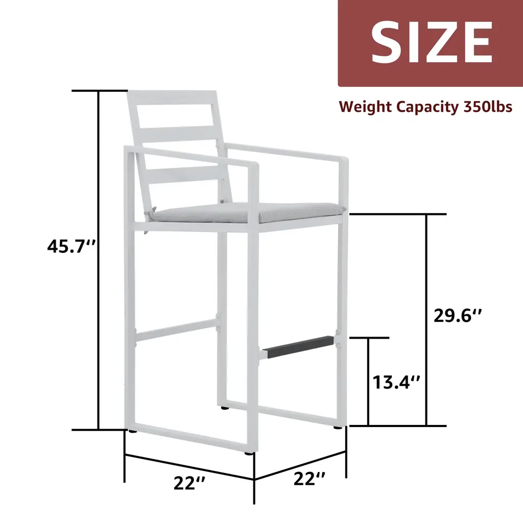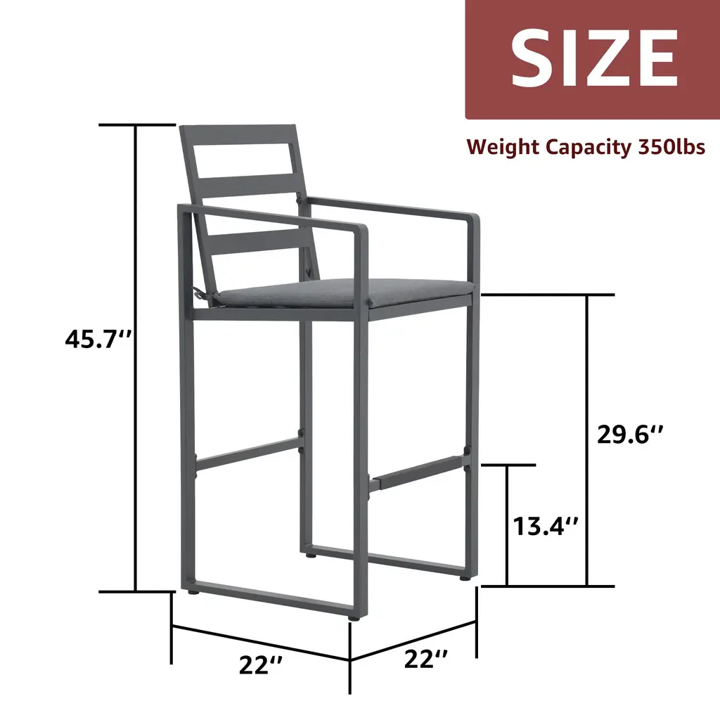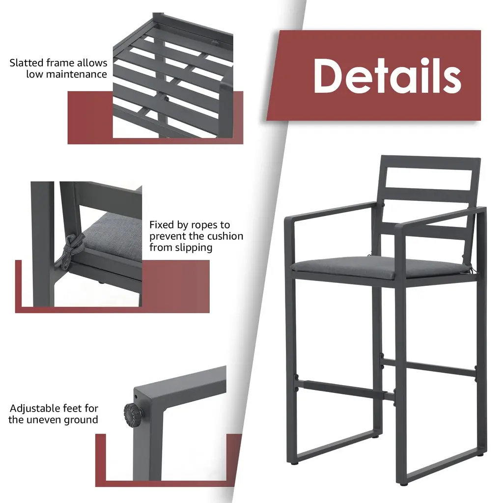 Give you and your family the perfect perch to settle into a meal on this stylish bar stool set. Designed to withstand the elements, these durable stools are constructed from solid aluminum and will be your go-to seating option for years to come. The foam-padded cushions provide the ultimate comfort while you soak up the sun. Enhance your outdoor space and create an inviting seating area with our 4-piece barstool set. Features:Footrests of the right height relieve more pressureSlatted structure for stability and chic lookCushion can be fixed by rope to avoid slidingCome with adjustable feet for better balanceEasy to put together with manual and hardwareSpecification:Includes 4 barstoolsMaterial: AluminumSize: 22" D x 22" W x 45.7" HSeating height: 29.6"Footrest height: 13.4"