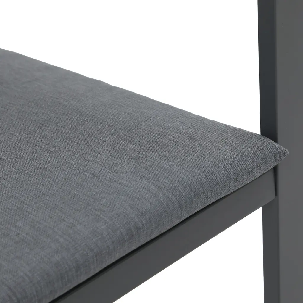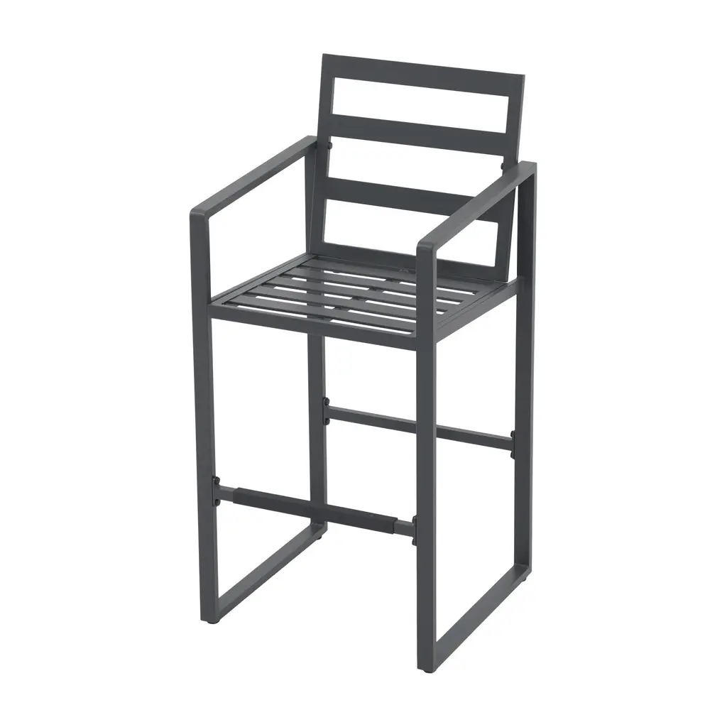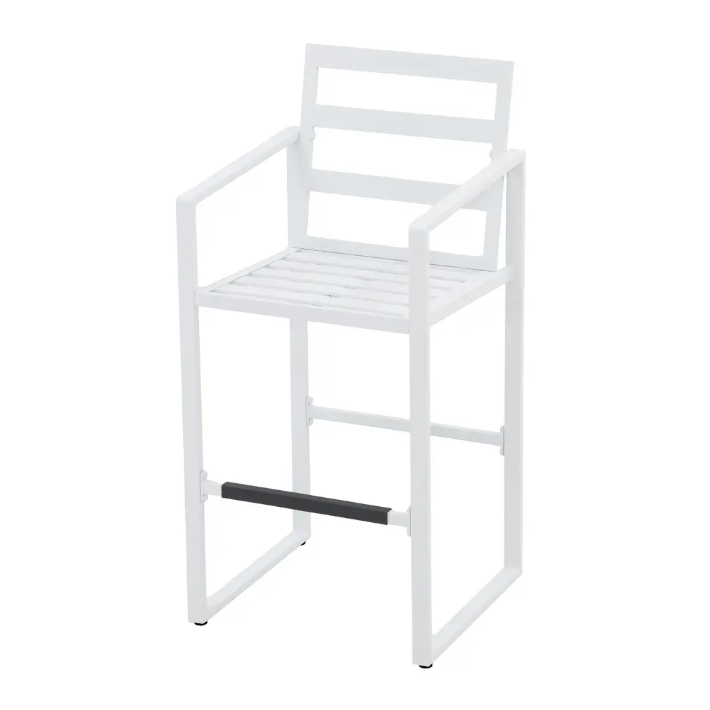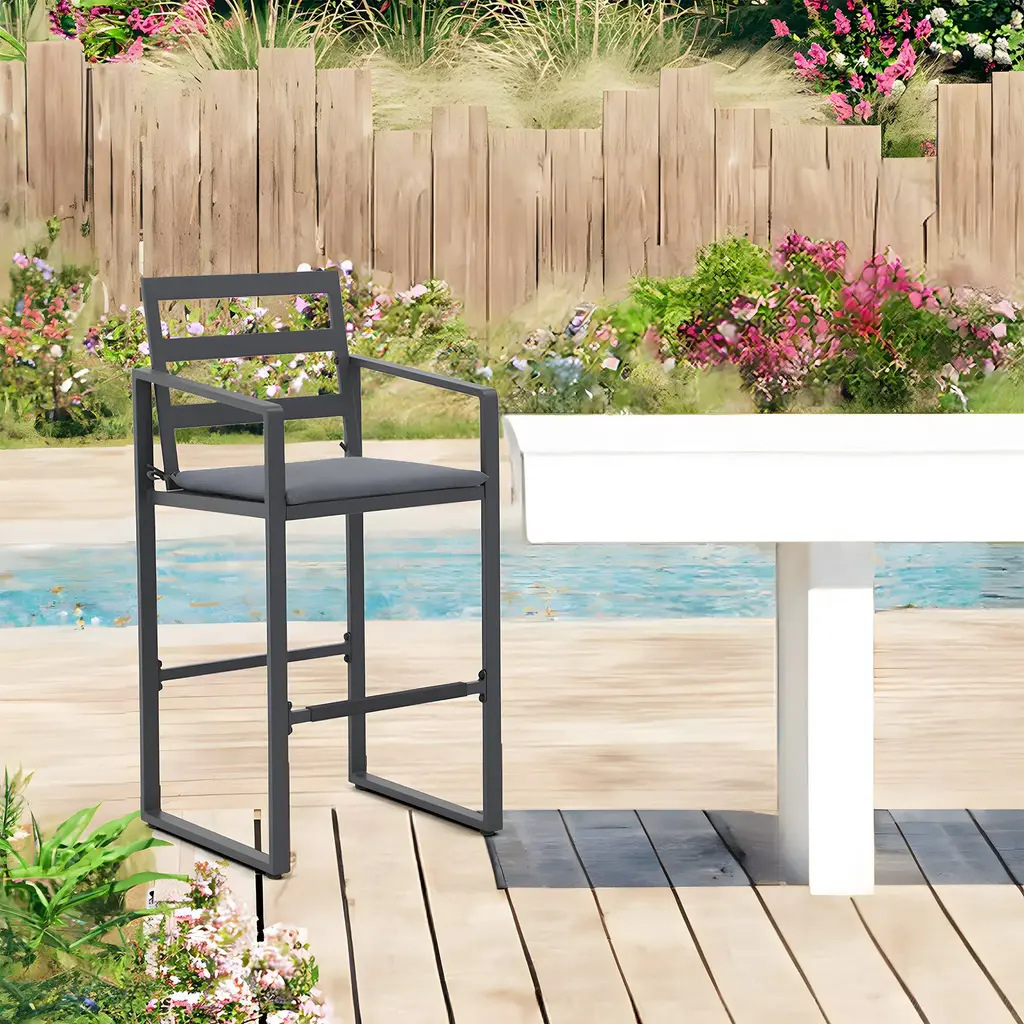 Give you and your family the perfect perch to settle into a meal on this stylish bar stool set. Designed to withstand the elements, these durable stools are constructed from solid aluminum and will be your go-to seating option for years to come. The foam-padded cushions provide the ultimate comfort while you soak up the sun. Enhance your outdoor space and create an inviting seating area with our 4-piece barstool set. Features:Footrests of the right height relieve more pressureSlatted structure for stability and chic lookCushion can be fixed by rope to avoid slidingCome with adjustable feet for better balanceEasy to put together with manual and hardwareSpecification:Includes 4 barstoolsMaterial: AluminumSize: 22" D x 22" W x 45.7" HSeating height: 29.6"Footrest height: 13.4"