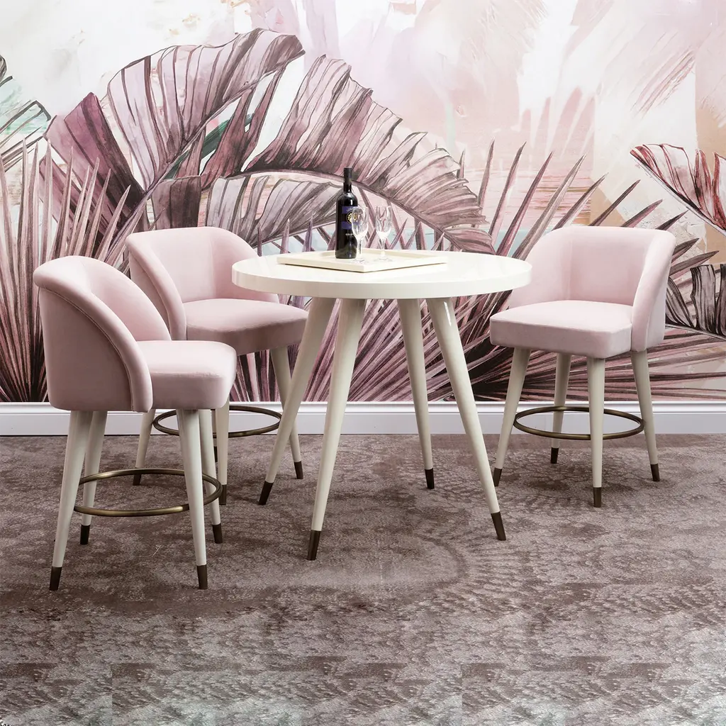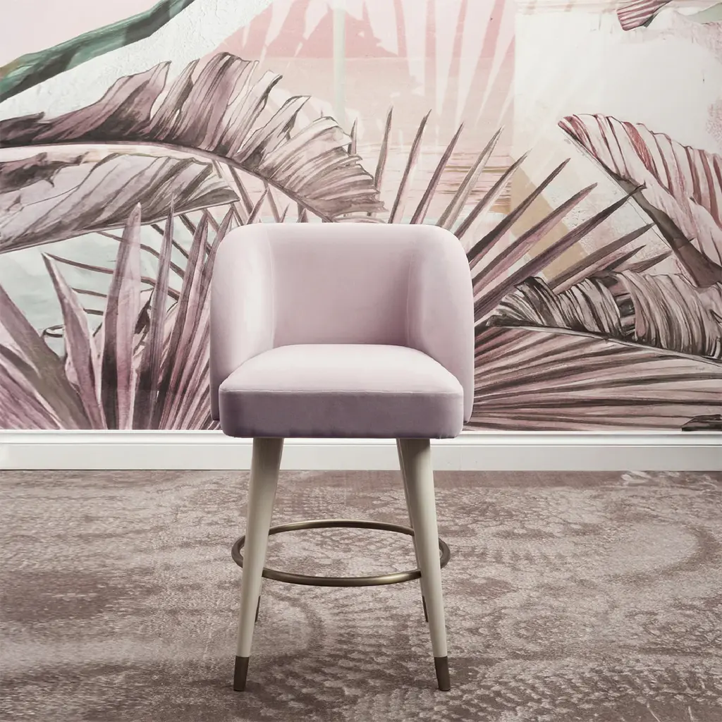 A delicate addition to a modern home, this bar stool is part of the Pauline Collection, a series of seating options distinctive for their retro-chic charm and enveloping design. The wooden structure comprises slanted legs connected by a ring that functions as a footrest and is made in bronzed metal, matching the tips of the legs. The padded seat and curved backrest are upholstered in pink fabric. This piece will be equally eye-catching in a breakfast nook at home around the Andrea Bar Table, or around a tall counter.