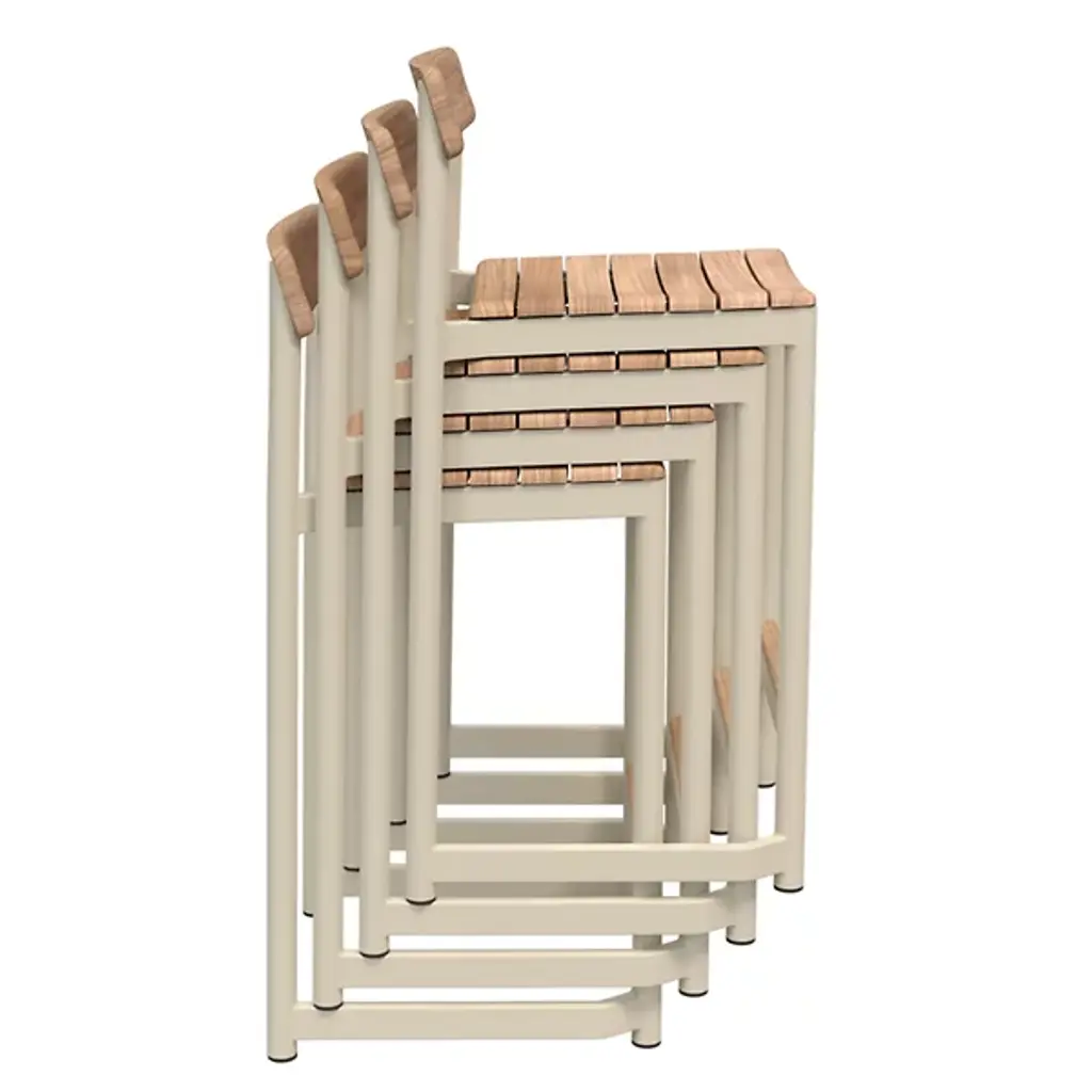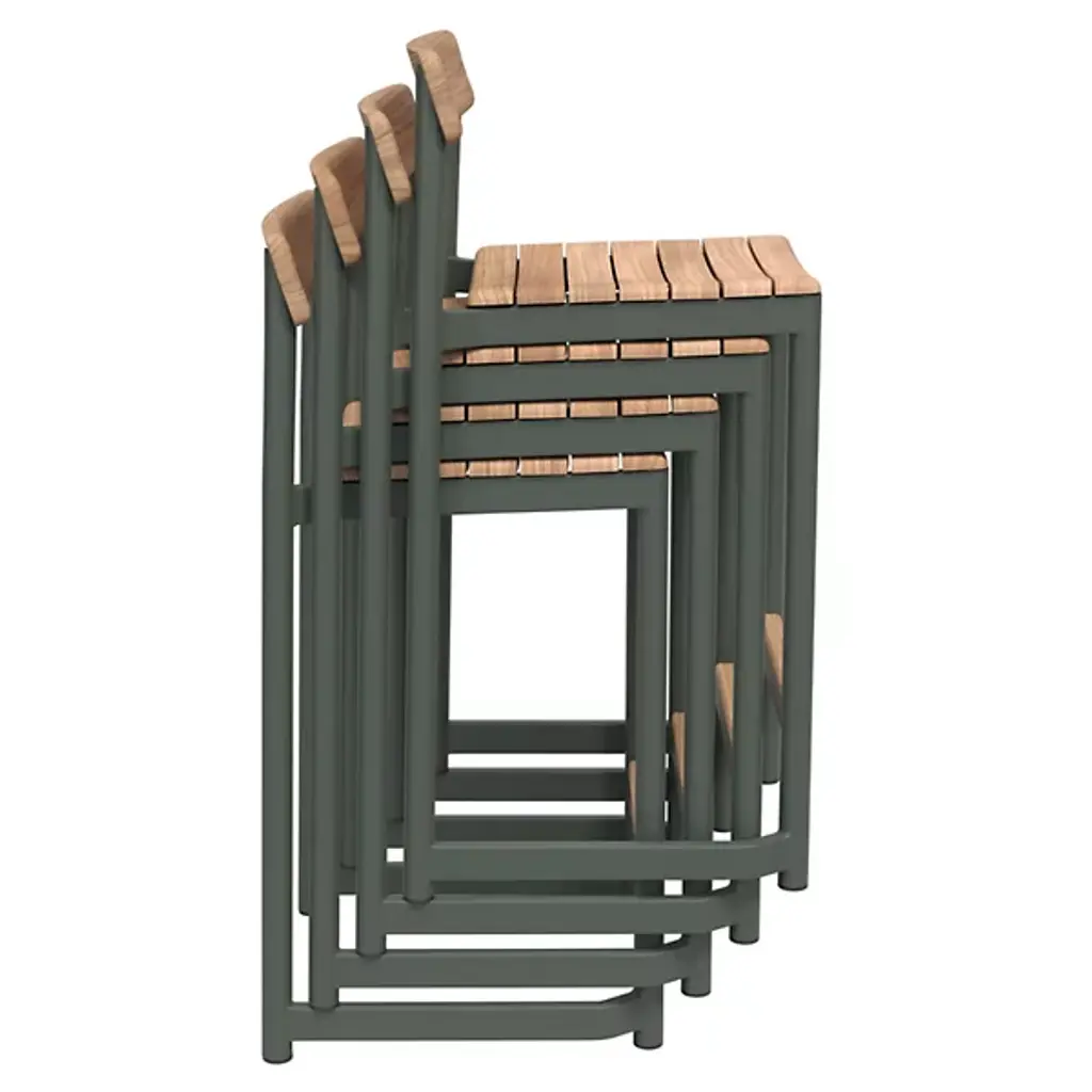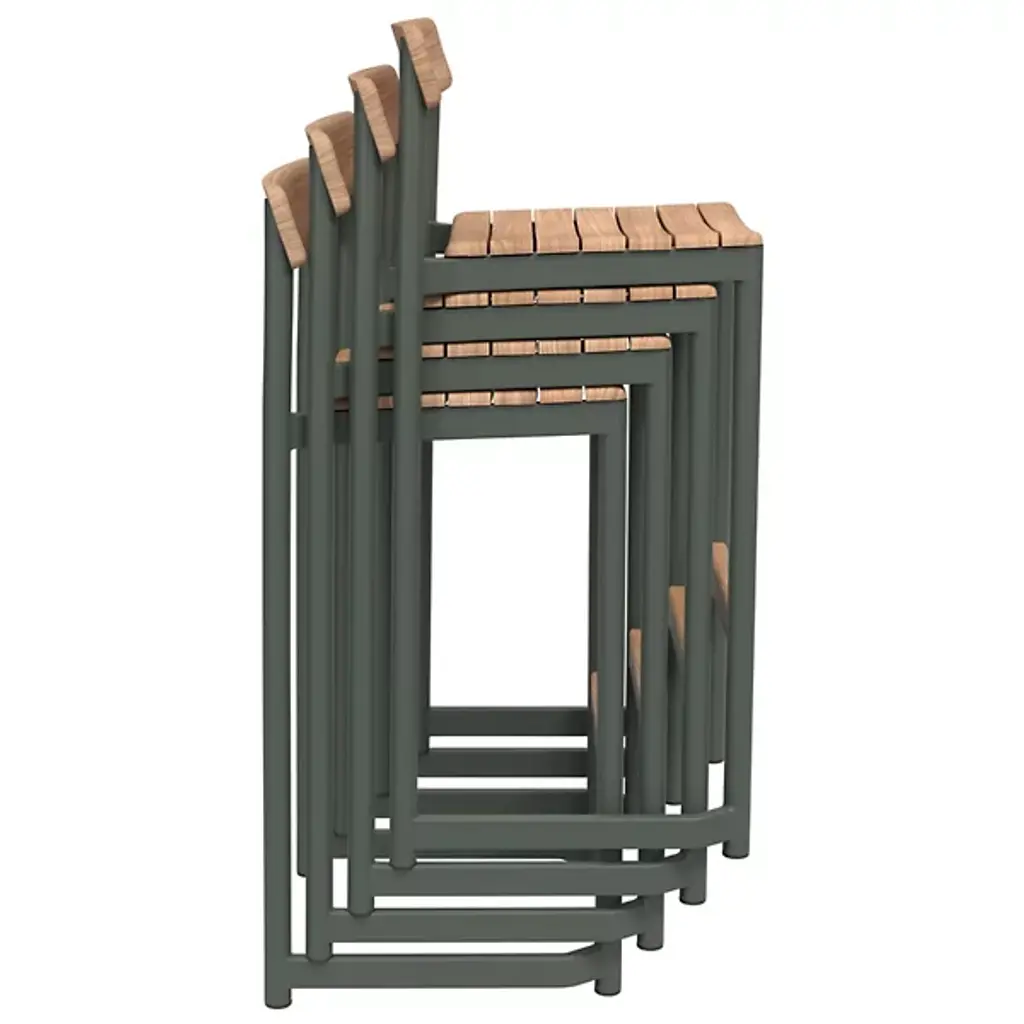 The Pelagus Outdoor Counter/Barstool from Fritz Hansen provides elevated seating for tall tables, featuring minimalist clarity enhanced by natural materials. Created by Note Design Studio in Stockholm, its powder-coated aluminum body is slender yet strong, supporting a comfortably curved seat and back, along with a footrest made of sustainably harvested and FSC-certified untreated teak wood. The seat is stackable with up to three others, while the natural wood grain contrasts with the matte-textured metal, acquiring a silver patina over time and use.
