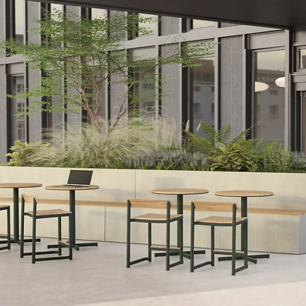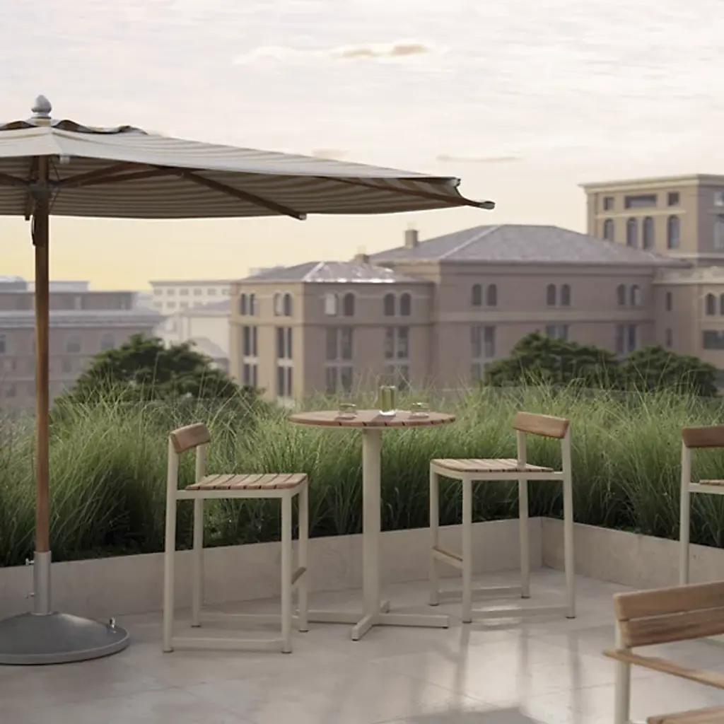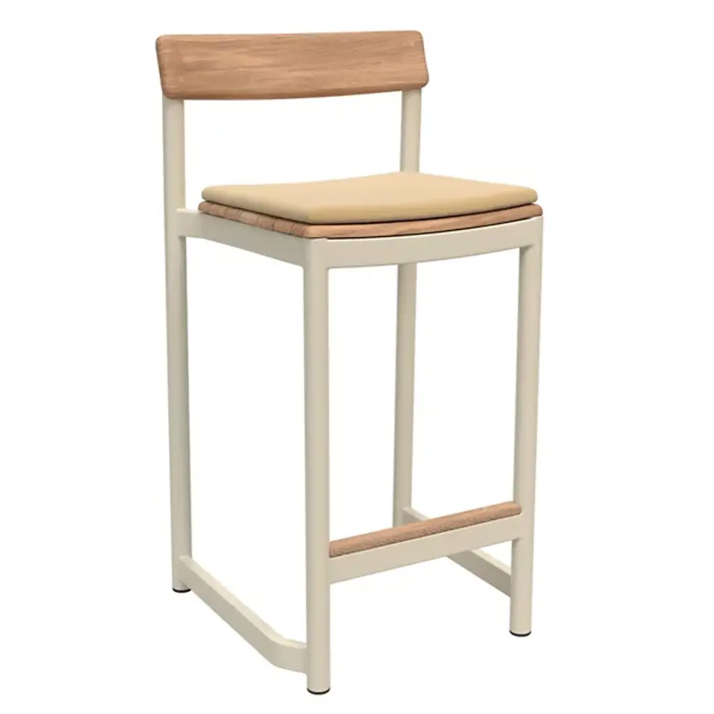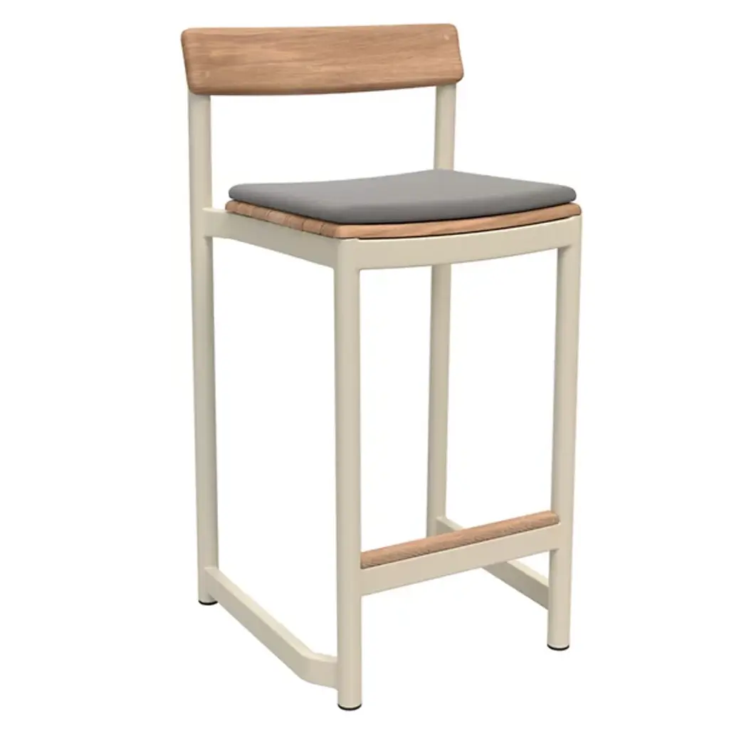 The Pelagus Outdoor Counter/Barstool from Fritz Hansen provides elevated seating for tall tables, featuring minimalist clarity enhanced by natural materials. Created by Note Design Studio in Stockholm, its powder-coated aluminum body is slender yet strong, supporting a comfortably curved seat and back, along with a footrest made of sustainably harvested and FSC-certified untreated teak wood. The seat is stackable with up to three others, while the natural wood grain contrasts with the matte-textured metal, acquiring a silver patina over time and use.