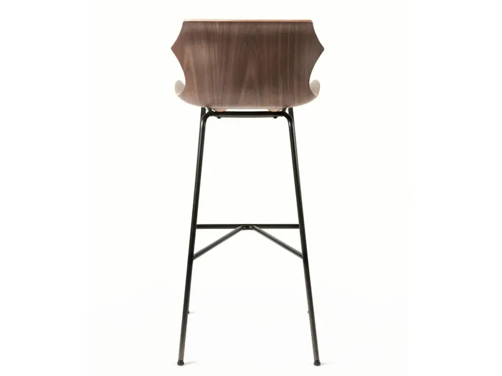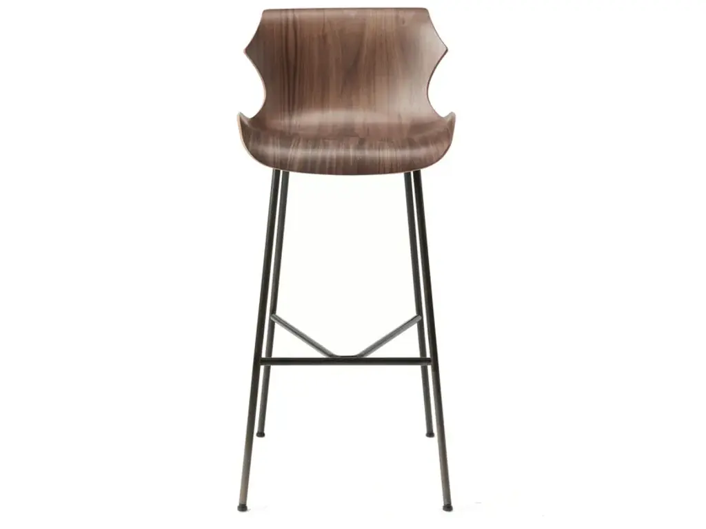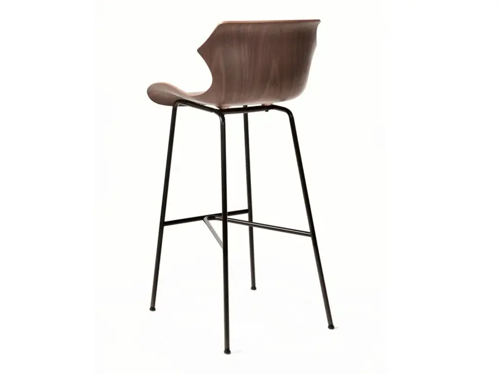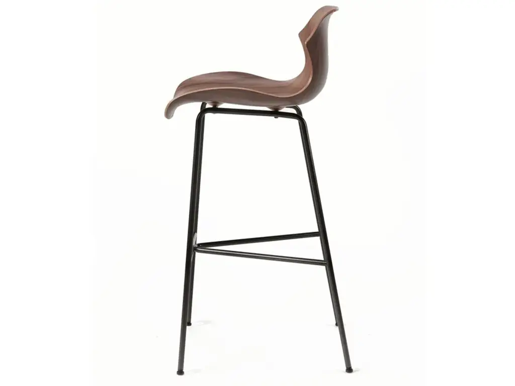 The Petal Stool is a stool with a 3D molded wood veneer shell and a tubular steel powder coated base. Materials: Shell in 3D White Oak or Walnut veneer. Footrest in solid steel rod.The BassamFellows Petal chair is the most advanced 3D molded wood veneer chair ever put into commercial production. It takes some of its inspiration from Saarinen’s Tulip chair, and also offers a dialogue with the history of the Eames experiments. The Petal chair is state of the art and environmentally friendly, but the industrial nature of the process behind it, and its economic use of materials, makes for a democratic price point. It sits neatly alongside other bent plywood chairs in terms of function and aesthetic, but has a notably more expressive form. The super-shaped wood mimics the unfolding of flower petals, creating a comfortable ergonomic form. The back is wider at its top to provide support, while rolled waterfalls of shaped wood soften the edges. Nature frequently offers the perfect mood board for comfort in design. Petal’s appeal is accentuated by the visual grain of the wood, which resembles the fine detail on a flower – the lines emanating outwards in the direction of a bloom. It’s fitting that the Petal shell is pressed at Davidson Plyforms in Grand Rapids, MI in the USA –the same company that has been pressing the Eames’ molded plywood chairs for decades. It draws a line back to the 1940s, but also represents a significant development for 21st century design. 20 years ago, CNC carving was in its infancy. The ergonomic and organic BassamFellows Tractor stool – which debuted in Milan in 2003 – was only made possible through use of that technology. Today, it is standard. The Petal is similarly ergonomic and organic-looking, but pushes the boundaries of what’s possible with molding: despite advances in 3D tech, the curvature of the rump of the shell, the waterfall edges and the shape of the arms are all extraordinarily difficult to achieve. But as the Eames’ experiments in the 1940s, technology exists to be developed more than it does to curb ambition. It is constantly being shaped.