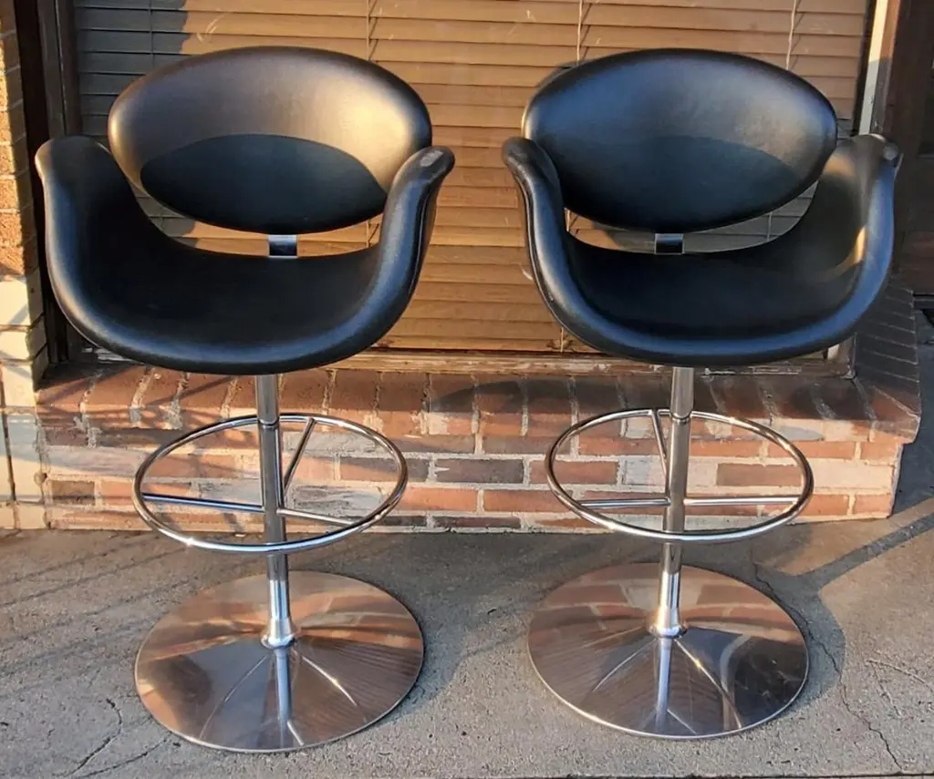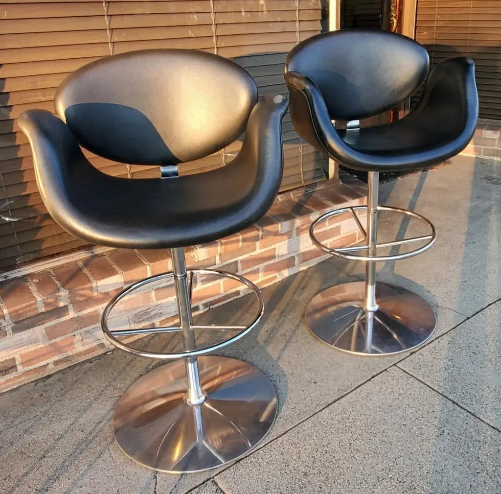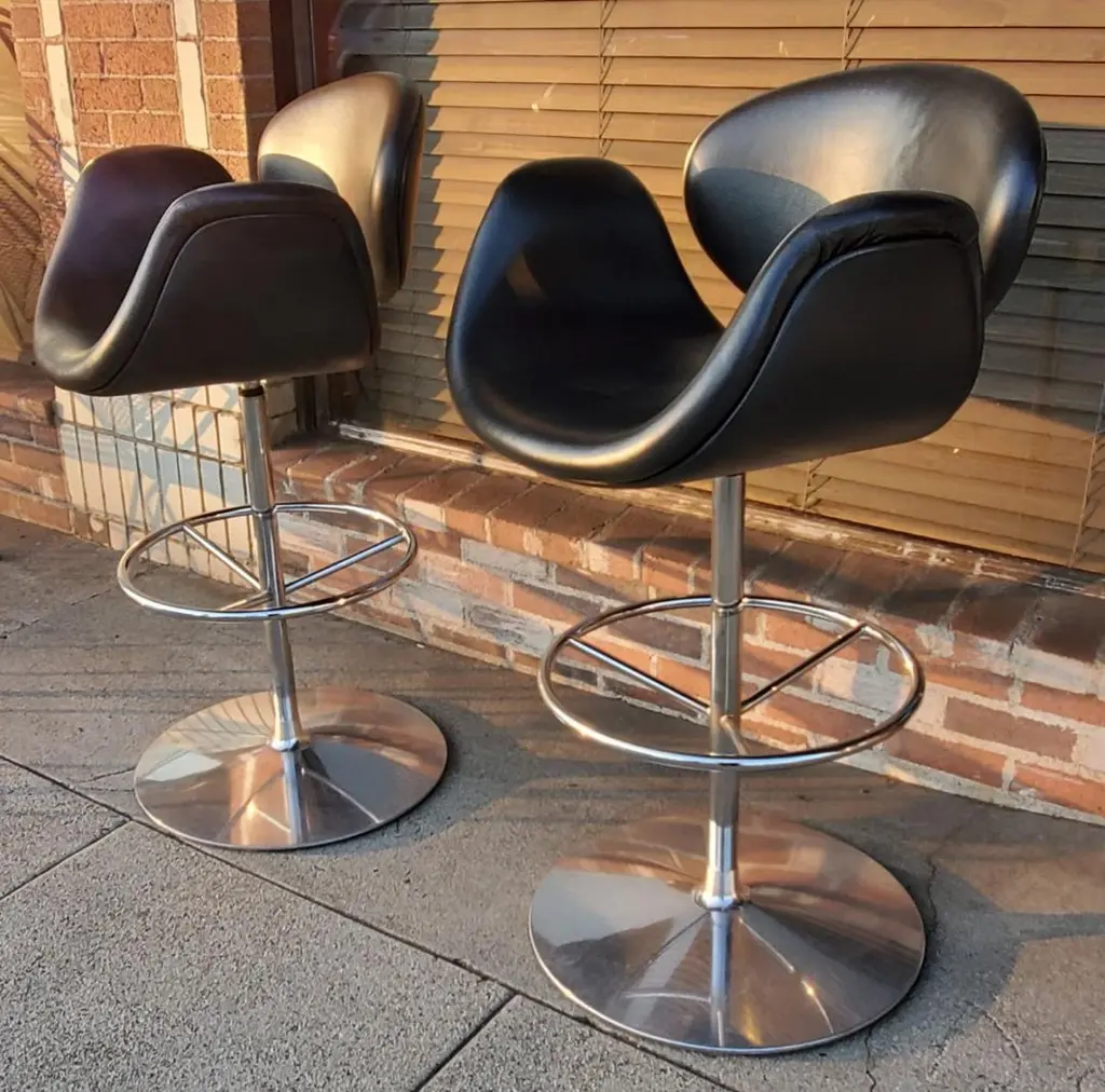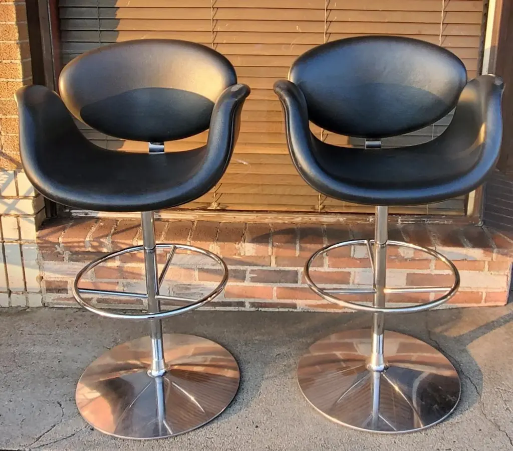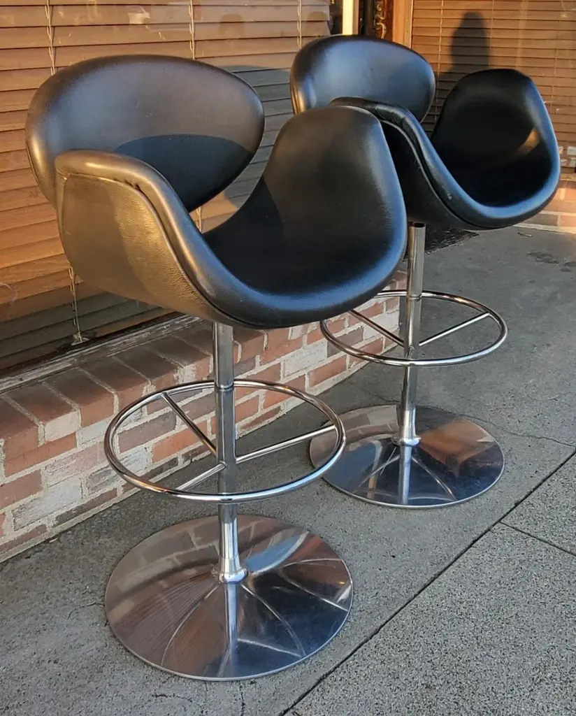 LITTLE TULIP designer Pierre Paulin, 1965.Made in The Netherlands by Artifort."A chair should be more than simply functional. It should be friendly, fun and colorful."-Pierre Paulin"Little Tulip" like a blossoming flower, the little tulip barstool for artifort is elegance through and through.The Little Tulip Barstool Designed by Pierre Paulin Is An ARTIFORT Classic. When Released In 1965, They Clearly Remain Recognizable As An Iconic Style That Makes Them The Perfect Choice For A Wide Impressive Display For Residential And Or Commercial Applications Today.These Barstools are excellent in design and function. These barstools are in black leather (artifort uses elmosoft leather) with no holes or tears. However there are some wear on the armrests as you can see in our pics, and on the seat of one of the barstools are like little dots of wear as well.The little tulip barstools has a rotating disc base with a return mechanism.Each barstool is stamped "artifort" on the bottom of each base.Each barstool has the "artifort" metal label - artifort tulip Pierre Paulin.The Dimensions are: forty-three inches tall by thirty-nine and a half inches arm height by thirty inches seat height by twenty-five inches arm to arm by eighteen and a half inches seat depth by sixteen inches floor to footrest tall by twenty-five inches wide. the total depth of barstool is twenty inches.