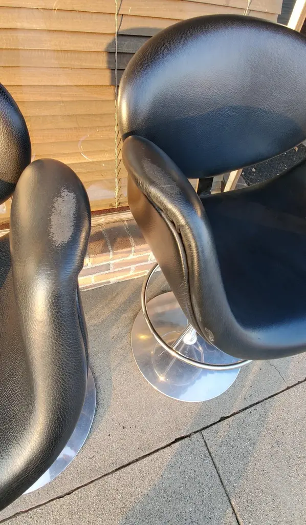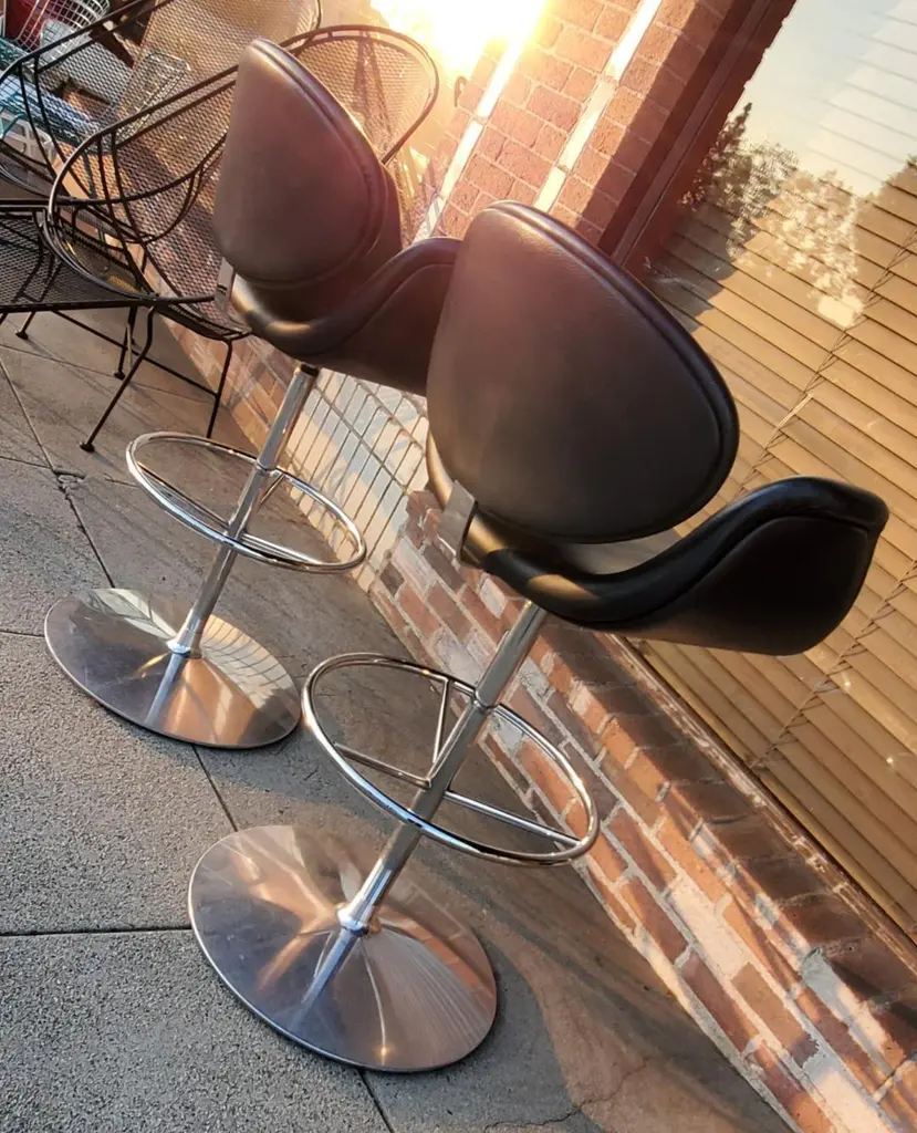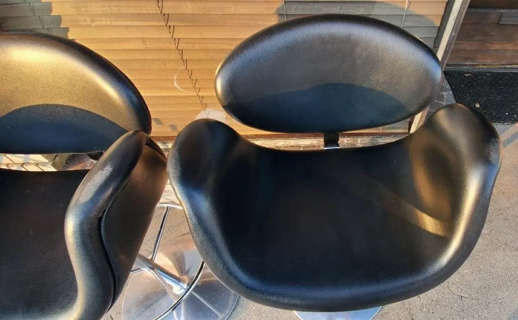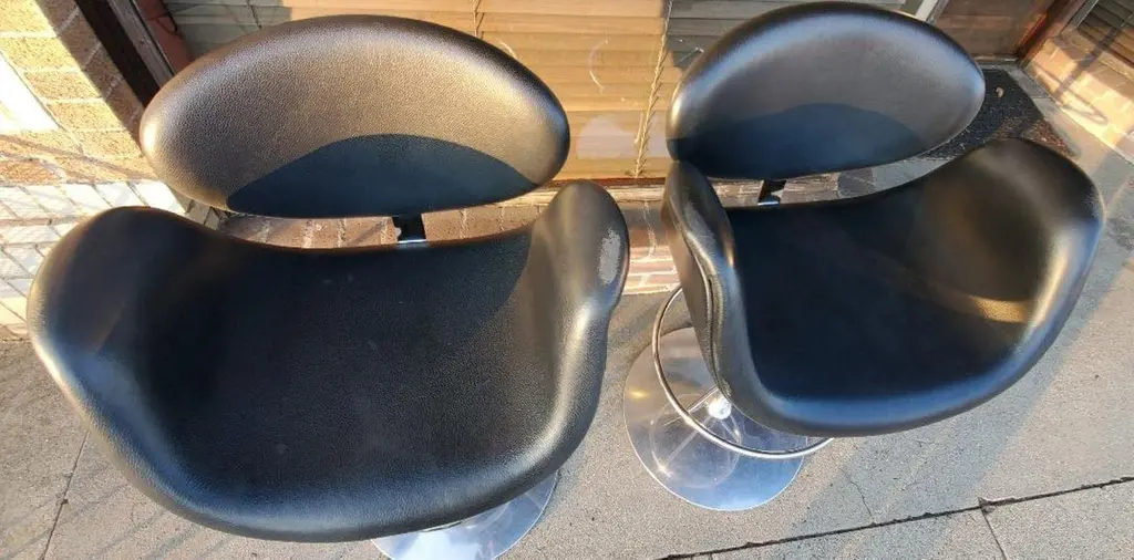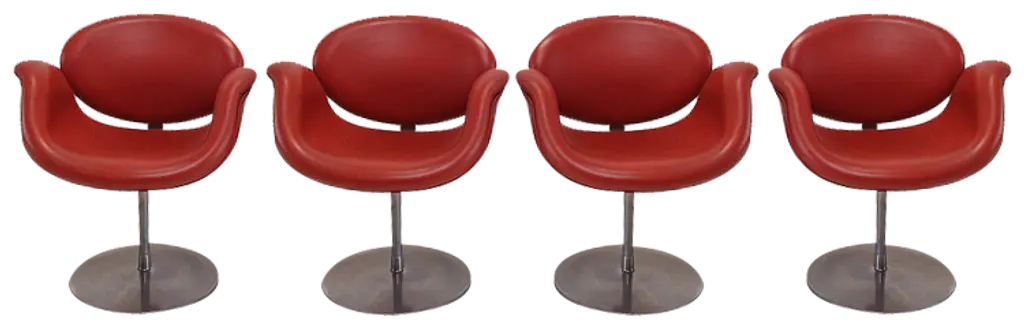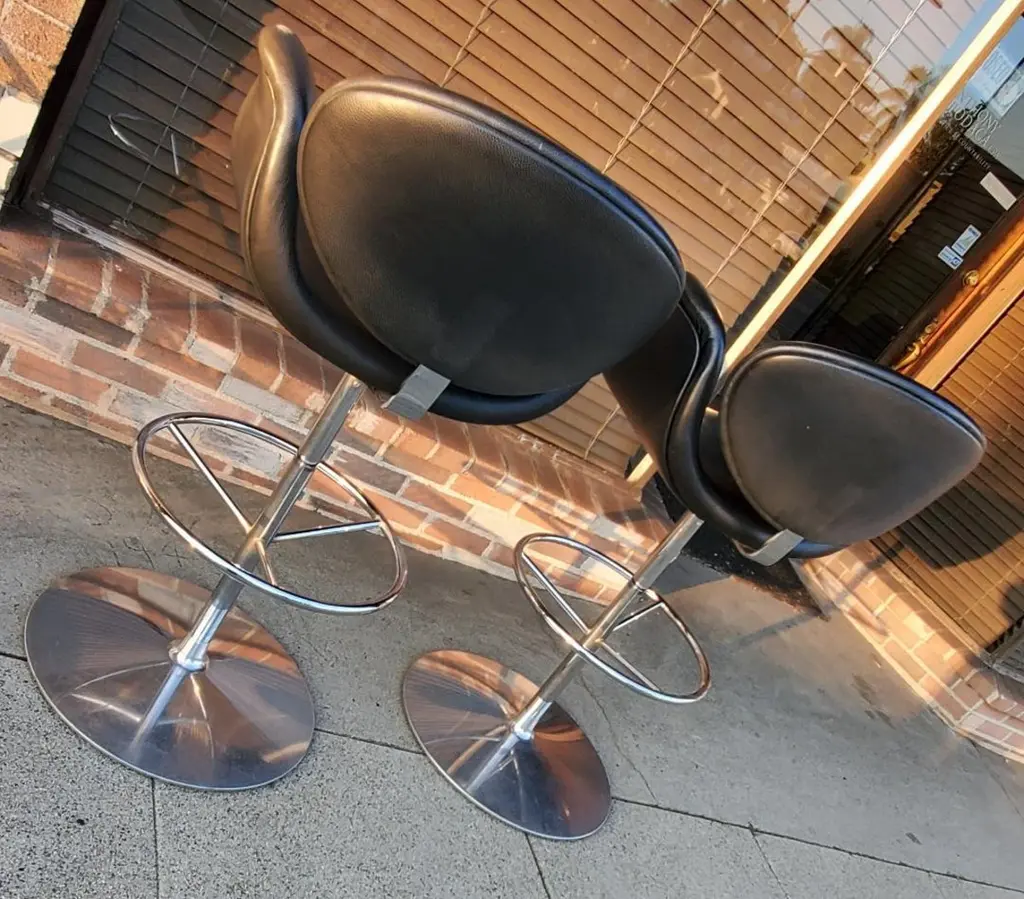LITTLE TULIP designer Pierre Paulin, 1965.Made in The Netherlands by Artifort."A chair should be more than simply functional. It should be friendly, fun and colorful."-Pierre Paulin"Little Tulip" like a blossoming flower, the little tulip barstool for artifort is elegance through and through.The Little Tulip Barstool Designed by Pierre Paulin Is An ARTIFORT Classic. When Released In 1965, They Clearly Remain Recognizable As An Iconic Style That Makes Them The Perfect Choice For A Wide Impressive Display For Residential And Or Commercial Applications Today.These Barstools are excellent in design and function. These barstools are in black leather (artifort uses elmosoft leather) with no holes or tears. However there are some wear on the armrests as you can see in our pics, and on the seat of one of the barstools are like little dots of wear as well.The little tulip barstools has a rotating disc base with a return mechanism.Each barstool is stamped "artifort" on the bottom of each base.Each barstool has the "artifort" metal label - artifort tulip Pierre Paulin.The Dimensions are: forty-three inches tall by thirty-nine and a half inches arm height by thirty inches seat height by twenty-five inches arm to arm by eighteen and a half inches seat depth by sixteen inches floor to footrest tall by twenty-five inches wide. the total depth of barstool is twenty inches.