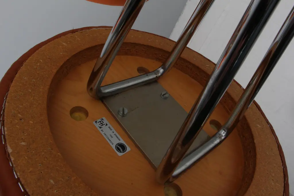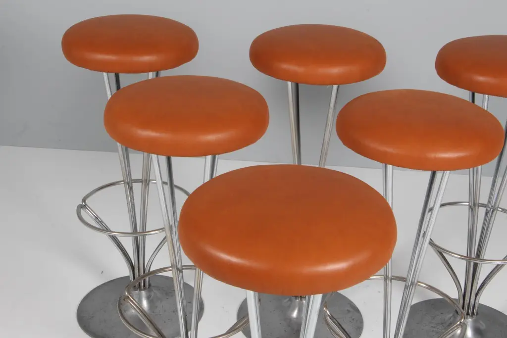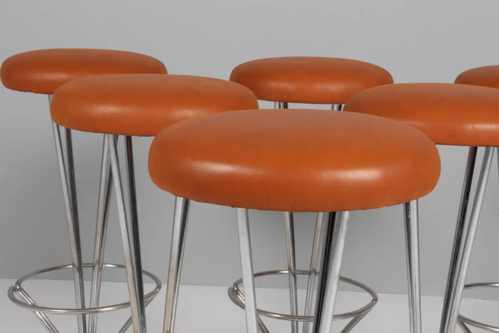 Piet Hein bar stools new upholstered with tan aniline leather.Piet Hein baseMade by Fritz Hansen.
