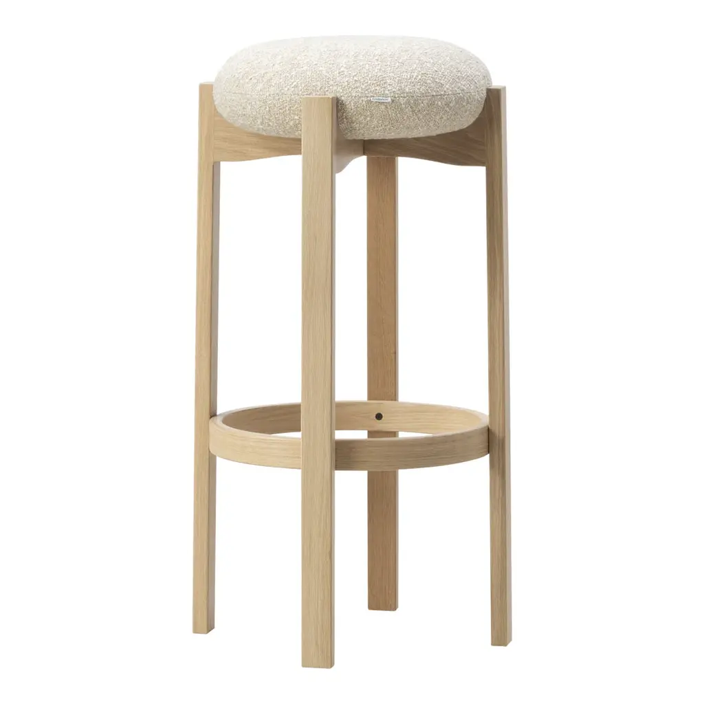 The sculptural Pioneer stools combine good seating comfort, functionality and a sculptural design language that elegantly combines the seat's soft and round design with the wooden frame's sensuality. The chair's simple, unique and distinctive combination of shapes and materials is a modern take on Scandinavian design that combines functionality with Bruun's recognisable sculptural minimalism. The four vertical legs of the wooden frame are united in a cross composition with elegant indentations, where the light, the upholstered seat cushion, is placed on top. In contrast, the detailed indentation on the underside completes the overall artistic impression.