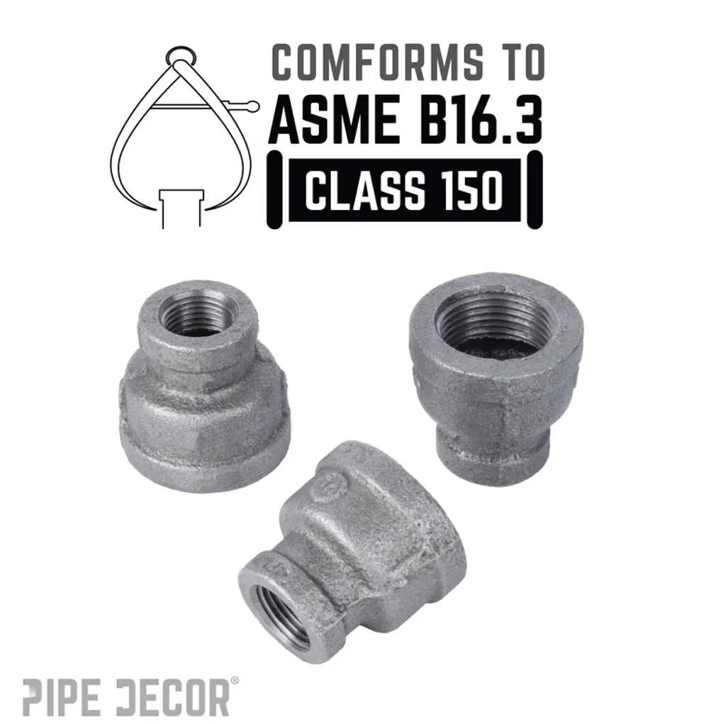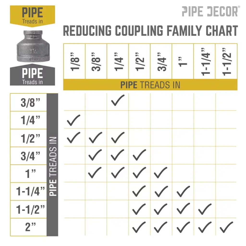 These cylindrical reducing couplings connect two pipes of different diameters, making it easy to add height or length to table legs, bar stools, clothing racks, and more. Made from durable, industrial-grade malleable iron, they are 100% authentic and built to last. PIPE DECOR parts are recognized for their strength and style—real industrial fittings for your designs. Extra pieces and accessories are available for custom projects, allowing plug-and-play as needed. Perfect for any DIY project, these iron fittings work with a variety of aesthetics, including steampunk lighting, industrial, factory, French country farmhouse, vintage, retro, reclamation, DIY customized, and modern styles. We recommend cleaning and sealing each fitting before use. IPS threads ensure compatibility with other project materials, such as lamp parts and valves, and work seamlessly with any pipes, fittings, or PIPE DECOR furniture kits.