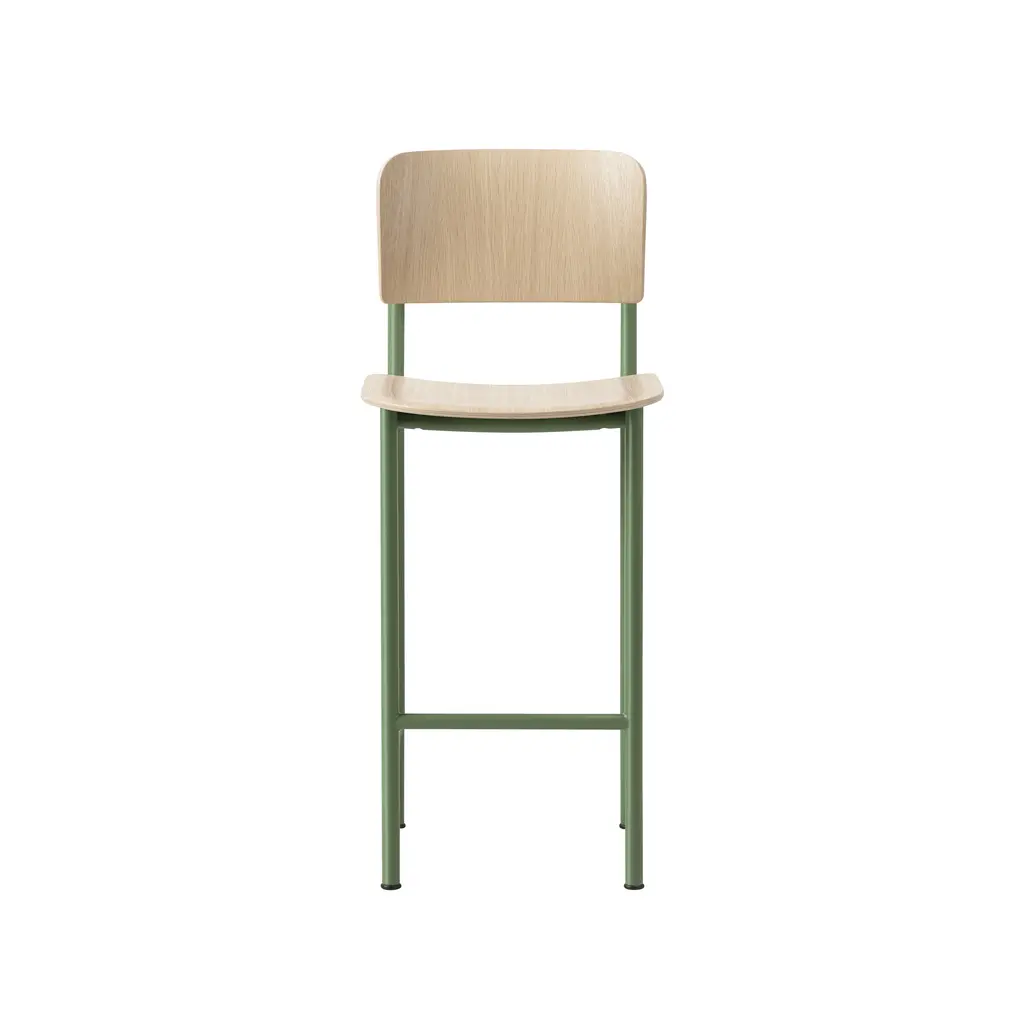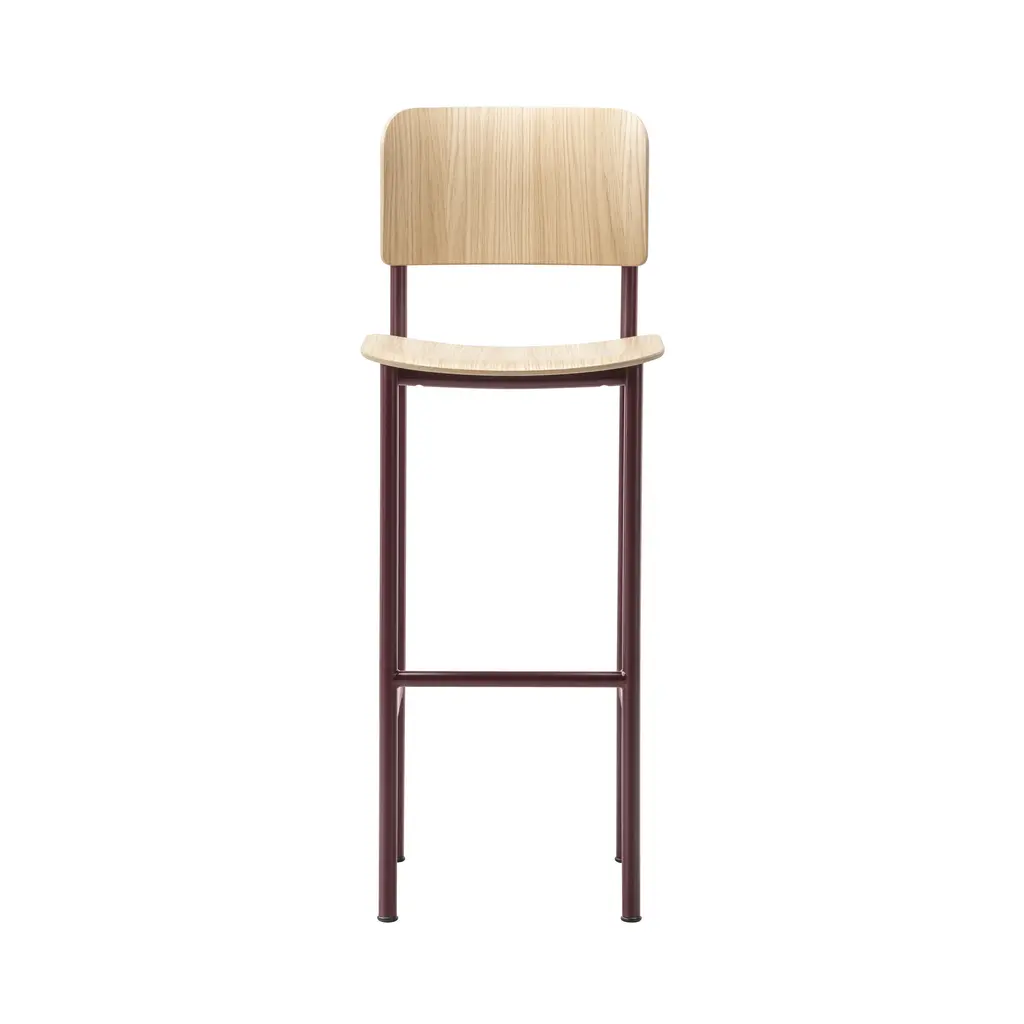 With its compact footprint and generous comfort, this barstool suits a range of environments, from collaborative workspaces to refined hospitality settings. It features a steel tube frame—available in powder-coated or brushed finishes—supporting a seat and backrest crafted from plywood veneer with a water-based lacquer finish. This stool is EU Ecolabel certified and designed for disassembly and recycling.