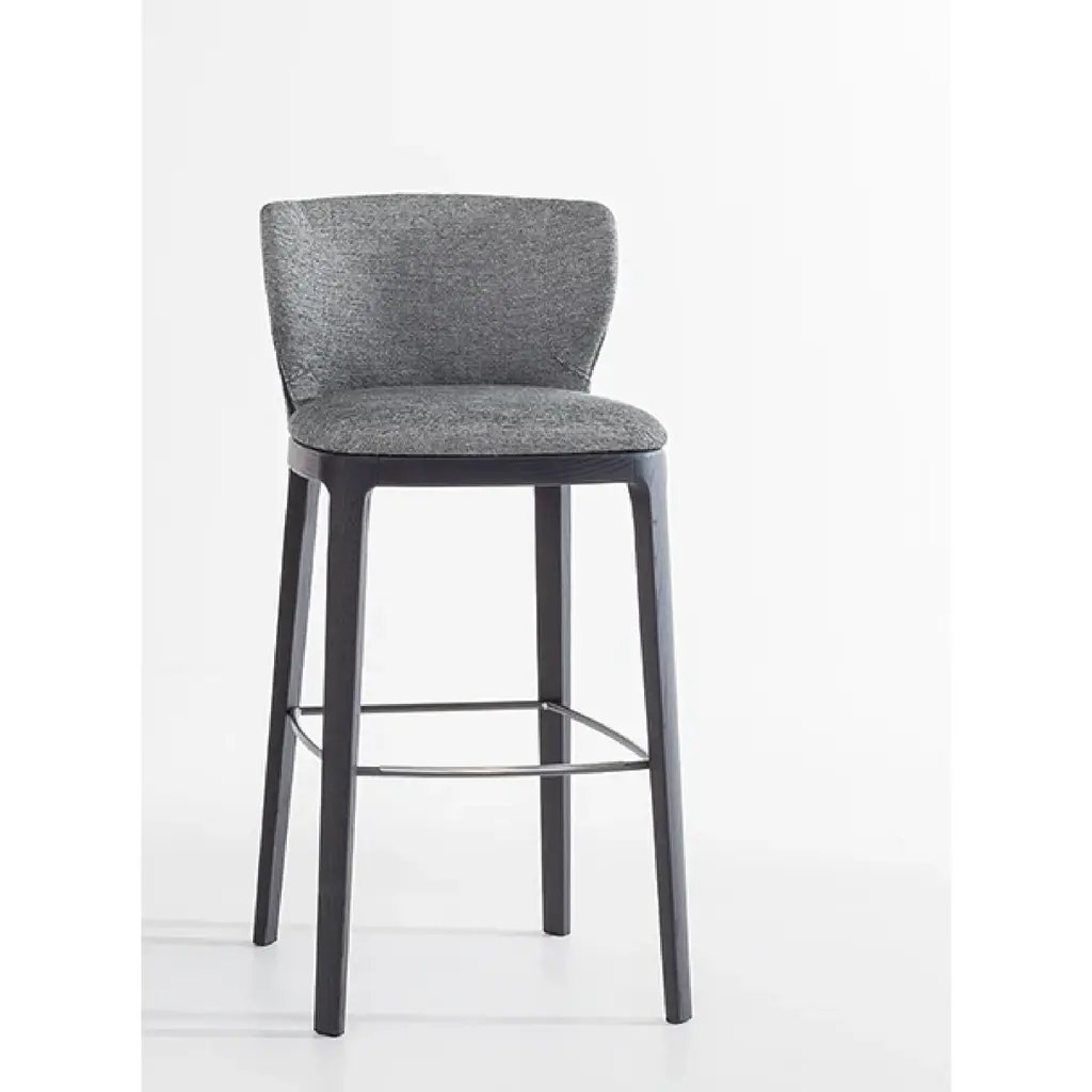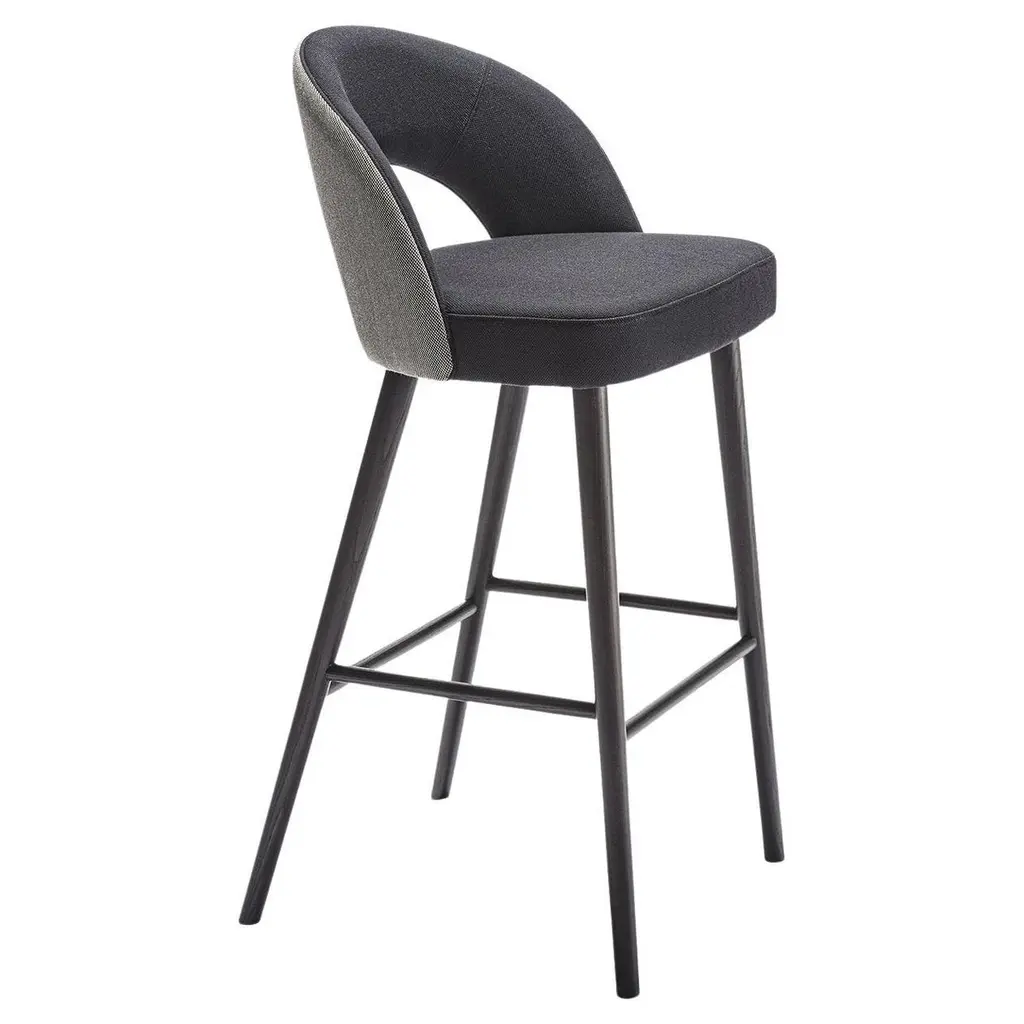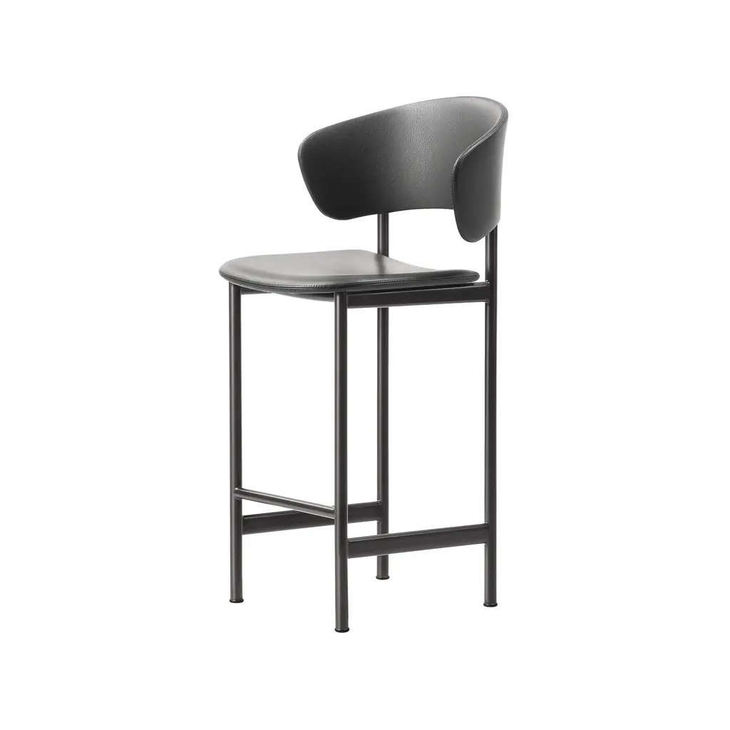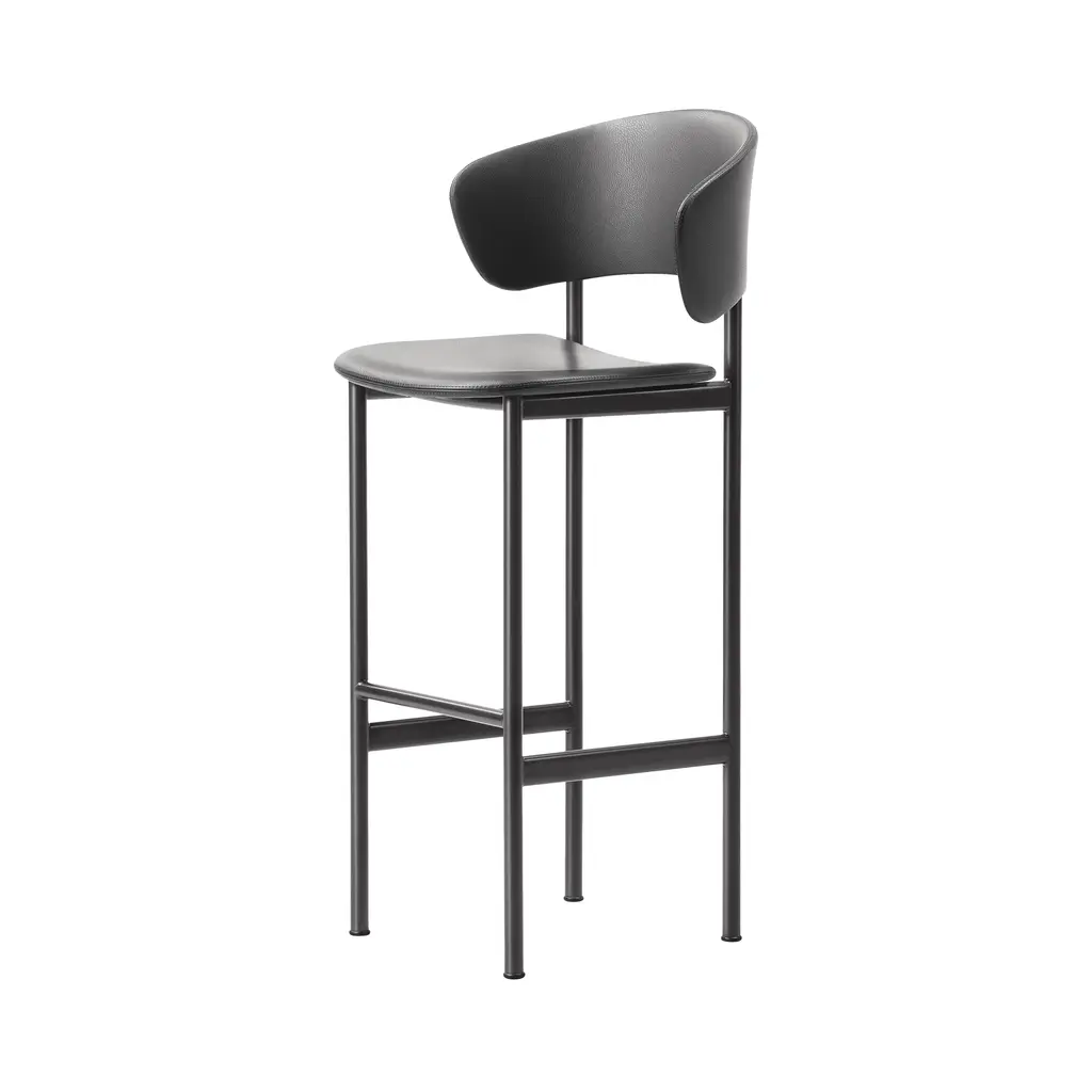 Built with a tubular steel frame, this barstool features a fully upholstered seat and backrest supported by armrests for added stability. Its slim profile and supportive design make it well-suited for high-use spaces like restaurants, bars, and communal work areas. The frame is available in several powder-coated and brushed steel finishes, while the upholstery can be customized in a range of textiles and leathers. Designed for circularity, the stool is made with modular components to allow for easy repair, replacement, and recycling. Offered in two height options to accommodate counter or bar seating.