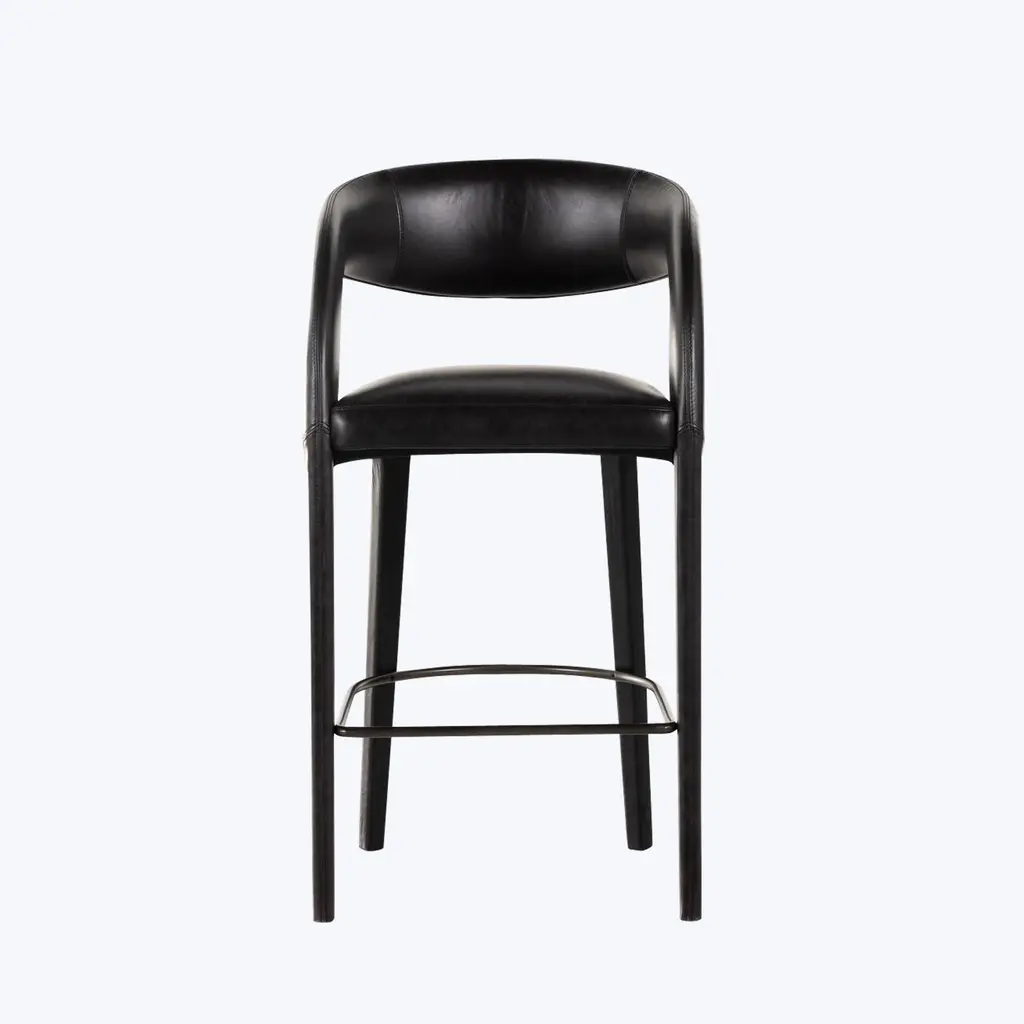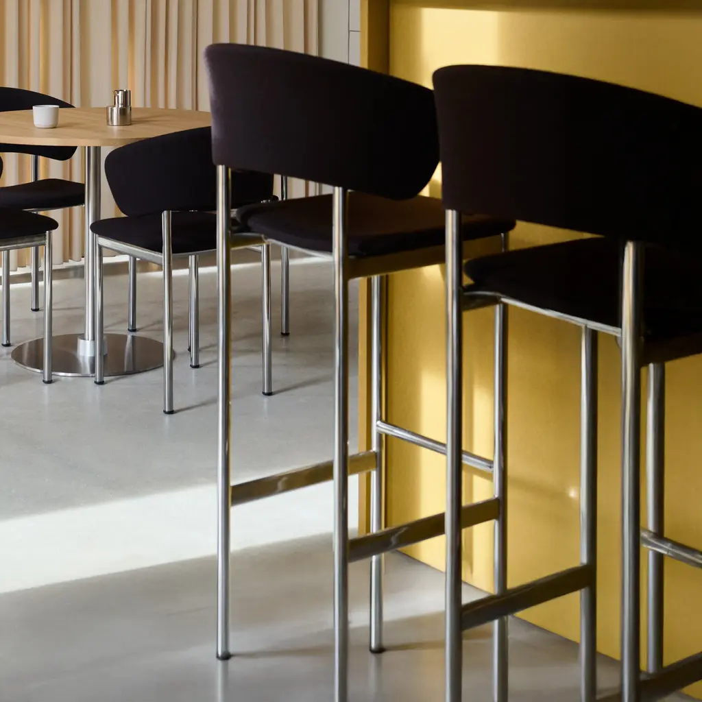 Built with a tubular steel frame, this barstool features a fully upholstered seat and backrest supported by armrests for added stability. Its slim profile and supportive design make it well-suited for high-use spaces like restaurants, bars, and communal work areas. The frame is available in several powder-coated and brushed steel finishes, while the upholstery can be customized in a range of textiles and leathers. Designed for circularity, the stool is made with modular components to allow for easy repair, replacement, and recycling. Offered in two height options to accommodate counter or bar seating.