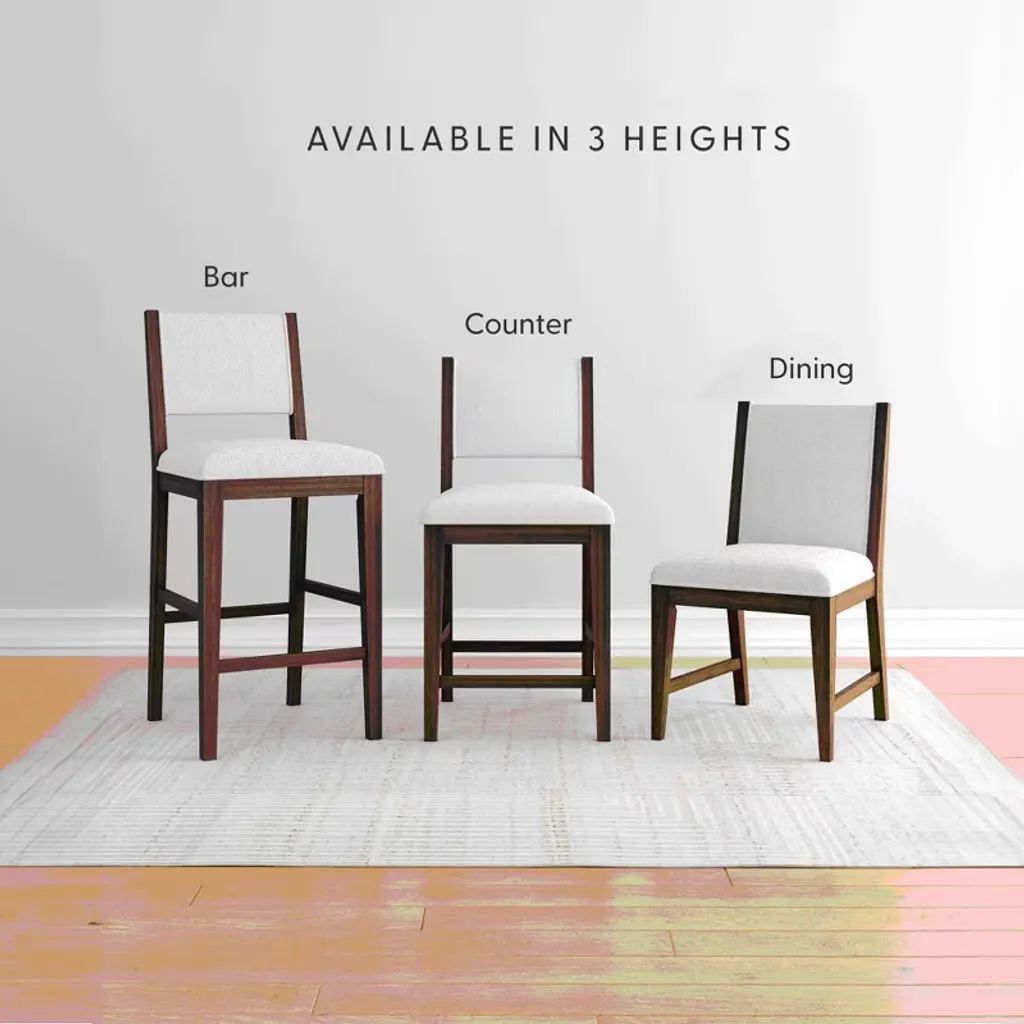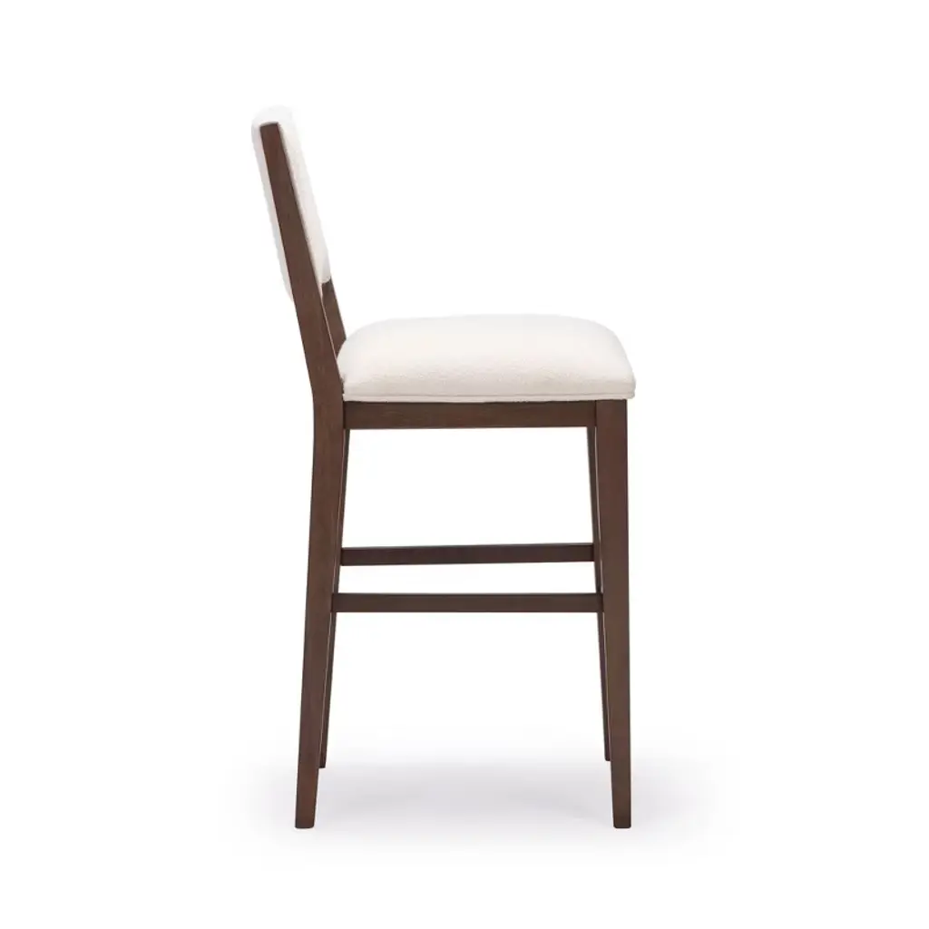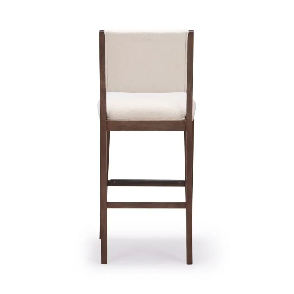 Comfort and fashion-forward design meet in the Plank+Beam Sereno Bar Chair. Perfect for your family and friend gatherings, this upholstered bar stool features a soft, ivory bouclé seat and backrest to maximize comfort. Crafted with a solid rubberwood frame with a cerused, oak-like texture and a metal footrest, this upholstered bar-height chair has a strong and sturdy design that complements your healthy living space with clean, low-VOC materials. The ivory polyester bouclé is simple to spot clean with a damp cloth. This bouclé bar stool pairs perfectly with tall kitchen counters, islands, and bar-height dining tables. Coastal upholstered chairs for kitchen island are easy to assemble with instructions, tools, and hardware included. Bring functional style to your spaces with the Sereno Bar Chair from Plank+Beam.