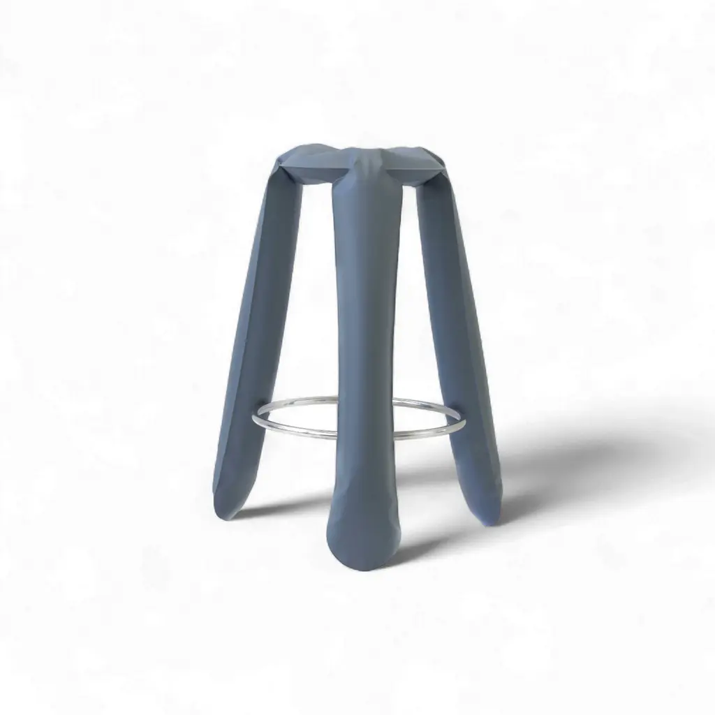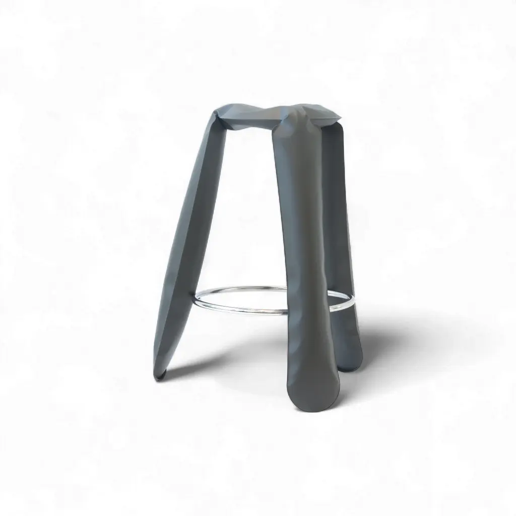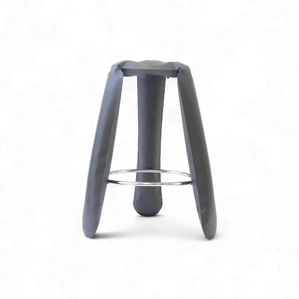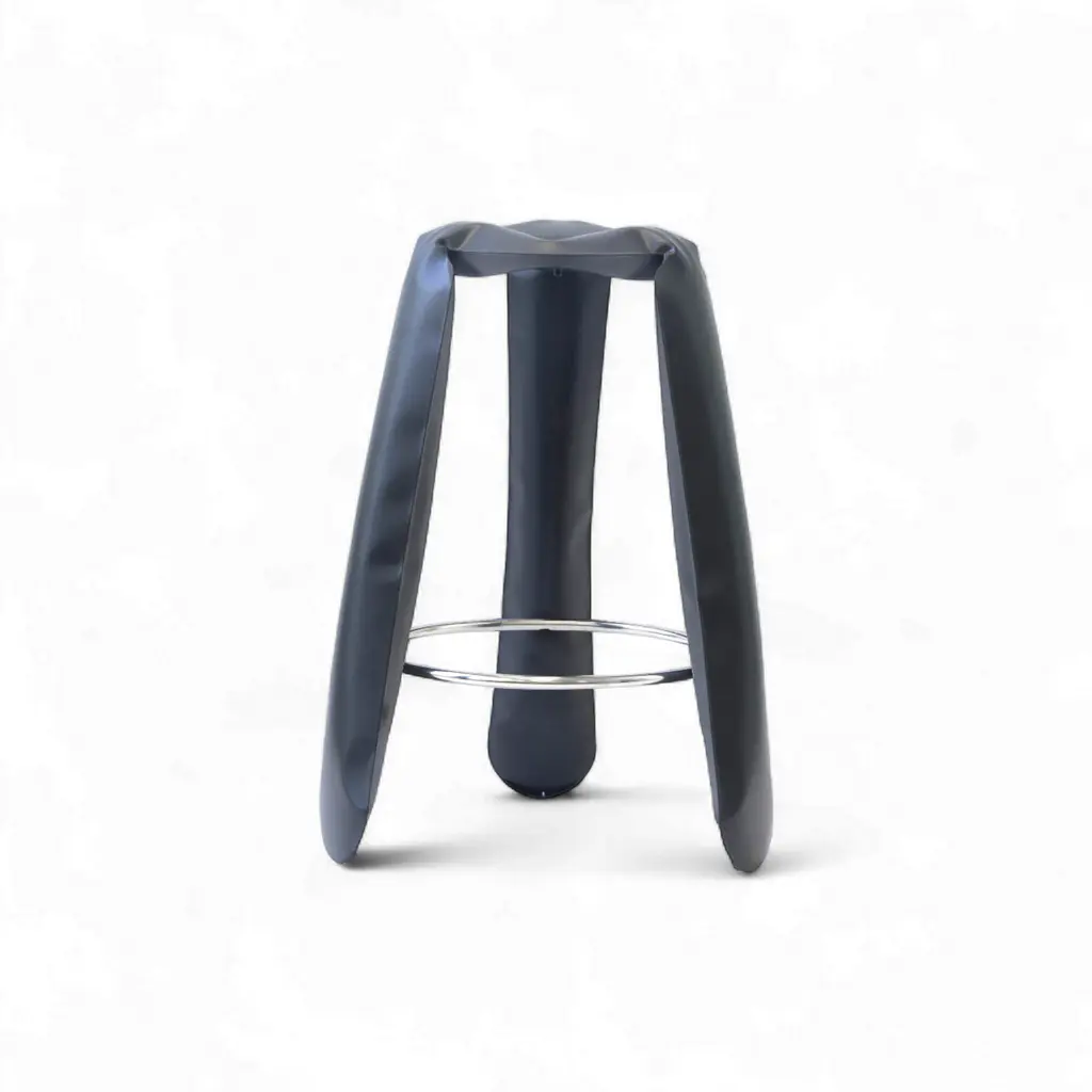 Bar height, three “inflated” legs-Looks crazy, sits rock steady. Plopp is designed by Oskar Zięta and made with FiDU: two super-thin steel sheets are welded, and then inflated by air to a certain volume. Each wrinkle is an original; no two stools crease alike. A bar version scales the icon up and adds a circular footrest so that perching feels natural. Surfaces reflect light like liquid metal in polished finishes, or read graphic in powder-coat colors. Put one at a kitchen island or line up a few at an home bar, or specify in hospitality where you want personality without fuss. Clean with a soft cloth; no abrasives. Seat height: 29.5″ or 75 cm. Material: FiDU-formed steel, surfaces from mirror-bright Inox to hard powder coats.