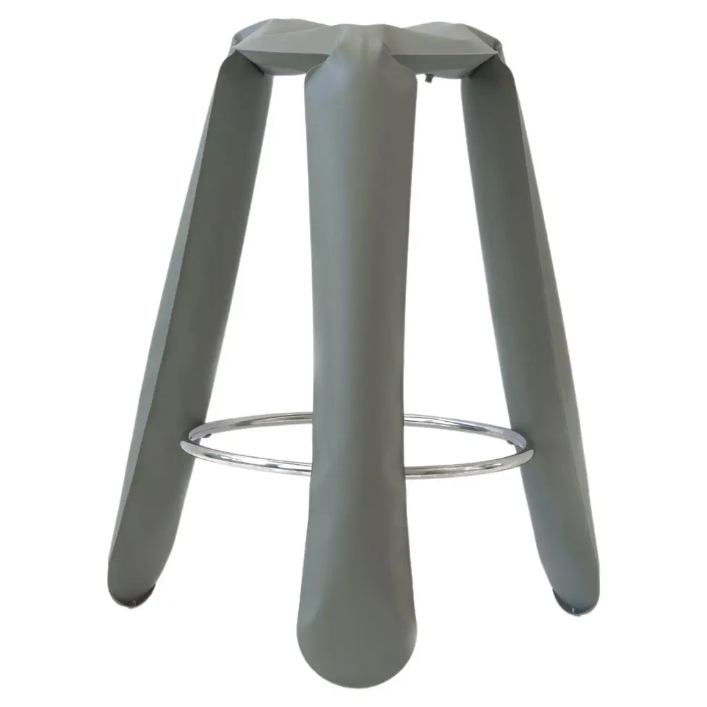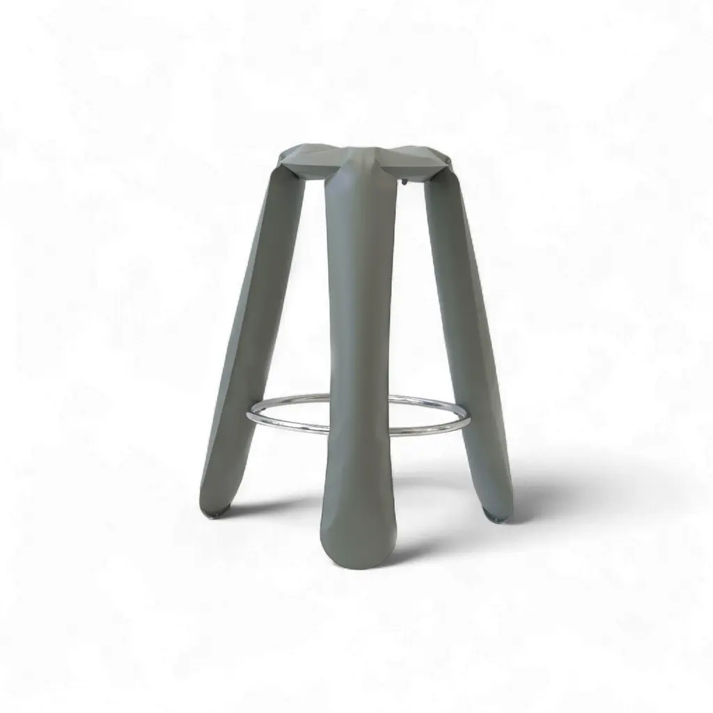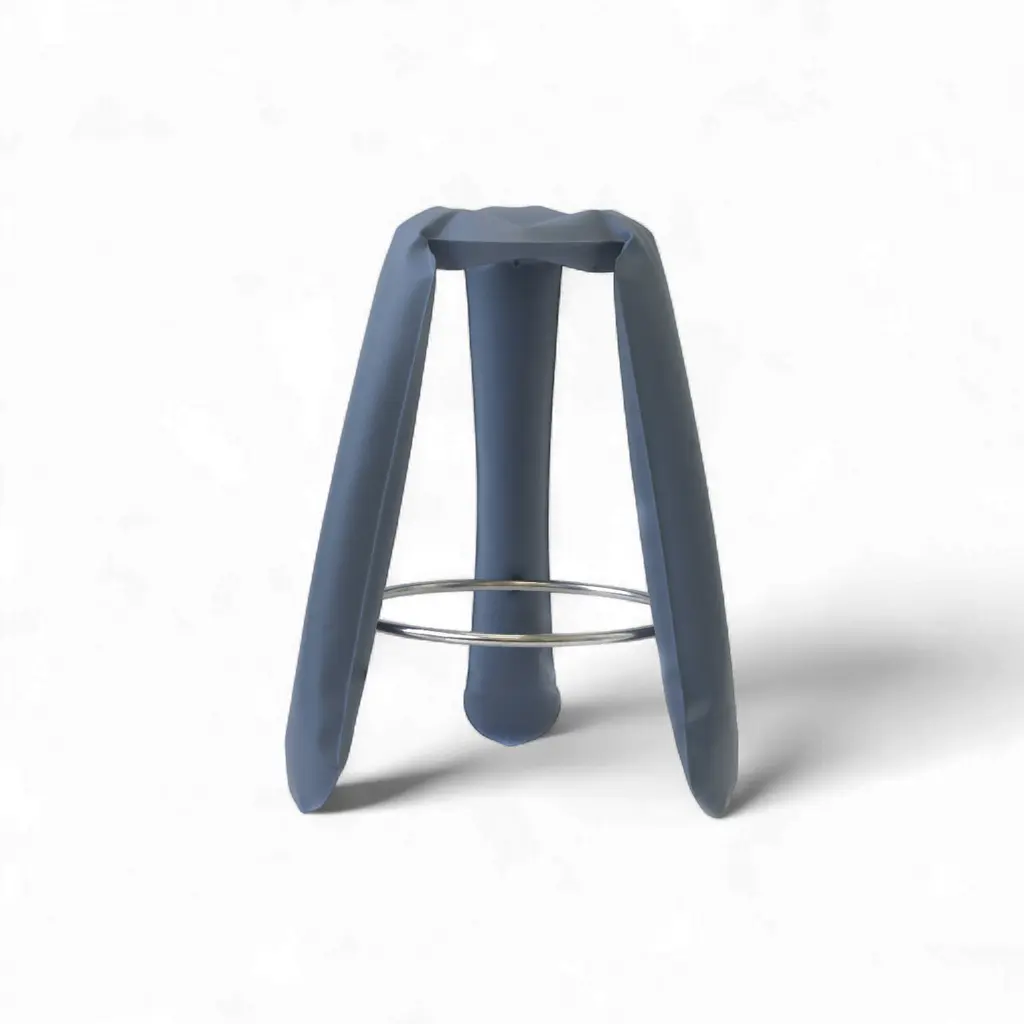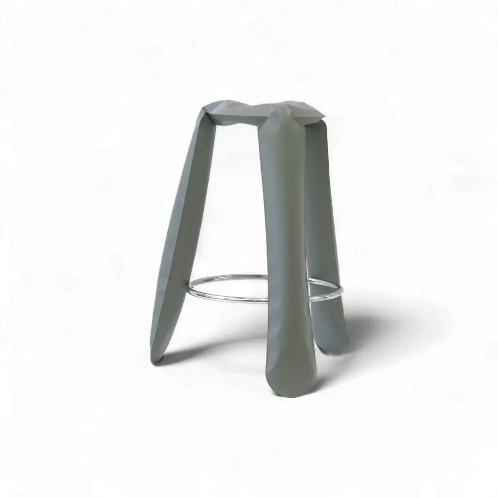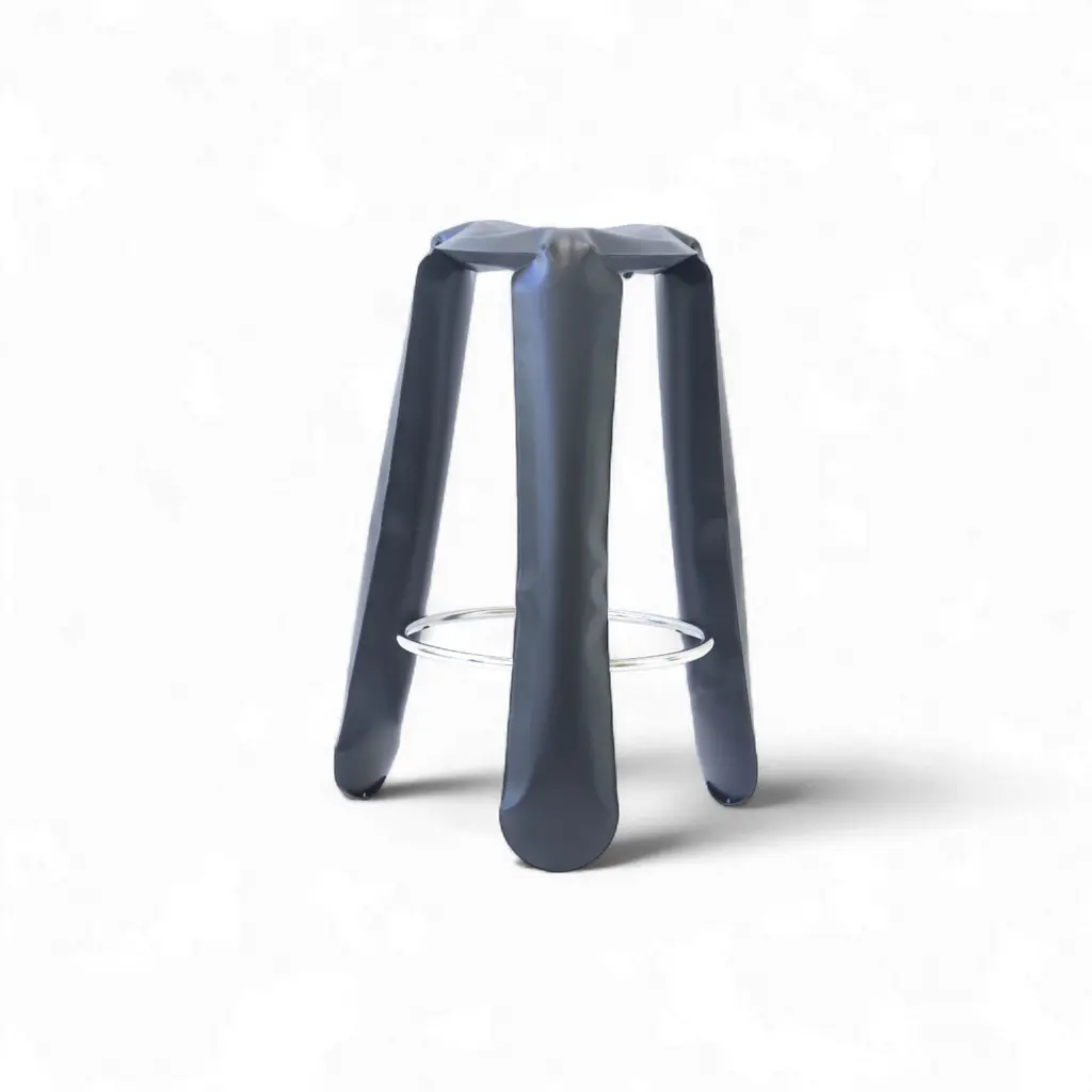 Bar height, three “inflated” legs-Looks crazy, sits rock steady. Plopp is designed by Oskar Zięta and made with FiDU: two super-thin steel sheets are welded, and then inflated by air to a certain volume. Each wrinkle is an original; no two stools crease alike. A bar version scales the icon up and adds a circular footrest so that perching feels natural. Surfaces reflect light like liquid metal in polished finishes, or read graphic in powder-coat colors. Put one at a kitchen island or line up a few at an home bar, or specify in hospitality where you want personality without fuss. Clean with a soft cloth; no abrasives. Seat height: 29.5″ or 75 cm. Material: FiDU-formed steel, surfaces from mirror-bright Inox to hard powder coats.