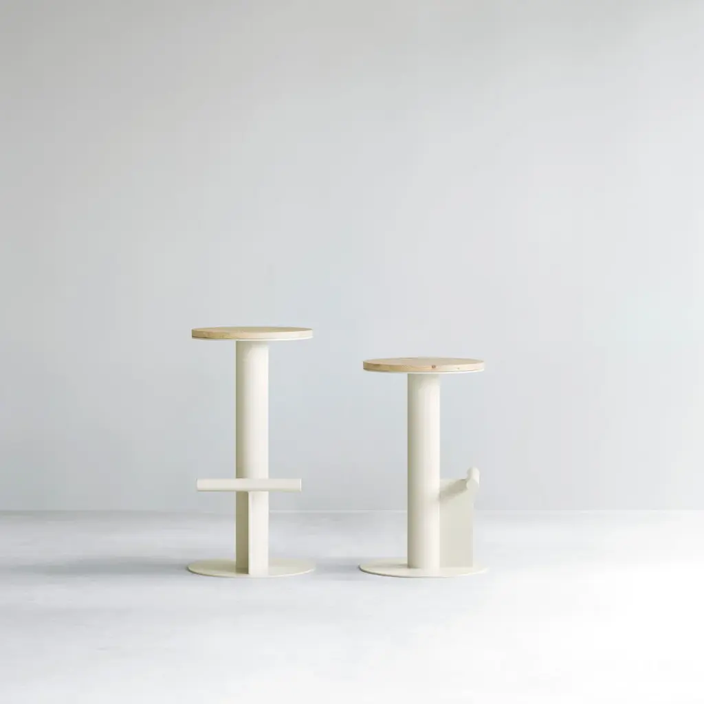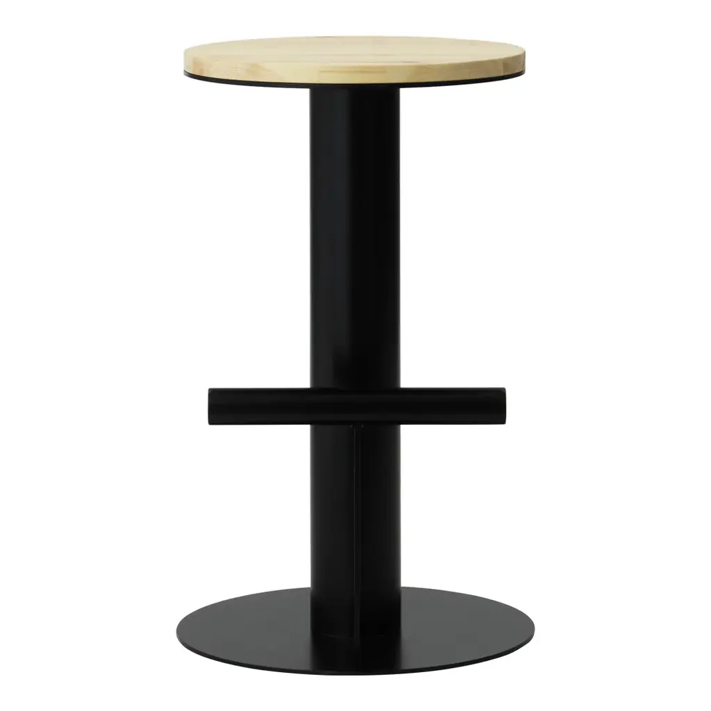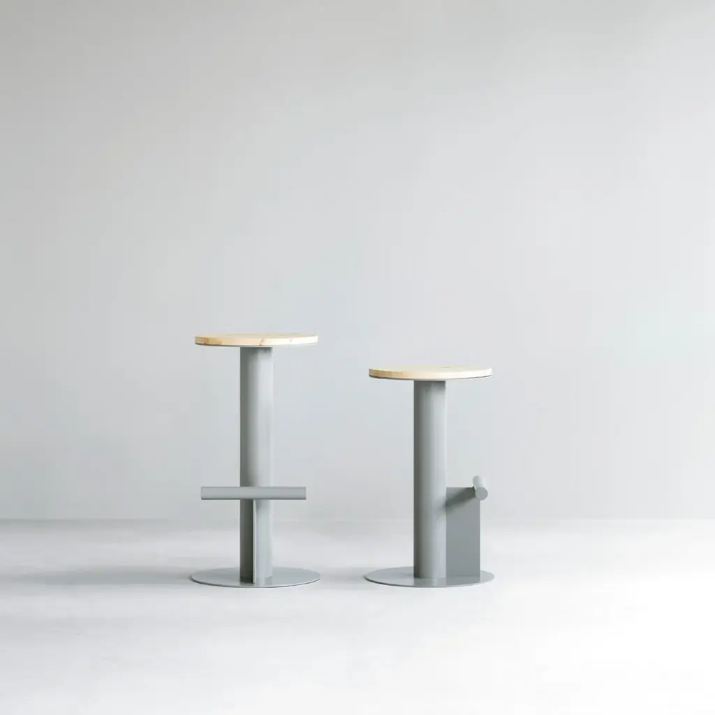 The Pole Barstool is a characterful design full of contrasting geometric elements. A powder-coated steel tube with a smaller tube as a foot piece forms the base, while a circular plate made of solid pine acts as a seat. The Pole Barstool is available in two different heights of 65 cm or 75 cm and in a number of different color combinations.