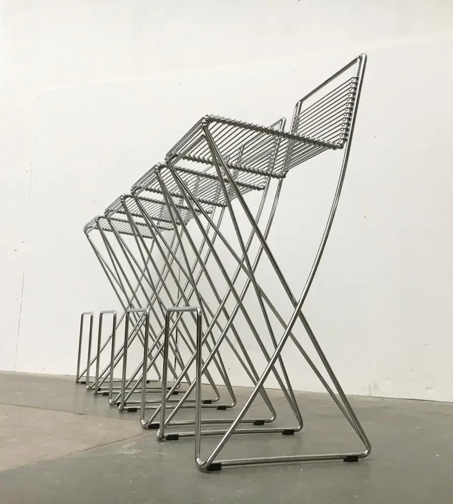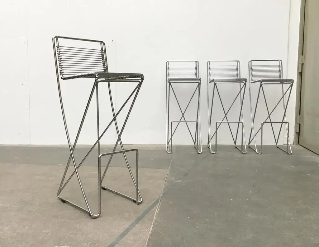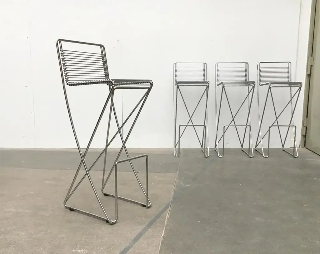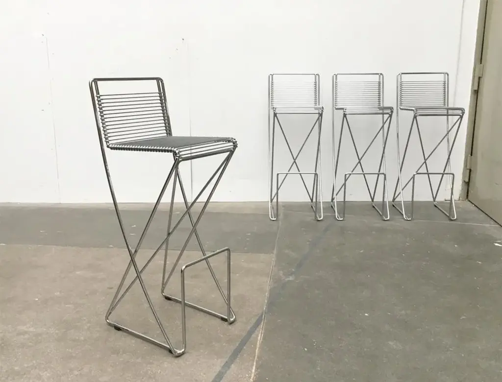 Elegant design classic by Prof. Till Behrens in the Bar stool version. The further development of the free wing. The stools are made entirely of steel rods, which have been mounted and welded extremely precisely. The unique dynamics of the chair also result from the construction and materiality. The stools adapt to the body movement and swing back and forth. The stools can be stackable and so easy to store. They are equipped with plastic floor lines. This piece has an attribution mark, I am sure that it is completely authentic and take full responsibility for any authenticity issues arising from misattribution