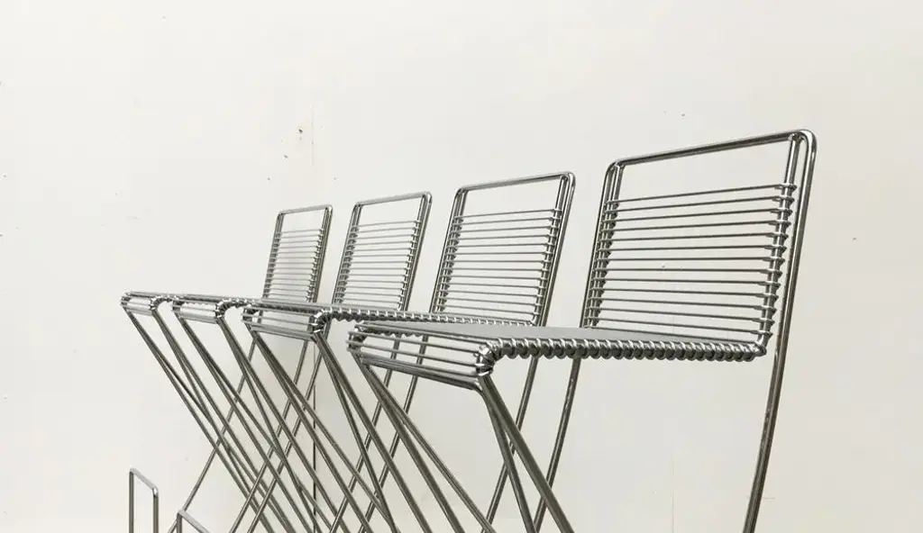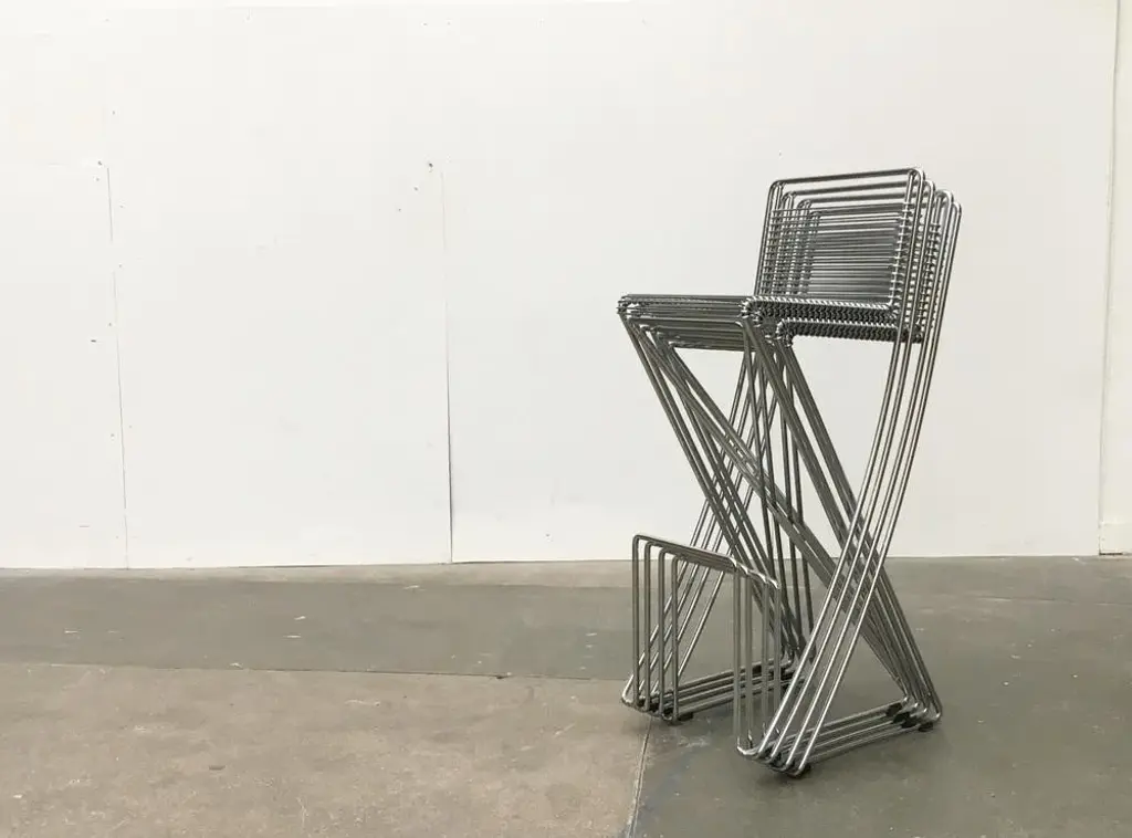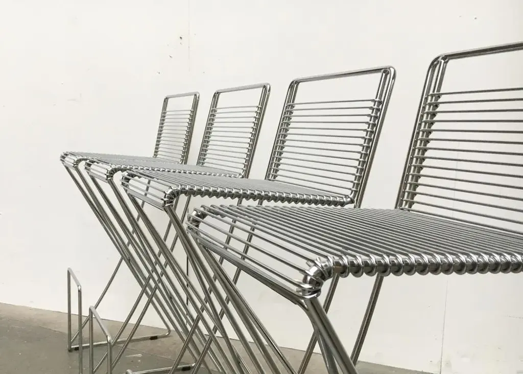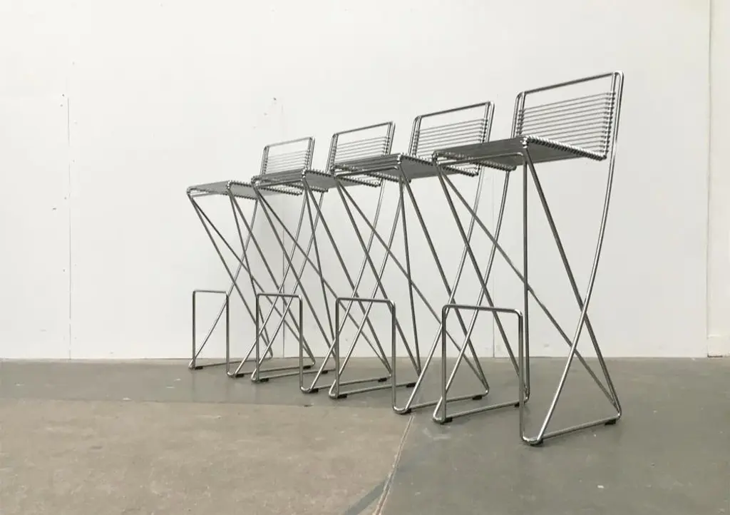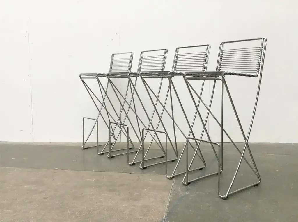 Elegant design classic by Prof. Till Behrens in the Bar stool version. The further development of the free wing. The stools are made entirely of steel rods, which have been mounted and welded extremely precisely. The unique dynamics of the chair also result from the construction and materiality. The stools adapt to the body movement and swing back and forth. The stools can be stackable and so easy to store. They are equipped with plastic floor lines. This piece has an attribution mark, I am sure that it is completely authentic and take full responsibility for any authenticity issues arising from misattribution