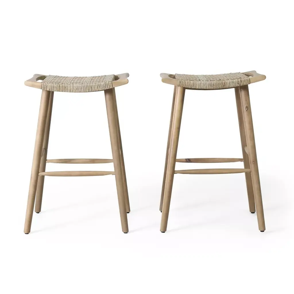Enjoy a chilled drink or two and enjoy the refreshing breeze of the great outdoors in the comfort of your own backyard or patio space. Composed of rich acacia wood and homey flat wicker seating, our rustic stools will complement any outdoor bar or dining set up, bringing an understated flair to even the most unassuming home. These are finished with a smooth appearance and beautifully tapered legs that strike a perfect balance of rustic charm and modern sophistication for all to admire. RUSTIC DESIGN: Match your decor to this rustic style barstool set that brings a rugged, natural beauty to your outdoor space. Including nature-inspired textures and earthy wood materials, our set provides simple yet outstanding design and comfort for all to enjoy. ACACIA WOOD: Made with acacia wood that brings a sleek and exotic look to your space, this durable hardwood naturally withstands outdoor elements and will not darken over time. Acacia wood is perfect as a solid, heavy frame that resists wear and tear. FLAT WICKER SEATING: Featuring a long-lasting polyethylene rattan finish, this style is not only incredibly durable but also provides a versatile appearance. The handcrafted details of this material allow this piece to blend seamlessly with your outdoor decor. DIMENSIONS: Choose an accessory that is the perfect size for you and your furniture. Each barstool is 20.00" W x 14.00" D x 30.00" H. You will love how much your space can transform with the simple addition of this charming stool set. ASSEMBLY REQUIRED: Some assembly is required for this barstool set. All of the instructions and tools needed for assembly are included. This comes as a set of two.