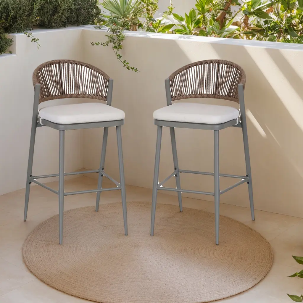 The one-piece seat pan and backrest provide the ultimate in comfort. The patio stool is made of high quality all-weather polyethylene rattan, durable and UV resistant. The grey finished aluminum frame is sturdy and rust-resistant for long-term outdoor use. The all-weather woven resin wicker backrests will relieve back fatigue, and the footrest gives you extra space to rest your legs. The chair has a comfortable seat, and you can spend time enjoying this modern and classic bar stool anytime. What's Included? Features: