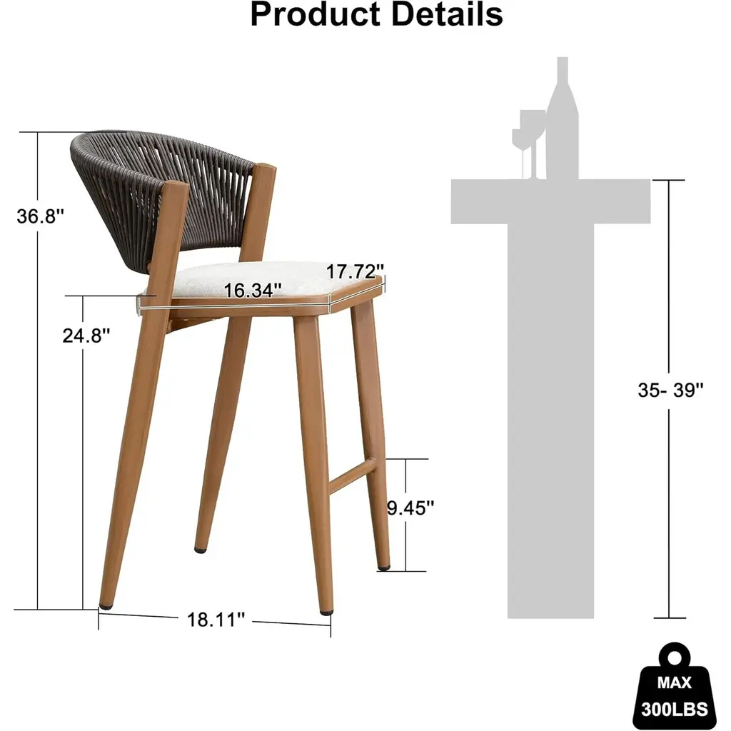 The one-piece seat pan and backrest provide the ultimate in comfort. The patio stool is made of high quality all-weather polyethylene rattan, durable and UV resistant. The grey finished aluminum frame is sturdy and rust-resistant for long-term outdoor use. The all-weather woven resin wicker backrests will relieve back fatigue, and the footrest gives you extra space to rest your legs. The chair has a comfortable seat, and you can spend time enjoying this modern and classic bar stool anytime. What's Included? Features: