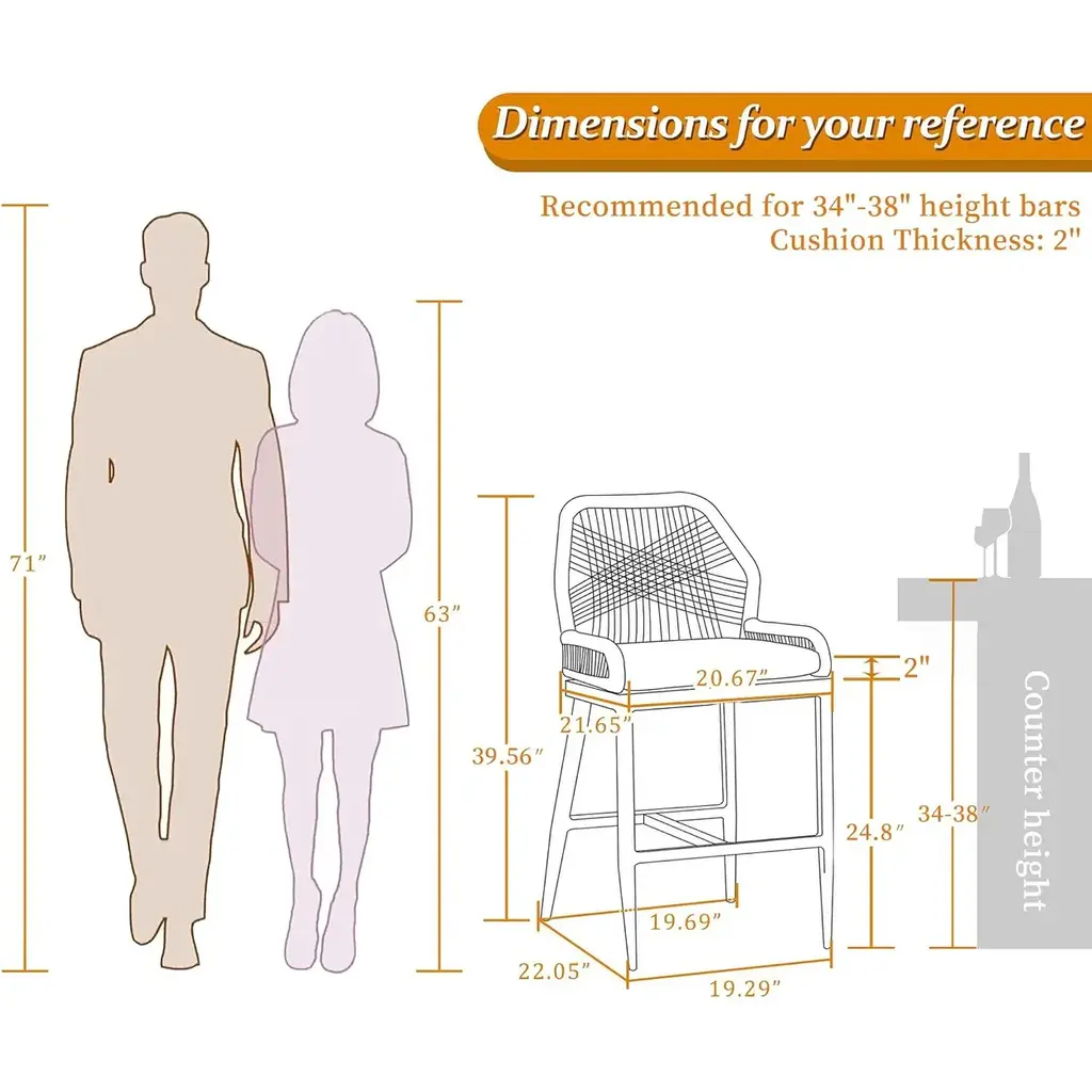 The outdoor patio aluminum bar Stool Chair with cushions are sure to give your home a new look.The one-piece seat pan and backrest provide the ultimate in comfort. The patio stool is made of high quality all-weather polyethylene rattan, durable and UV resistant. The grey finished aluminum frame is sturdy and rust-resistant for long-term outdoor use. A kind of special comfort can be reached by being seated on PURPLE LEAF collection with super soft foam inside and the ergonomically balanced back.What's Included? Features:Product Dimensions: