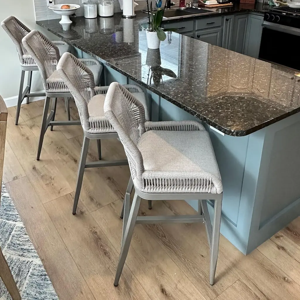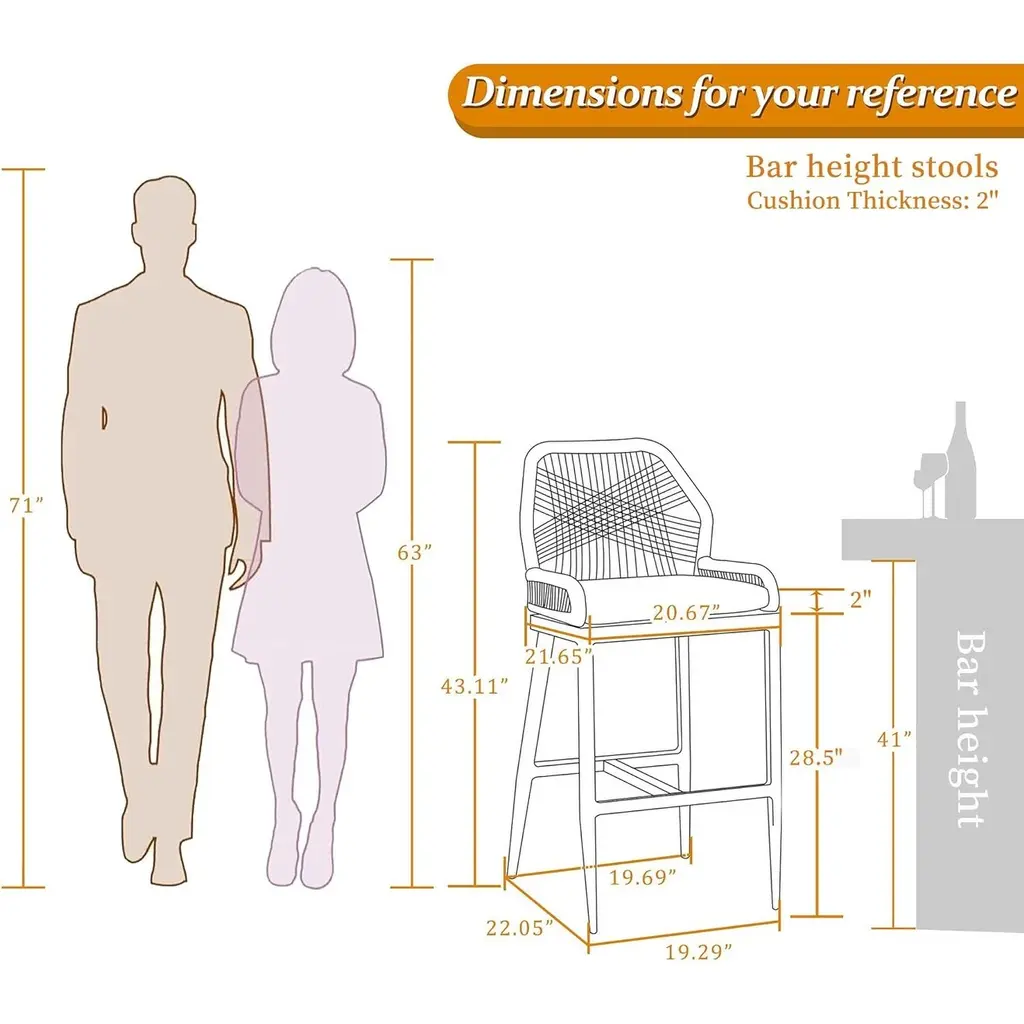 The outdoor patio aluminum bar Stool Chair with cushions are sure to give your home a new look.The one-piece seat pan and backrest provide the ultimate in comfort. The patio stool is made of high quality all-weather polyethylene rattan, durable and UV resistant. The grey finished aluminum frame is sturdy and rust-resistant for long-term outdoor use. A kind of special comfort can be reached by being seated on PURPLE LEAF collection with super soft foam inside and the ergonomically balanced back.What's Included? Features:Product Dimensions: