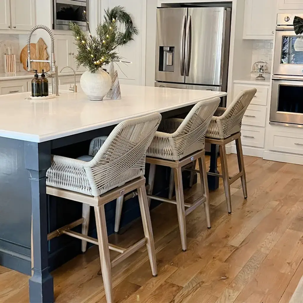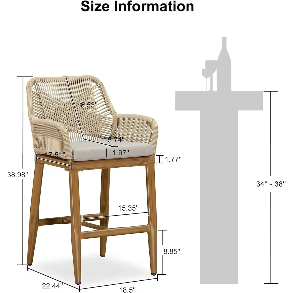 The outdoor patio aluminum chairs with cushions are sure to give your home a new look. The one-piece seat pan and backrest provide the ultimate in comfort. The patio stool is made of high quality all-weather polyethylene rattan, durable and UV resistant. The wood grain aluminum frame is sturdy and rust-resistant for long-term outdoor use. A kind of special comfort can be reached by being seated on PURPLE LEAF collection with super soft foam inside and the ergonomically balanced back.What's Included? 2 set of Barstools Features: