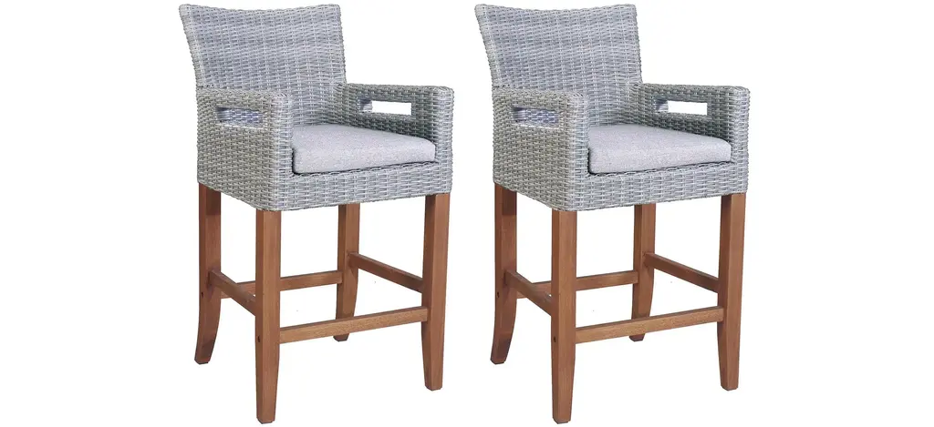 The outdoor patio aluminum chairs with cushions are sure to give your home a new look. The one-piece seat pan and backrest provide the ultimate in comfort. The patio stool is made of high quality all-weather polyethylene rattan, durable and UV resistant. The wood grain aluminum frame is sturdy and rust-resistant for long-term outdoor use. A kind of special comfort can be reached by being seated on PURPLE LEAF collection with super soft foam inside and the ergonomically balanced back.What's Included? 2 set of Barstools Features: