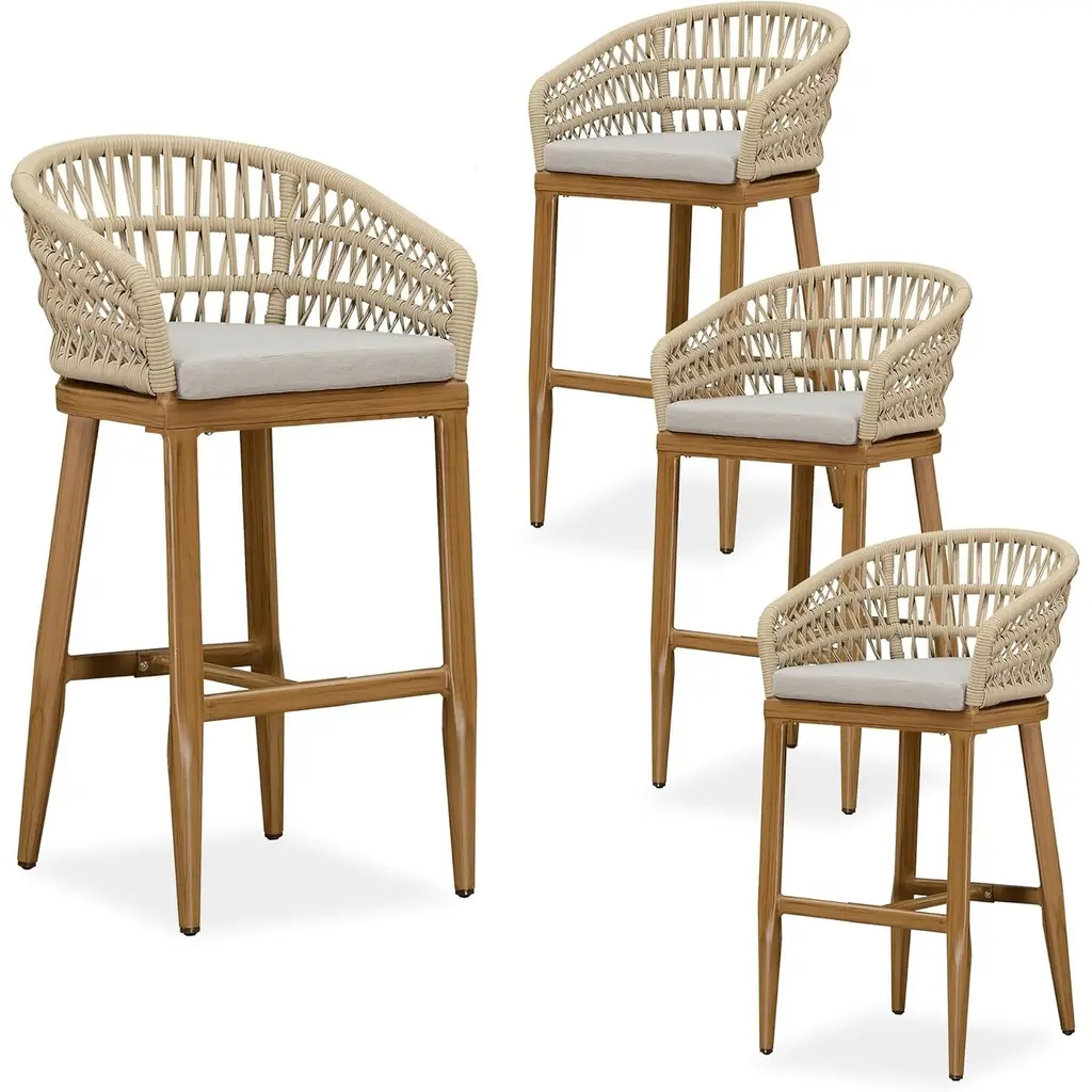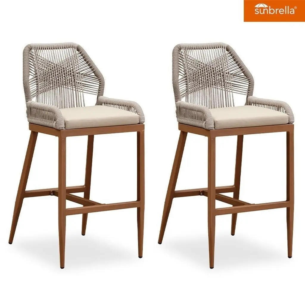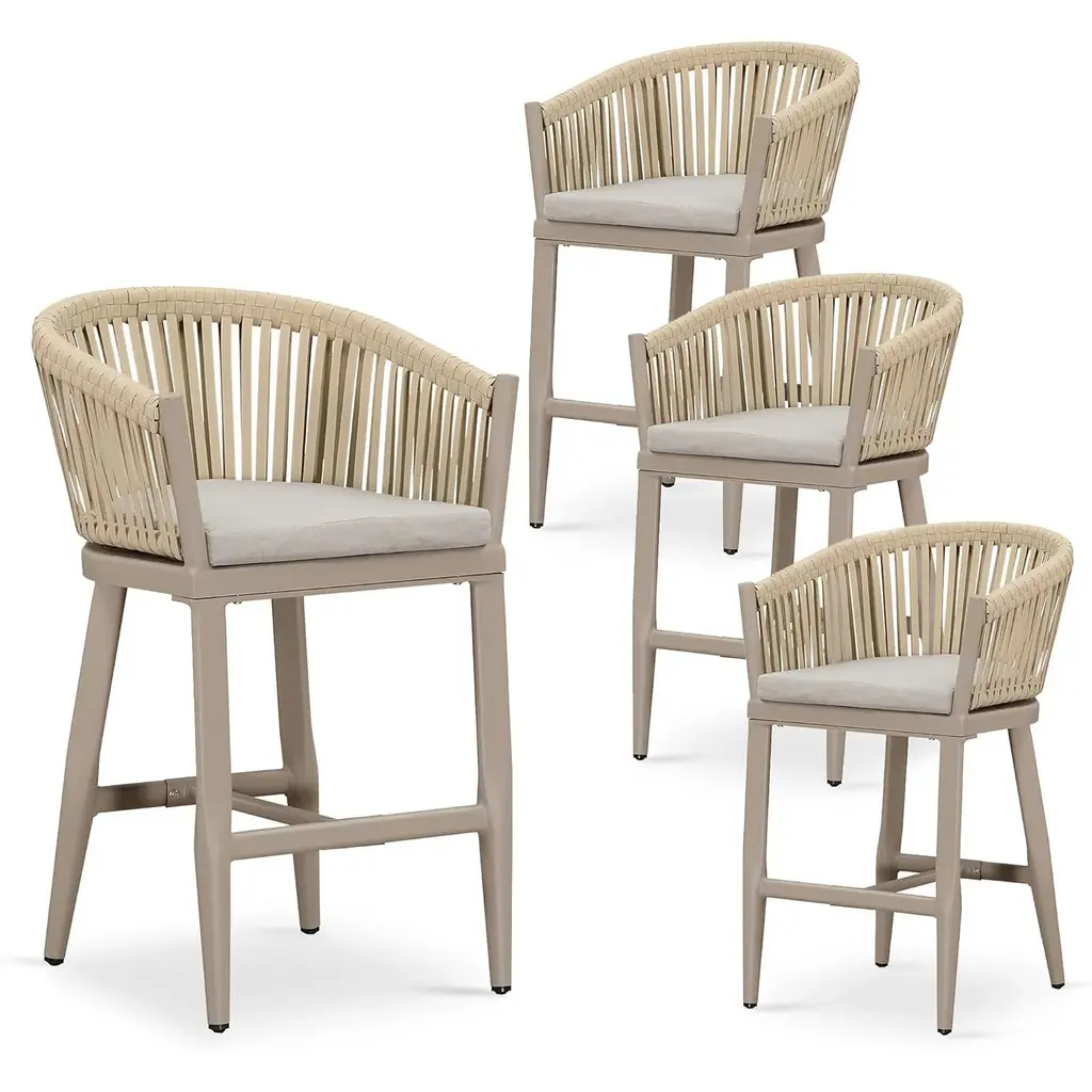 The bar stools is made of modern cross-weaving ropes design, simple and elegant, perfect for modern furniture decoration style, Aluminum frame is durable and not easy to rust, and the backrest is designed with low armchair, comfortable to sit, In addition, the island stool comes with a footrest to relieve pressure on the knee joints while sitting.allowing you to enjoy the leisure time. Features: