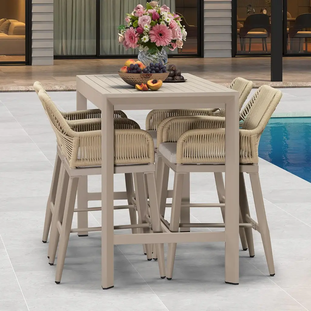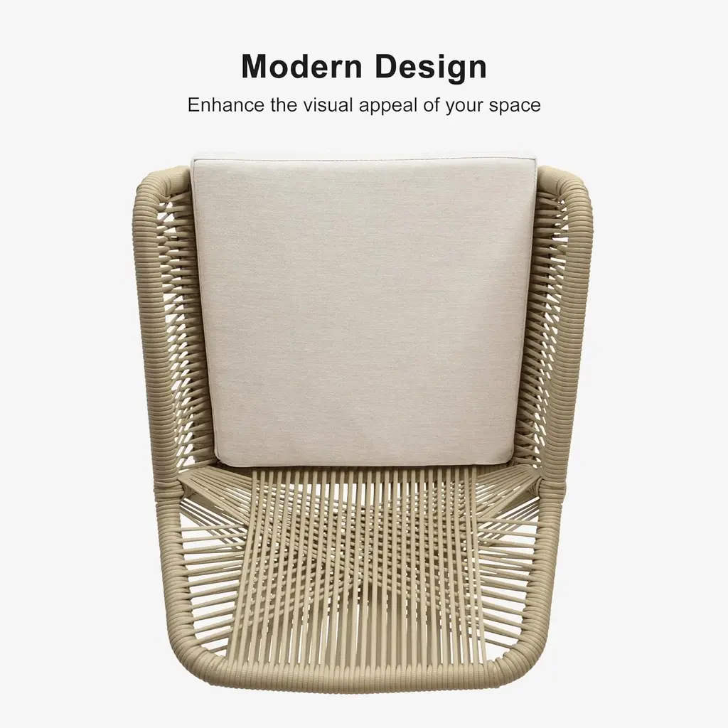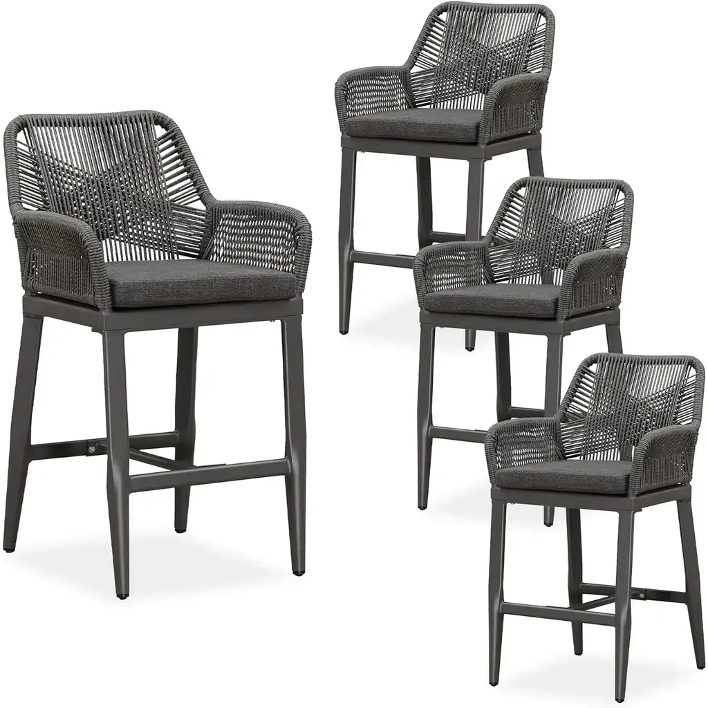 The bar stools is made of modern cross-weaving ropes design, simple and elegant, perfect for modern furniture decoration style, Aluminum frame is durable and not easy to rust, and the backrest is designed with low armchair, comfortable to sit, In addition, the island stool comes with a footrest to relieve pressure on the knee joints while sitting.allowing you to enjoy the leisure time. Feature: