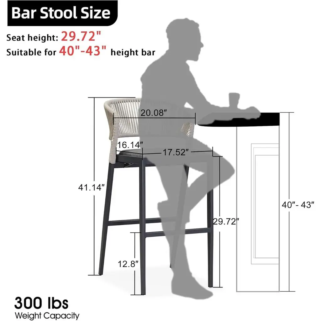 The outdoor patio aluminum bar Stool Chair with cushions are sure to give your home a new look. The one-piece seat pan and backrest provide the ultimate in comfort. The patio stool is made of high quality all-weather polyethylene rattan, durable and UV resistant. The grey finished aluminum frame is sturdy and rust-resistant for long-term outdoor use. What's Included? Features: