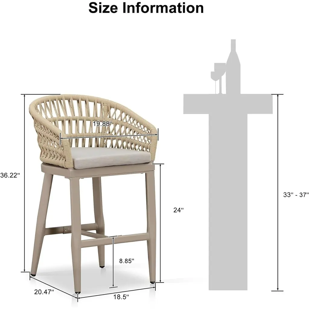 The outdoor patio aluminum chairs with cushions are sure to give your home a new look. The one-piece seat pan and backrest provide the ultimate in comfort. The patio stool is made of high quality all-weather polyethylene rattan, durable and UV resistant. The wood grain aluminum frame is sturdy and rust-resistant for long-term outdoor use. A kind of special comfort can be reached by being seated on PURPLE LEAF collection with super soft foam inside and the ergonomically balanced back.Features:Product Size① Counter stool:20.47"D x 18.5"W x 36.22"H. The max load capacity is up to 360 lbs.② Height bar stools:20.47"D x 18.5"W x 40.75"H. The max load capacity is up to 360 lbs.