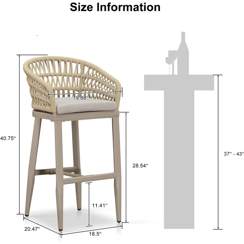 The outdoor patio aluminum chairs with cushions are sure to give your home a new look. The one-piece seat pan and backrest provide the ultimate in comfort. The patio stool is made of high quality all-weather polyethylene rattan, durable and UV resistant. The wood grain aluminum frame is sturdy and rust-resistant for long-term outdoor use. A kind of special comfort can be reached by being seated on PURPLE LEAF collection with super soft foam inside and the ergonomically balanced back.Features:Product Size① Counter stool:20.47"D x 18.5"W x 36.22"H. The max load capacity is up to 360 lbs.② Height bar stools:20.47"D x 18.5"W x 40.75"H. The max load capacity is up to 360 lbs.