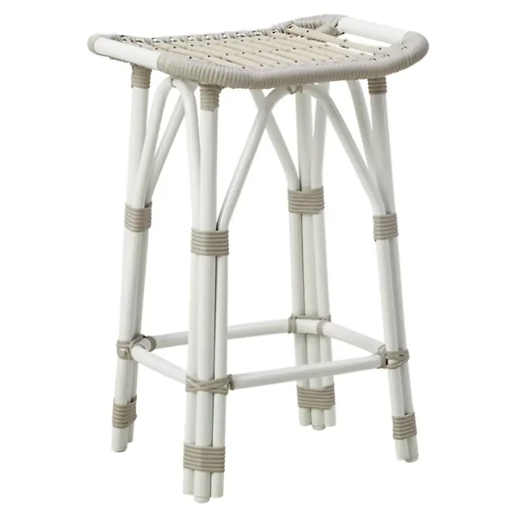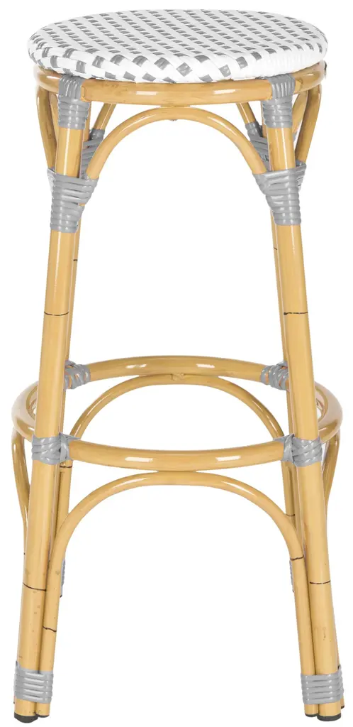 Raise a glass to country and coastal decorating with the grey and white indoor-outdoor barstool from . A colorful addition to a kitchen or patio bar, the pretty is inspired by classic European bistro stools and crafted of white PE wicker and aluminum faux bamboo for easy care. Store outdoor furniture indoors or cover well when not in use. Remove wooden furniture from standing water. Dust regularly with small brush or vacuum. Spills should be taken care of immediately before they harden or stain with a slightly dampened sponge.