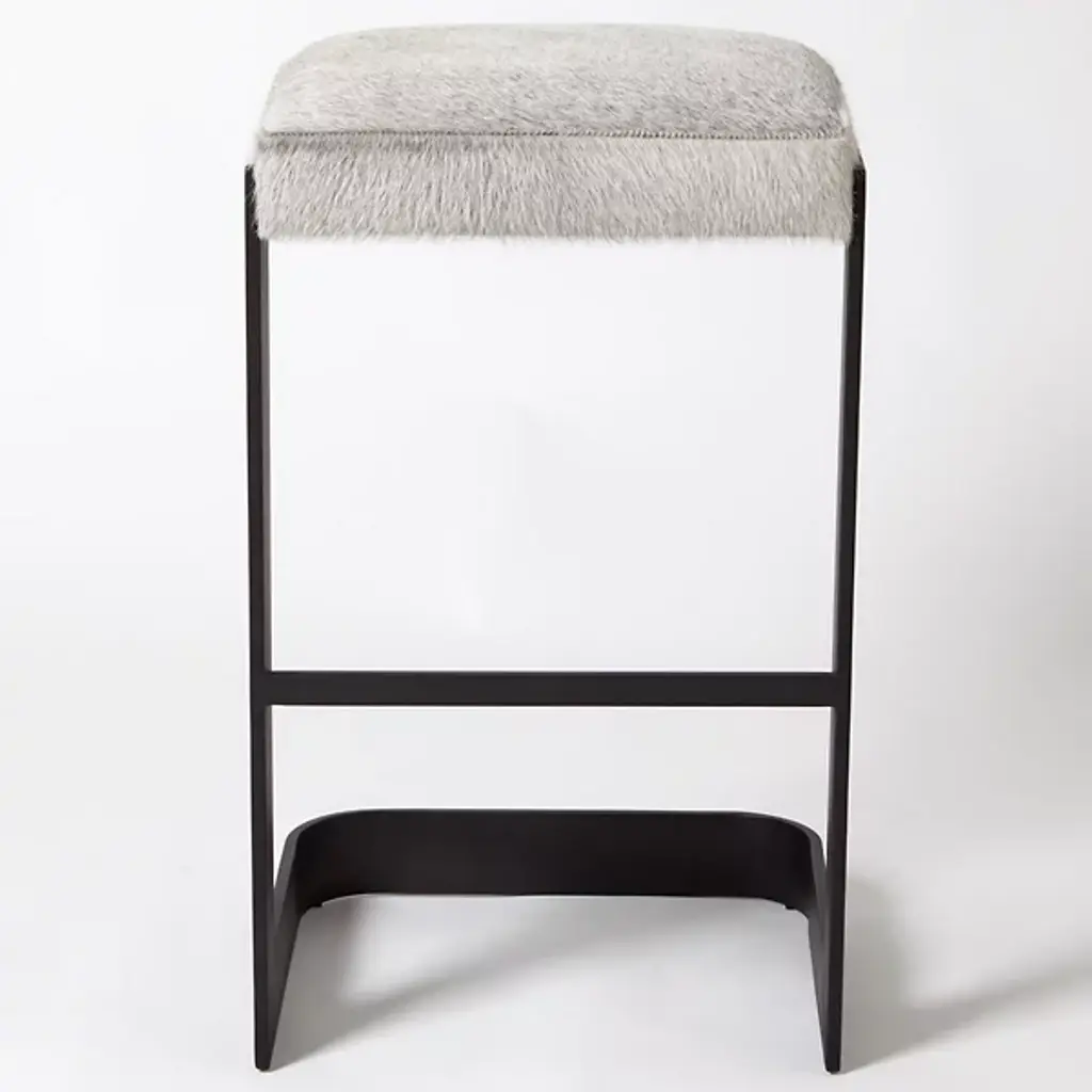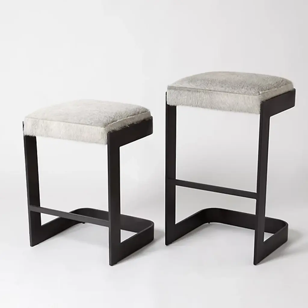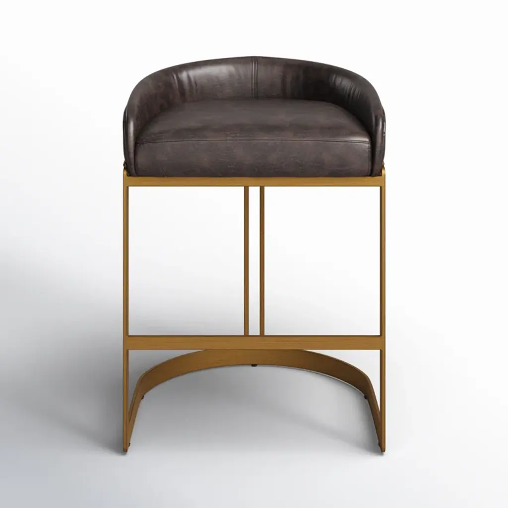 Chic, open, and sophisticated. Sit up with a gracious pose atop the leather upholstered Regan Bar Stool from Global Views. From the front, back, or side profile, this piece surprises in its classy, contemporary frame, made from a seamless band of solid steel. Perpendicular angles created by the base and its seat holder balance the piece out while showcasing a gravity-defying look. The sharpness of the frame elegantly juxtaposes with the plump seat cushion. The leather upholstered cushion provides great support and comfort for long meals and conversation.