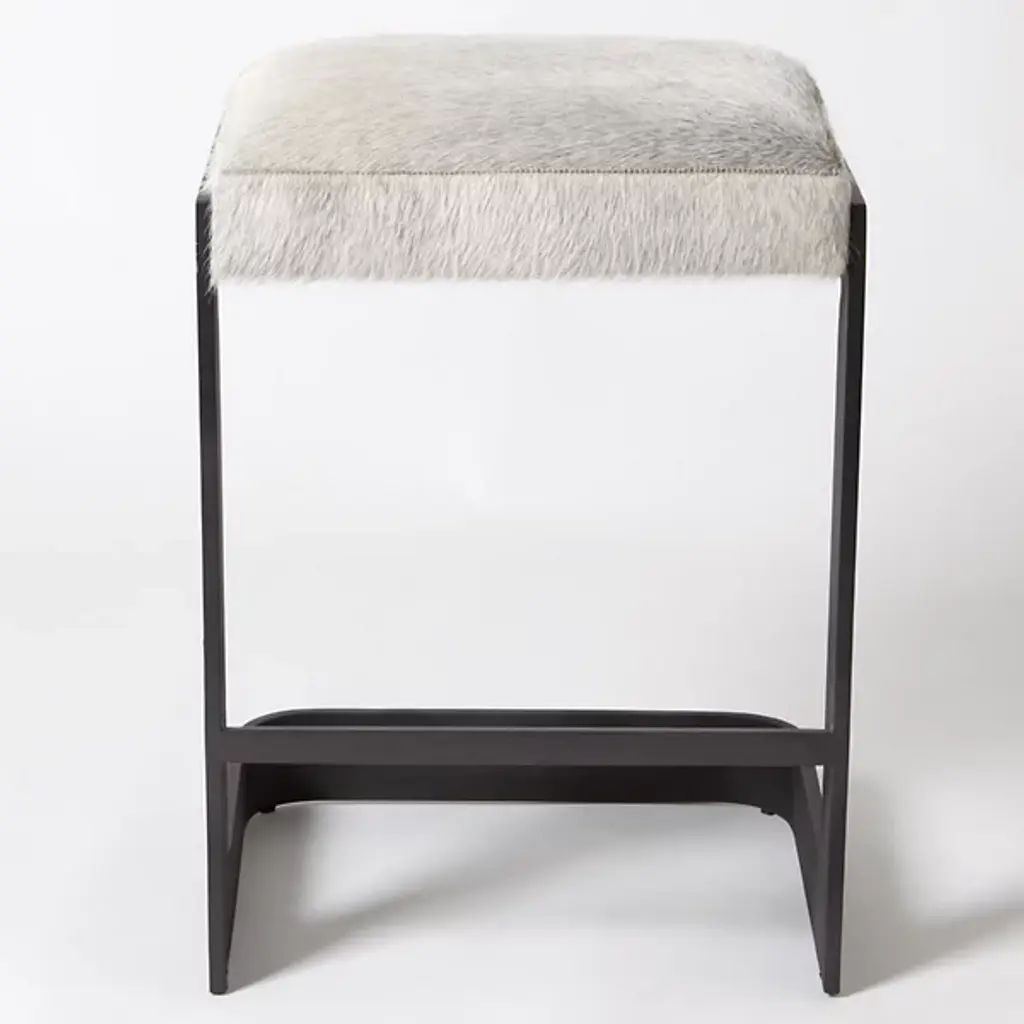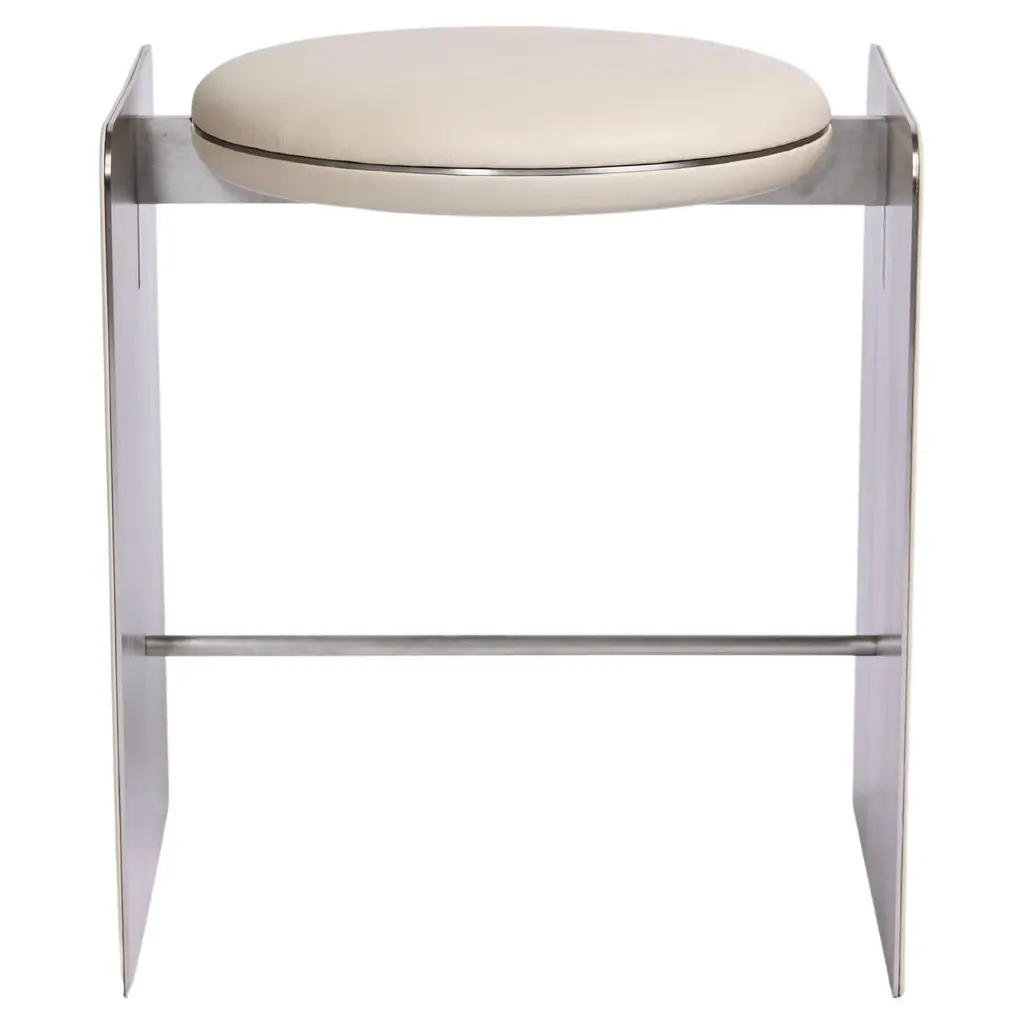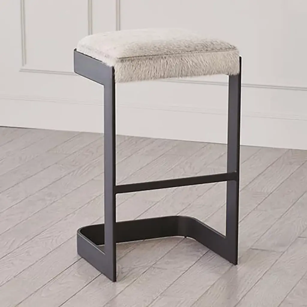 Chic, open, and sophisticated. Sit up with a gracious pose atop the leather upholstered Regan Bar Stool from Global Views. From the front, back, or side profile, this piece surprises in its classy, contemporary frame, made from a seamless band of solid steel. Perpendicular angles created by the base and its seat holder balance the piece out while showcasing a gravity-defying look. The sharpness of the frame elegantly juxtaposes with the plump seat cushion. The leather upholstered cushion provides great support and comfort for long meals and conversation.