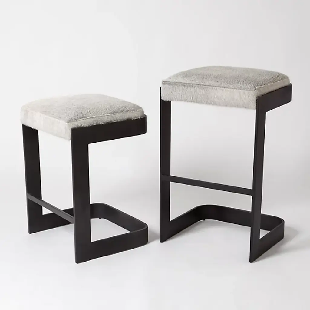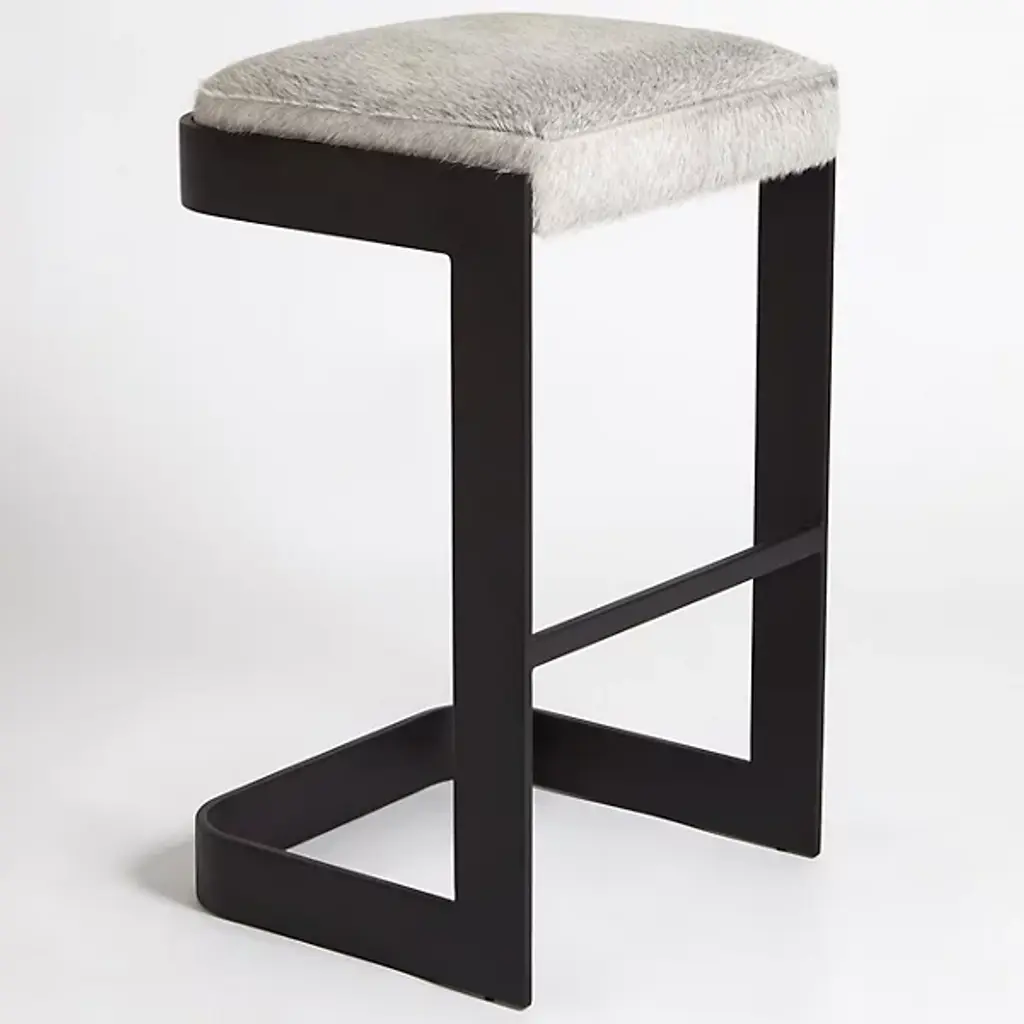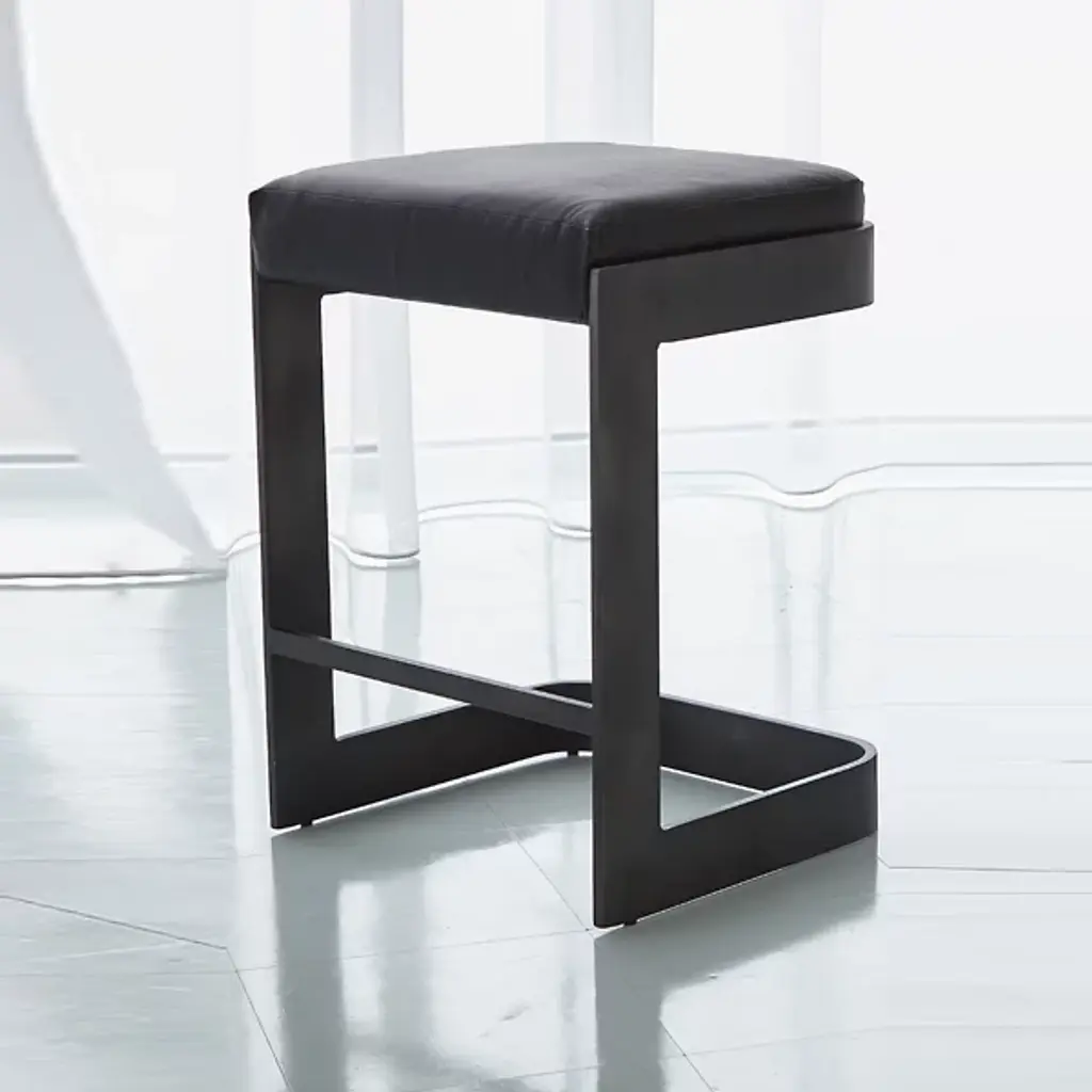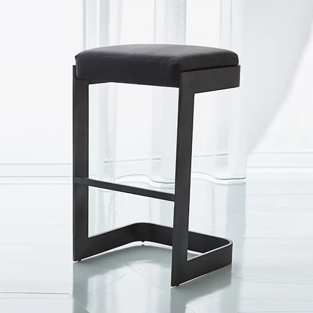 Chic, open, and sophisticated. Sit up with a gracious pose atop the leather upholstered Regan Bar Stool from Global Views. From the front, back, or side profile, this piece surprises in its classy, contemporary frame, made from a seamless band of solid steel. Perpendicular angles created by the base and its seat holder balance the piece out while showcasing a gravity-defying look. The sharpness of the frame elegantly juxtaposes with the plump seat cushion. The leather upholstered cushion provides great support and comfort for long meals and conversation.