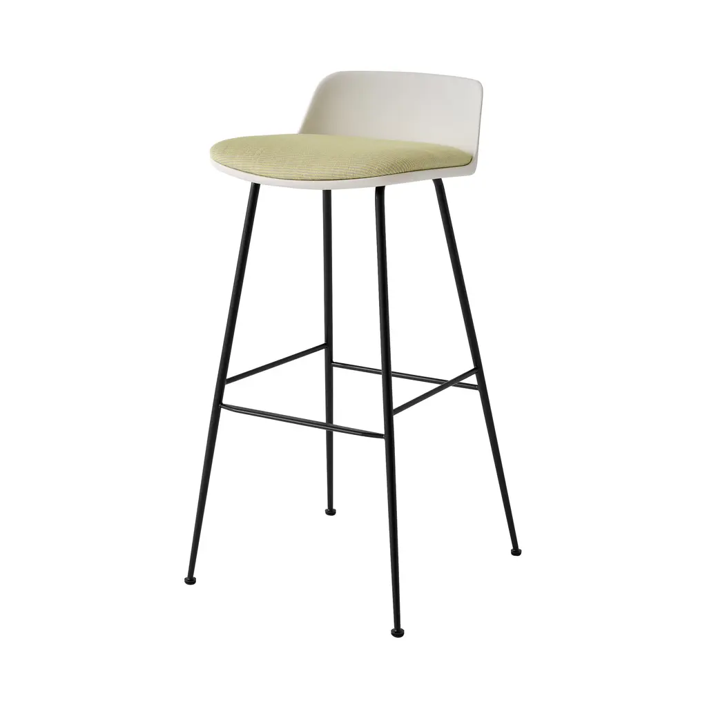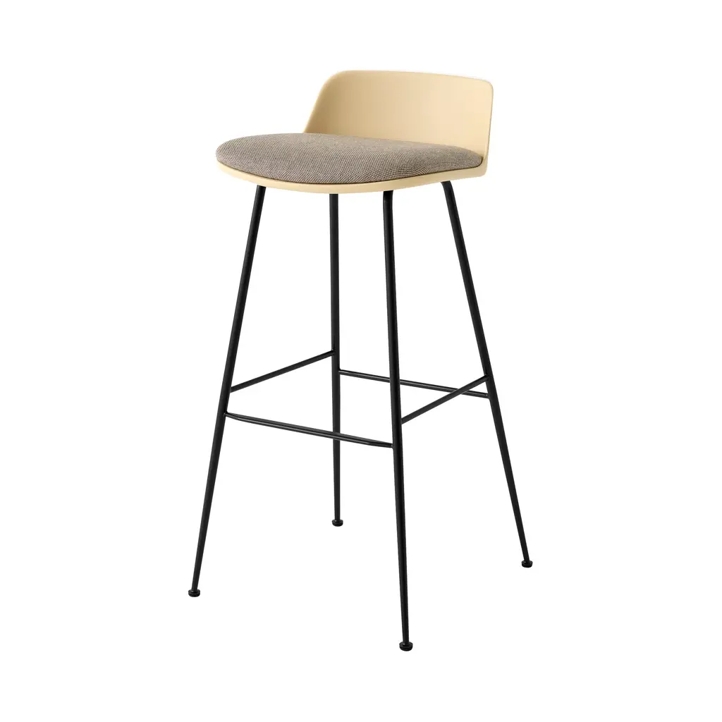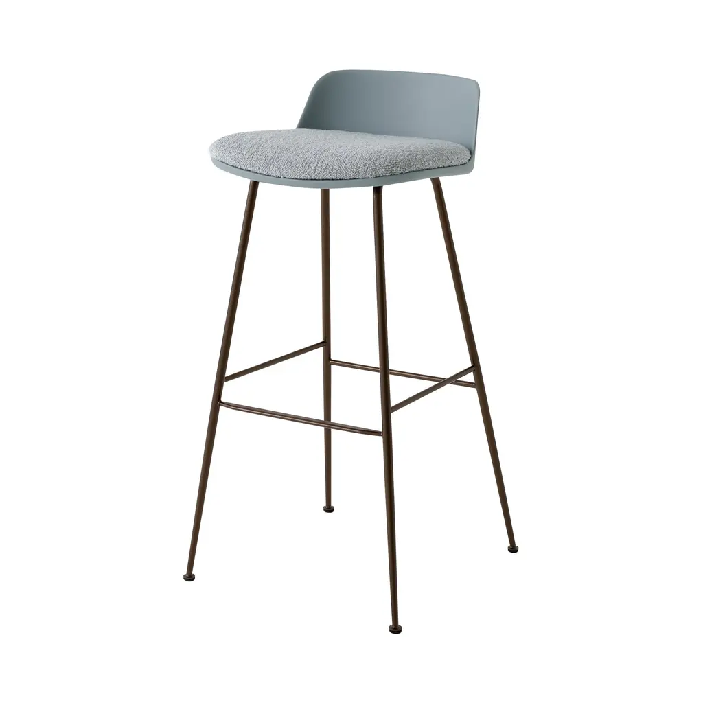 Expanding the Rely series in a bar-height stool with a custom-clad seat cushion, &Tradition further adapts its recycled plastic take on Scandi seating. Whether intended for a workspace, hospitality venue or residence, Hee Welling’s molded seating delivers accommodating comfort within a compact footprint. Upholstery in fine fabric or leather brings individuality as does the option of black or bronzed finish for the steel-tube legs.
