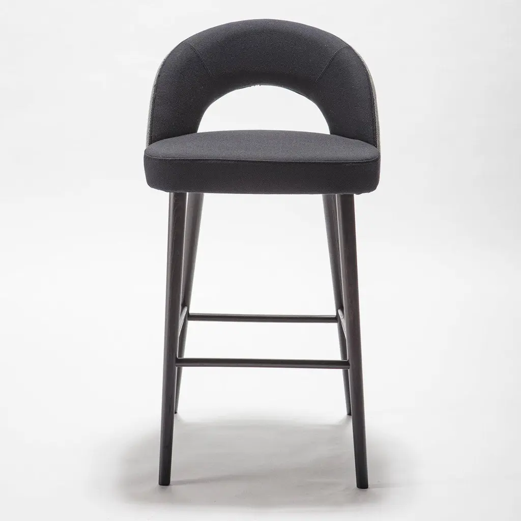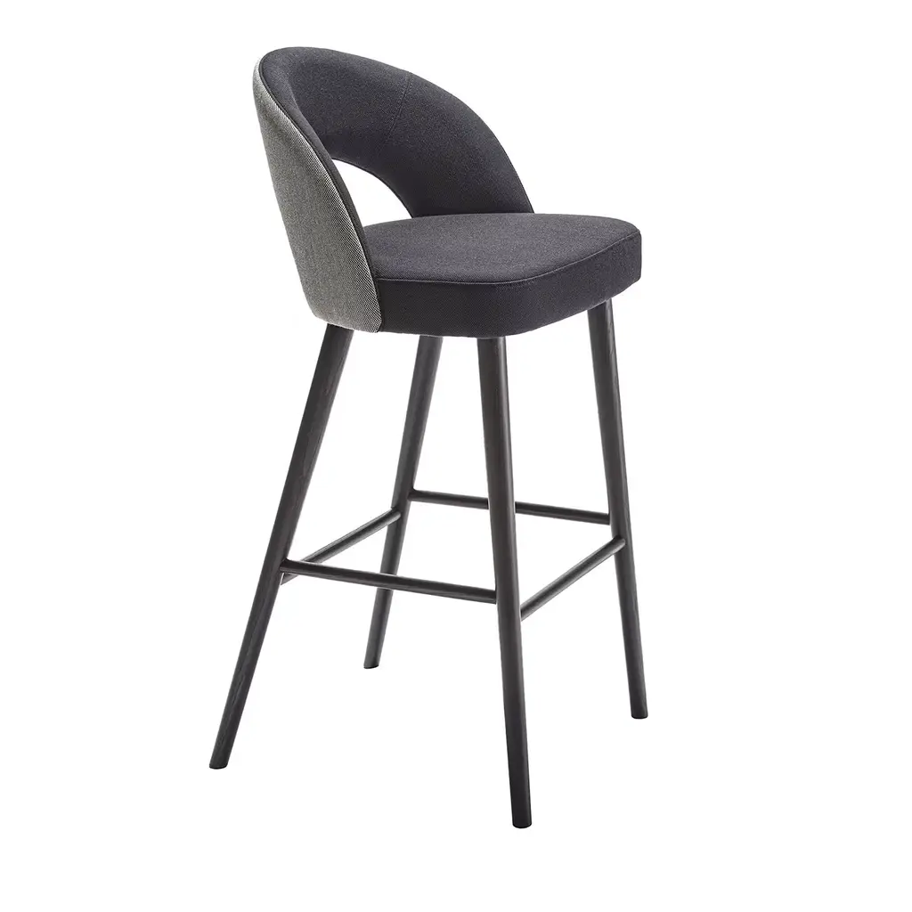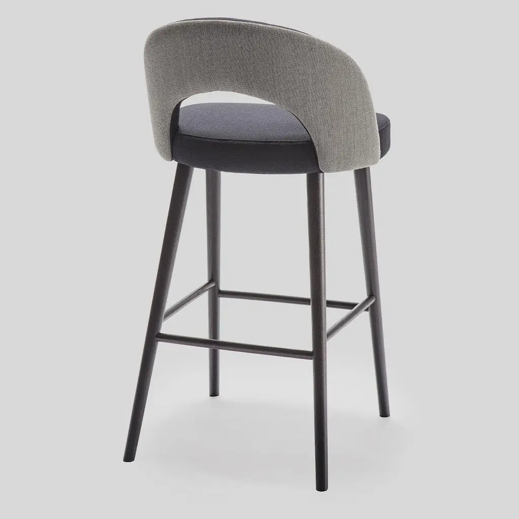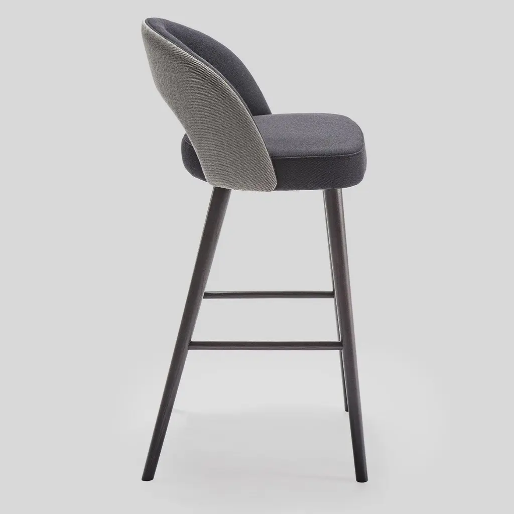 Perfect for pairing with a modern dining room/bar area, this chic stool will infuse elegance into any home. The solid ash wood frame supports an embracing back with a cut-out detail and flows into four tapered legs finished in black. The backrest is covered in light gray fabric on the outside and anthracite along the interior, matching the seat upholstery. Available in selected catalog colors and fabric, the frame is also offered in beechwood.