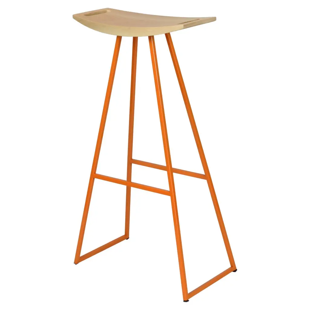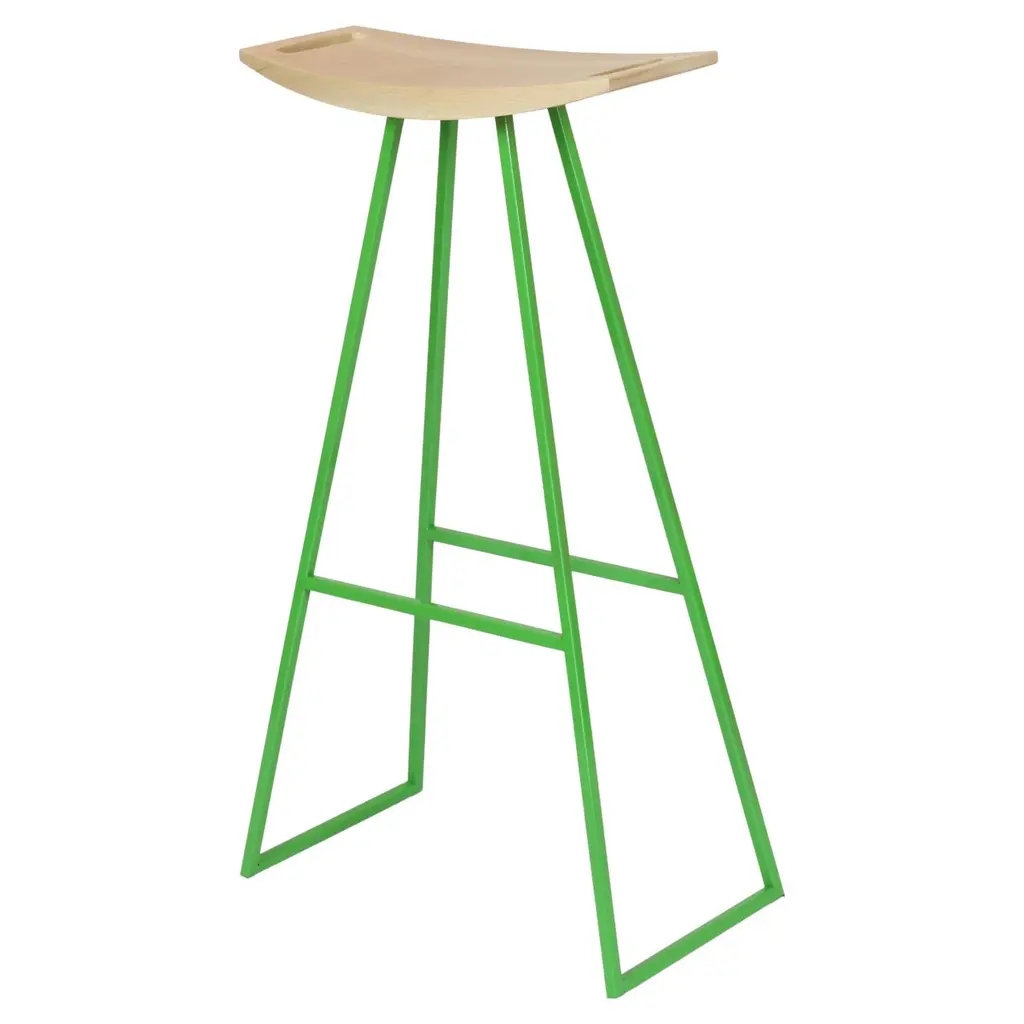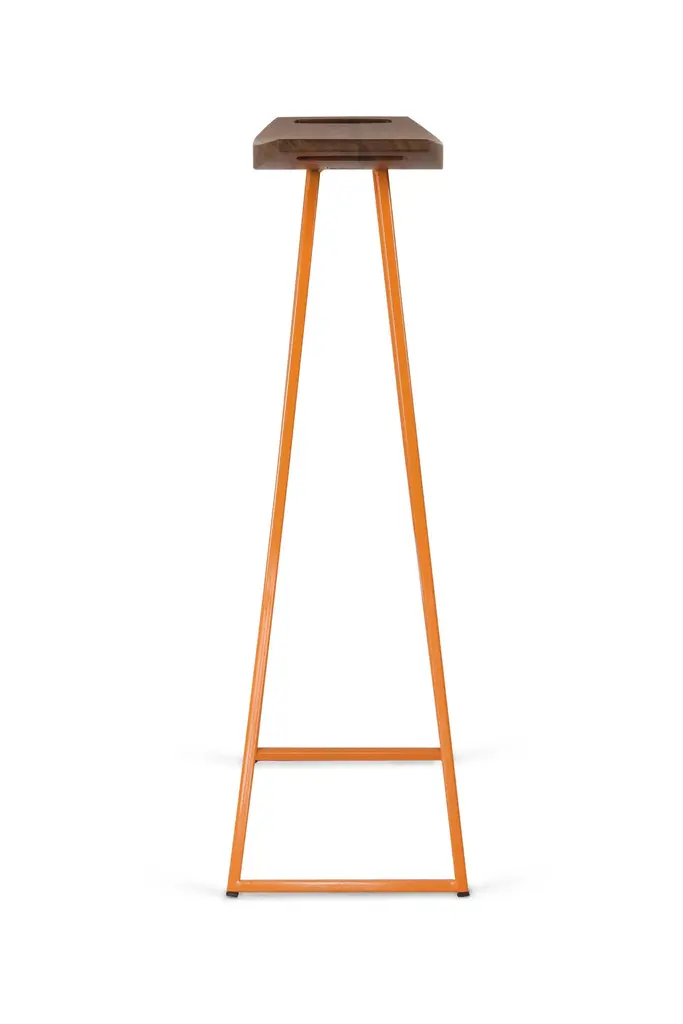 This sleek stool has a thin carved wooden seat that rests on a steel tubing base. The elegant seat is curved for seamless comfort while displaying a stunning intersecting diagonal accent inlay. This eye-catching and durable piece will make any kitchen counter, bar or table stand out. The color options for the powder-coated base are red, green, orange, or yellow. Or if you’re not quite that daring we also offer white and black. The seat comes in either Walnut with Maple inlayed, Maple with a Walnut inlay, solid Walnut or solid Maple. The Roberts is available in table, counter and bar height. Measure:30"H.