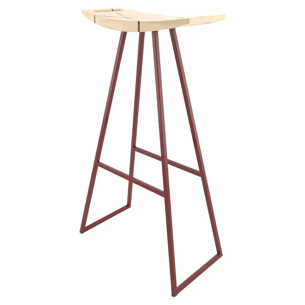 This sleek stool has a thin carved wooden seat that rests on a steel tubing base. The elegant seat is curved for seamless comfort while displaying a stunning intersecting diagonal accent inlay. This eye-catching and durable piece will make any kitchen counter, bar or table stand out. The color options for the powder-coated base are red, green, orange, or yellow. Or if you’re not quite that daring we also offer white and black. The seat comes in either Walnut with Maple inlayed, Maple with a Walnut inlay, solid Walnut or solid Maple. The Roberts is available in table, counter and bar height. Measure: 30"H.