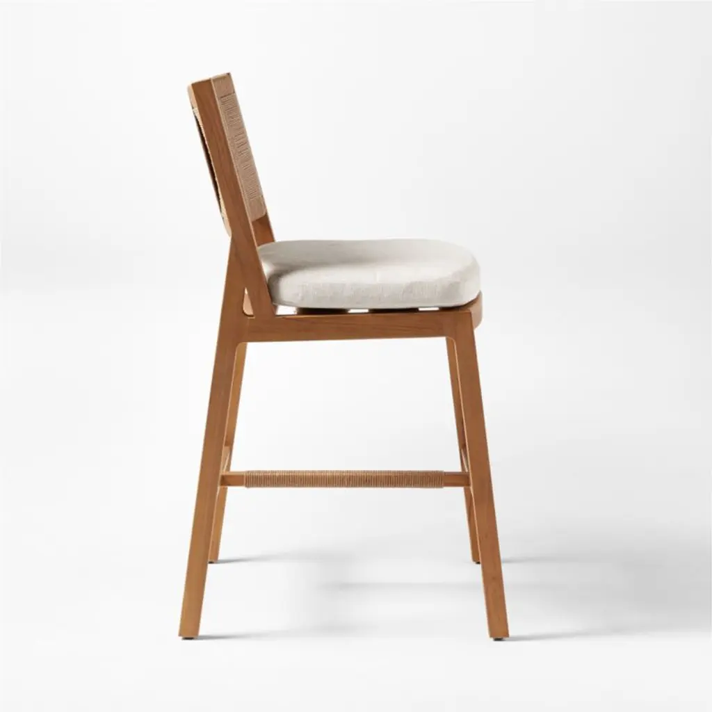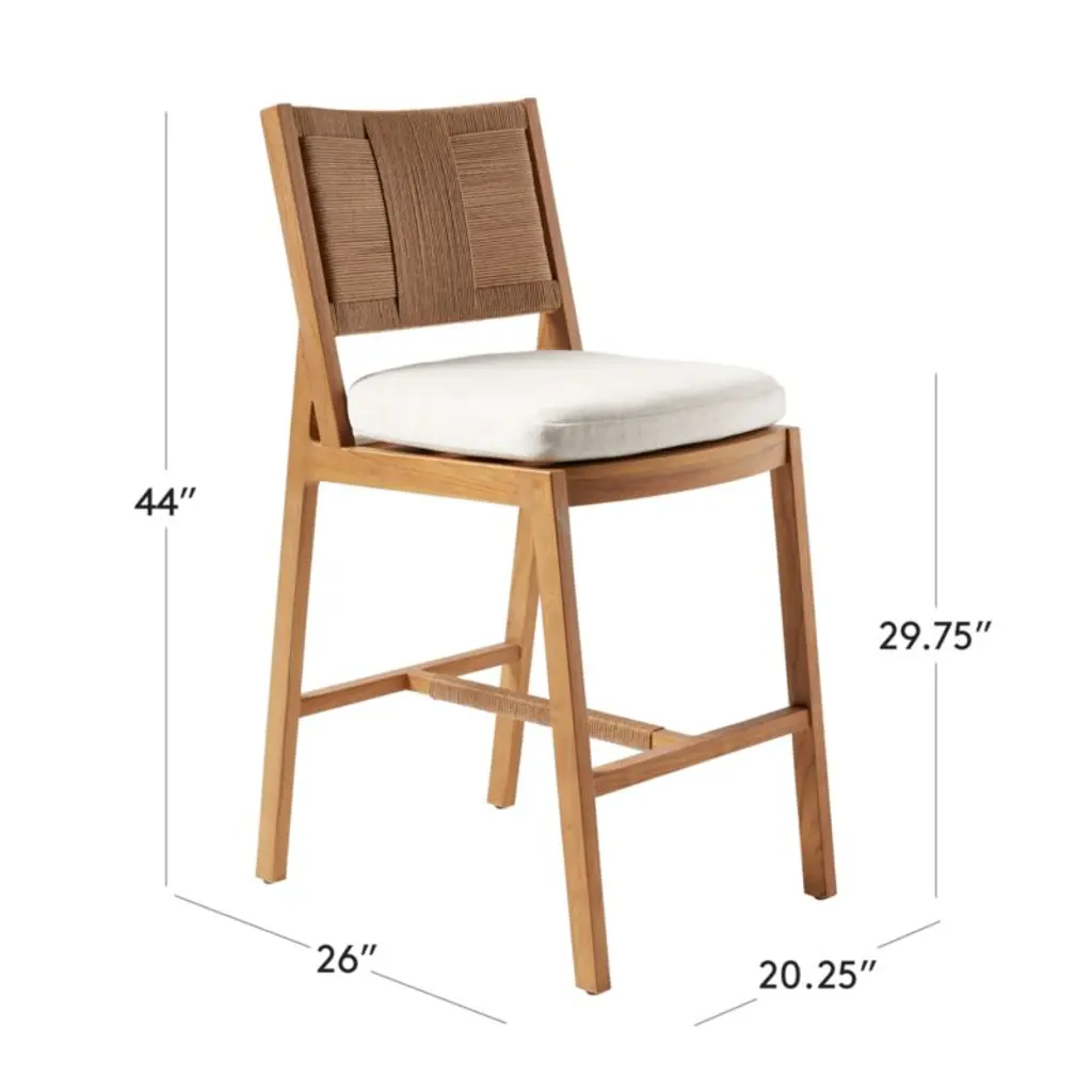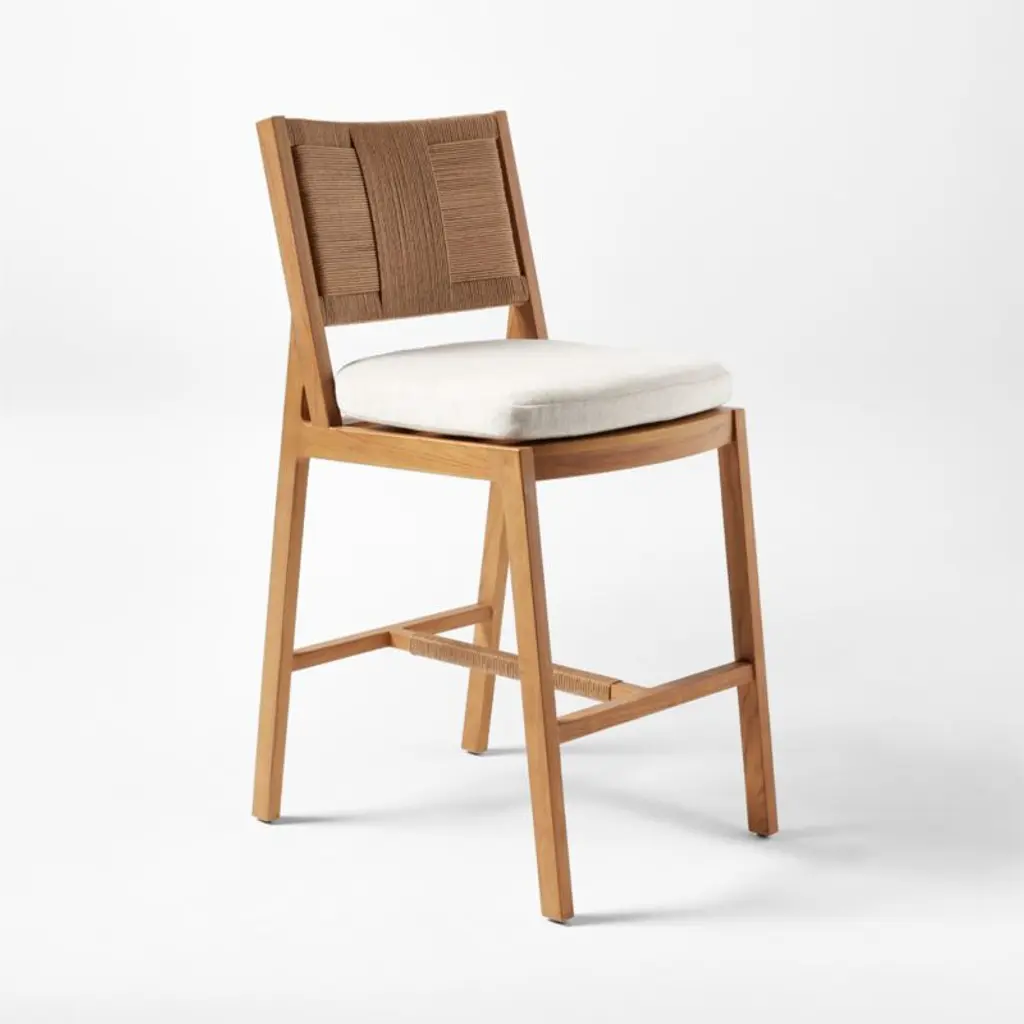 Harmonious tones, clean angles and a vintage-style weave make Roc a highlight of the Ross Cassidy outdoor collection. "The combination of teak and woven fibers is so French," Cassidy says. Outdoor stool features an unfinished natural teak frame that's crafted from wood certified sustainable by the Forest Stewardship Council , with a woven all-weather rattan back rest. The pièce de resistance? A cushion upholstered in natural Sunbrella performance fabric for worry-free, stress-less cleaning. CB2 exclusive.